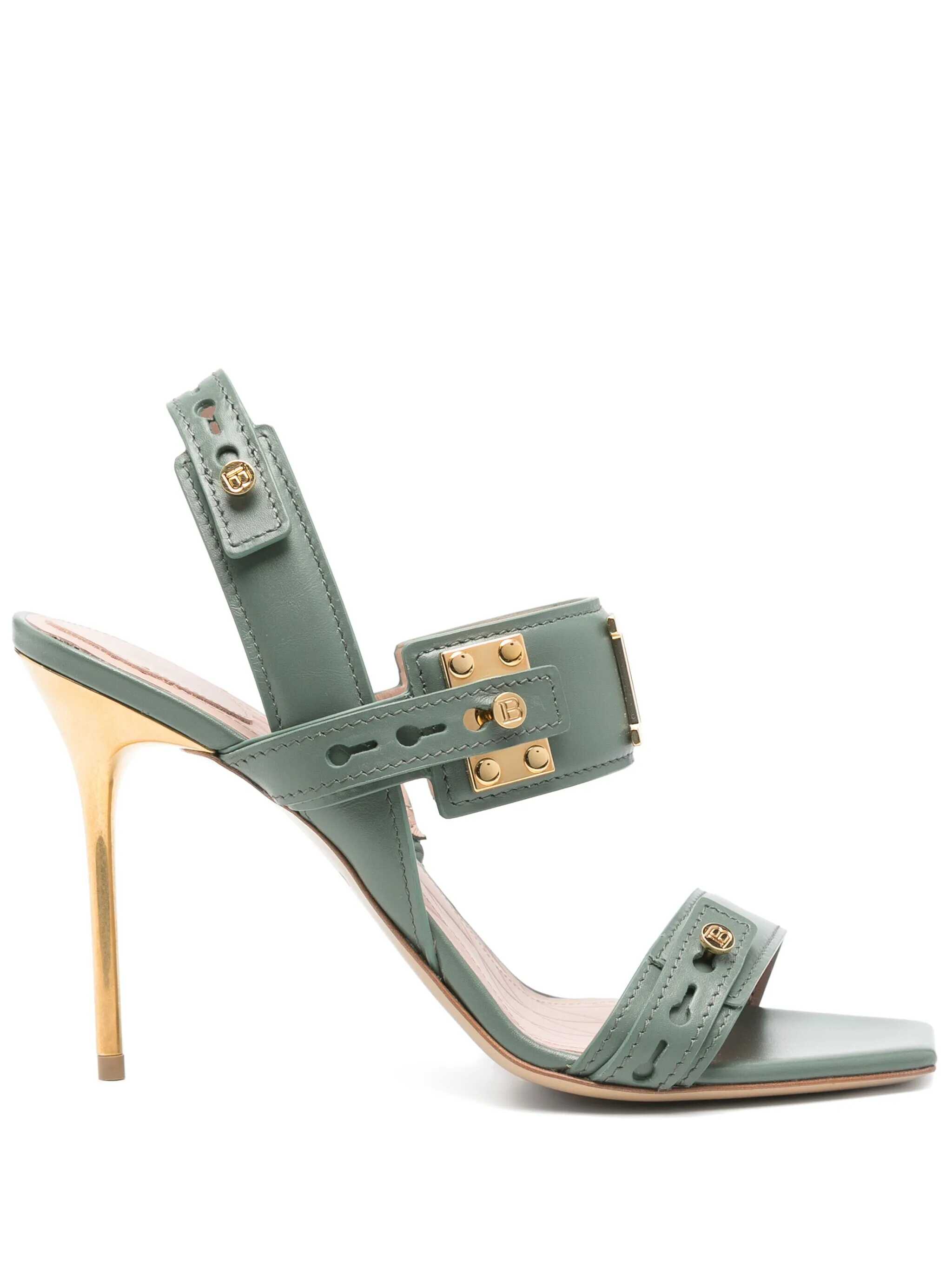 Leather sandal Green color Square open toe Side elastic Gold-colored metal Balmain buckle Leather sole Heel height 10.5cm