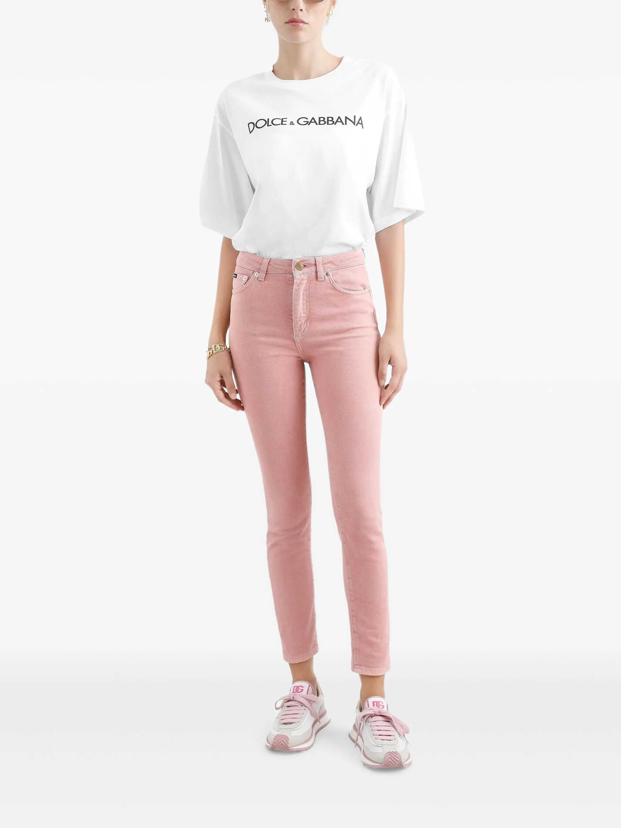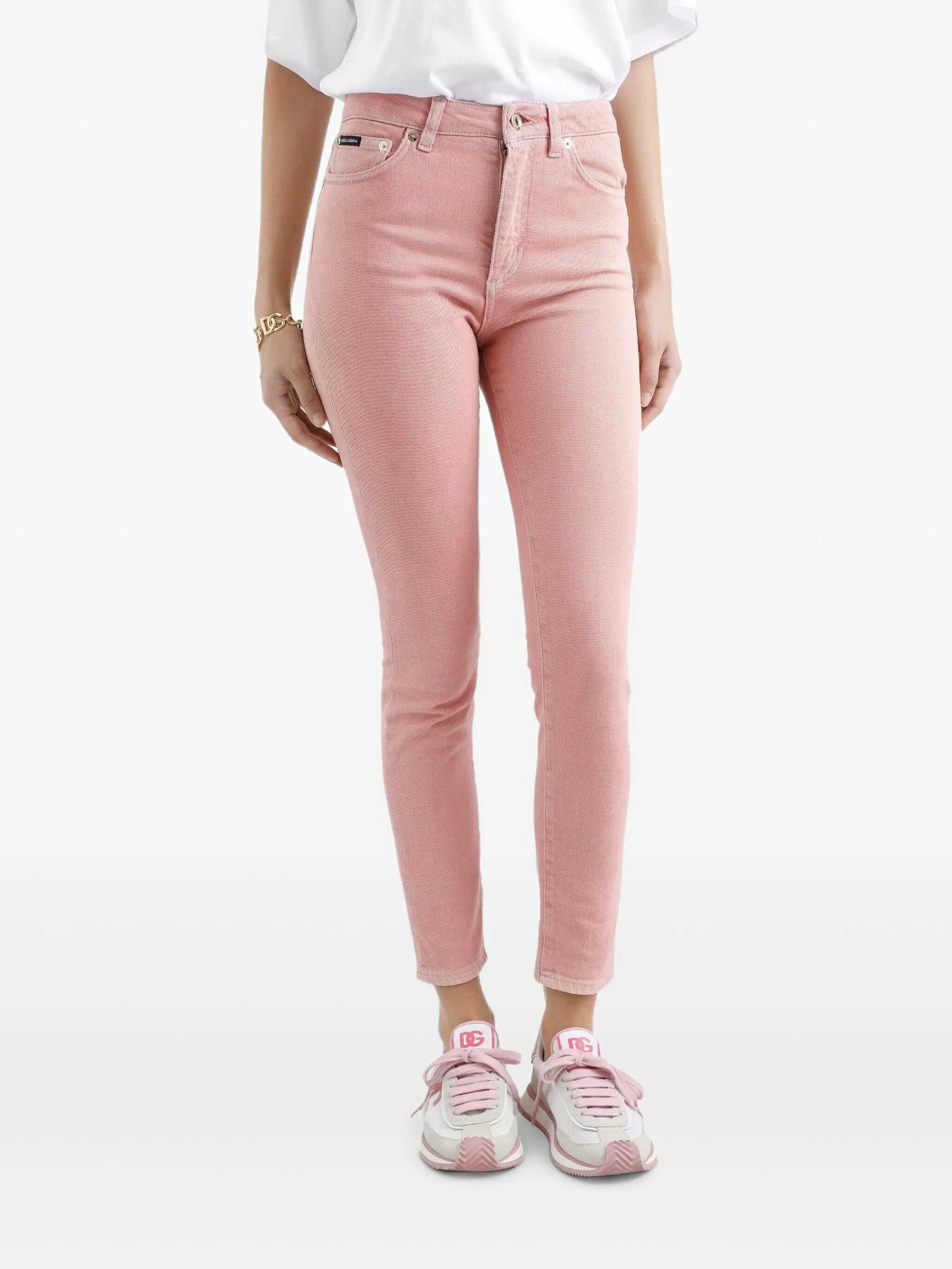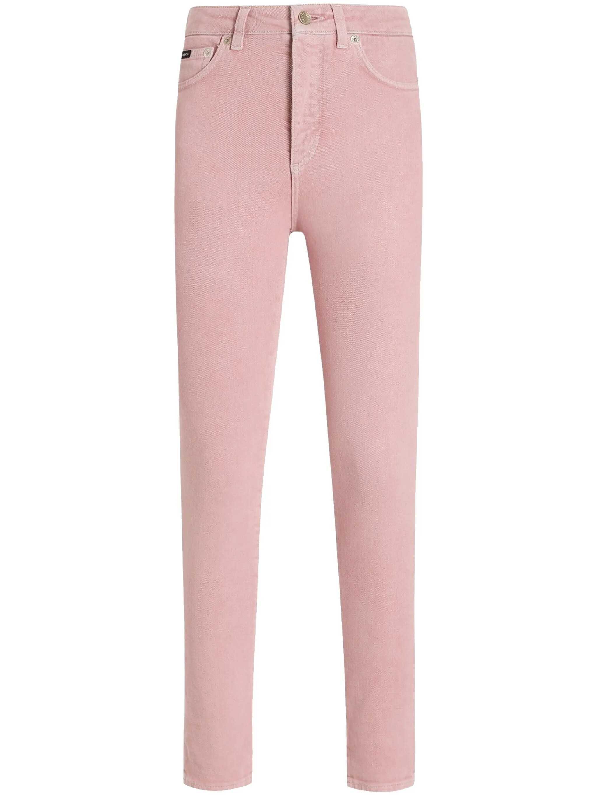 Garment-dyed stretch cotton denim jeans with high waist, zip and button closure, five pockets, leather and metal logo plaque at the back.