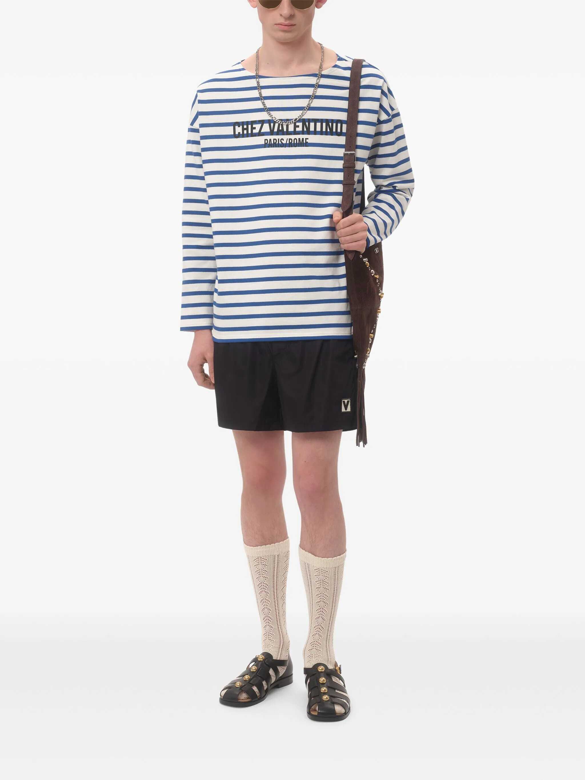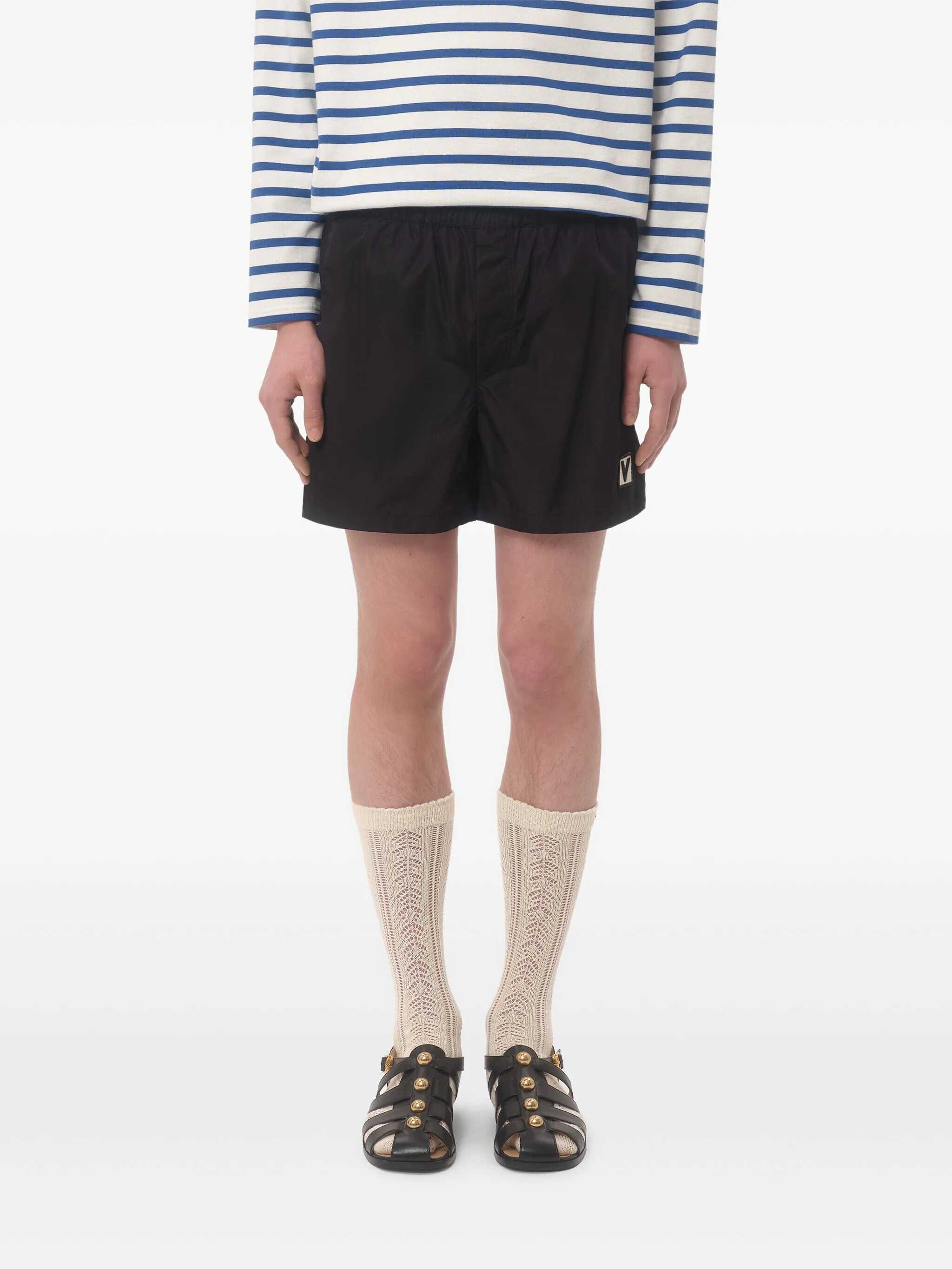 Nylon swimsuit with front 'Chez Valentino' patch, adjustable drawstring elastic at the waist, pockets, trompe l'oeil flap, inner mesh briefs