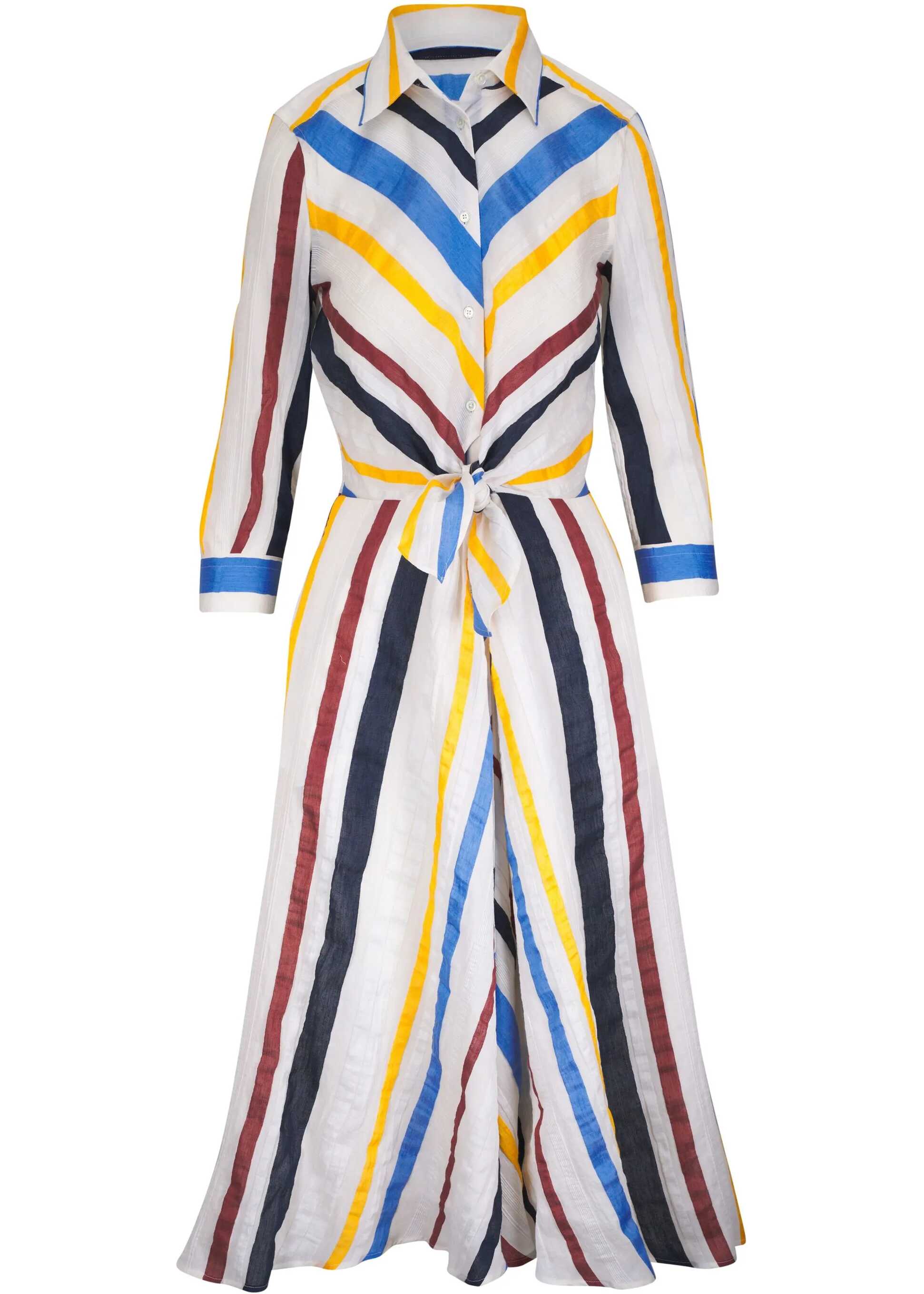 The Sara Roka long shirt Dress is a garment with a timeless and refined charm. The classic collar and the front closure with buttons give a clean and sophisticated line, while the knot detail on the front adds a touch of originality and femininity, elegantly highlighting the waist. The multicolored striped pattern is the real strong point of this dress, which plays with different shades to create a dynamic and lively, but always classy effect. The length of the dress, combined with the shirt design, offers a fluid and comfortable silhouette, perfect for wearing on different occasions, from day to night.