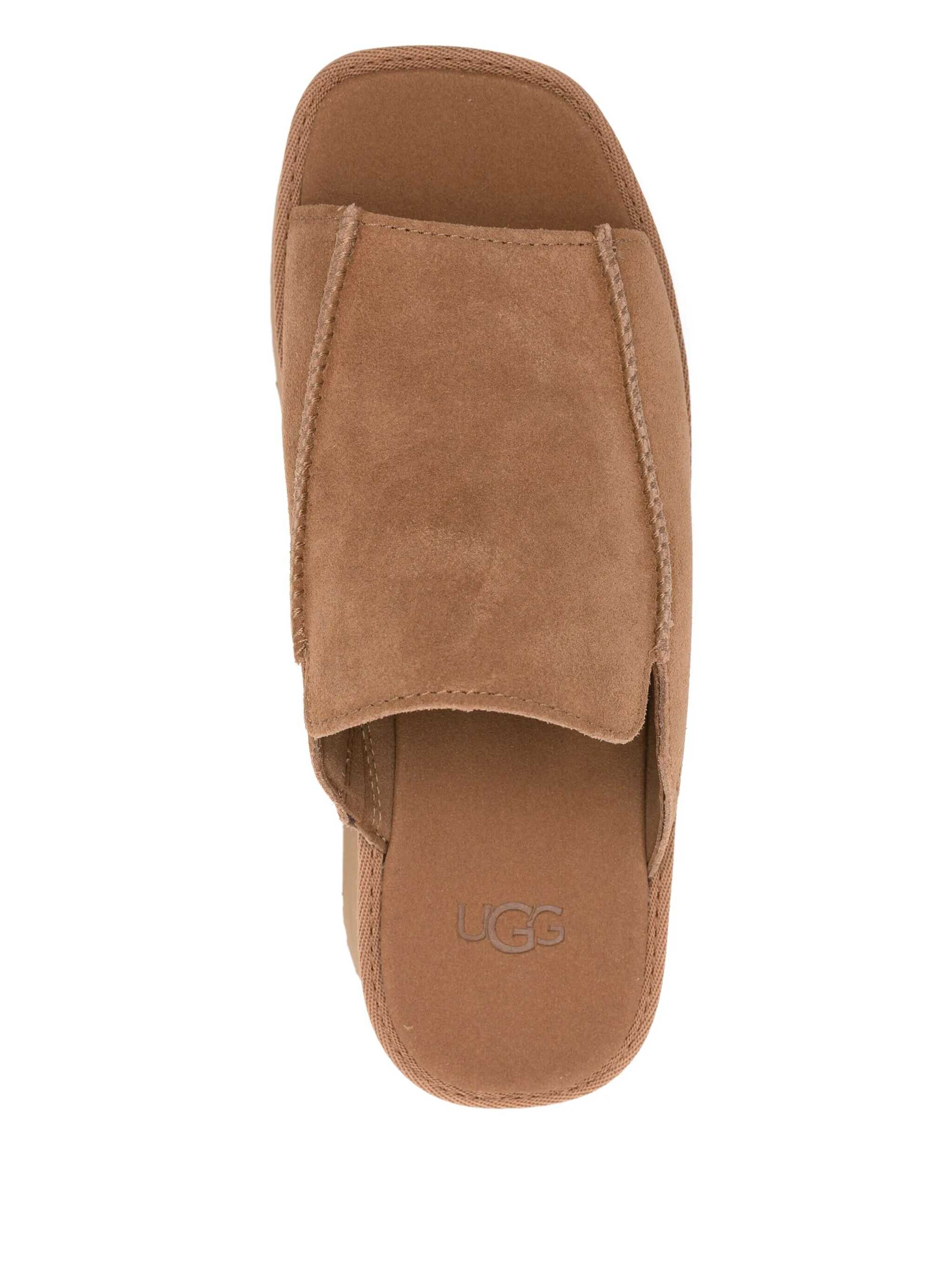 `Ugg sandal features a slip-on upper in fine suede and a lightweight platform in sugar cane EVA. Hidden elasticized panels enhance flexibility, while the microfiber lining lets the foot breathe.`