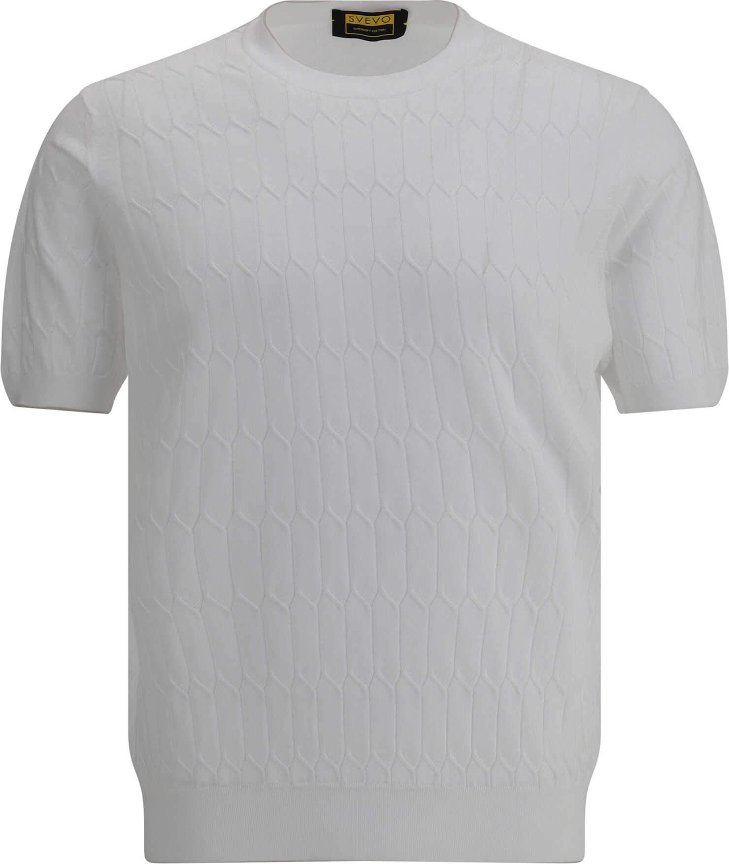 The cotton T-shirt by Svevo is a garment with a modern and sophisticated design, characterized by a ribbed crew neck that adds a touch of discreet elegance. The knitted design features geometric details, creating an interesting and contemporary visual effect. The ribbed hem completes the look, giving a delicate but defined structure. Perfect for those looking for a casual T-shirt with an accent of originality and style, suitable for both everyday looks and more elegant combinations.