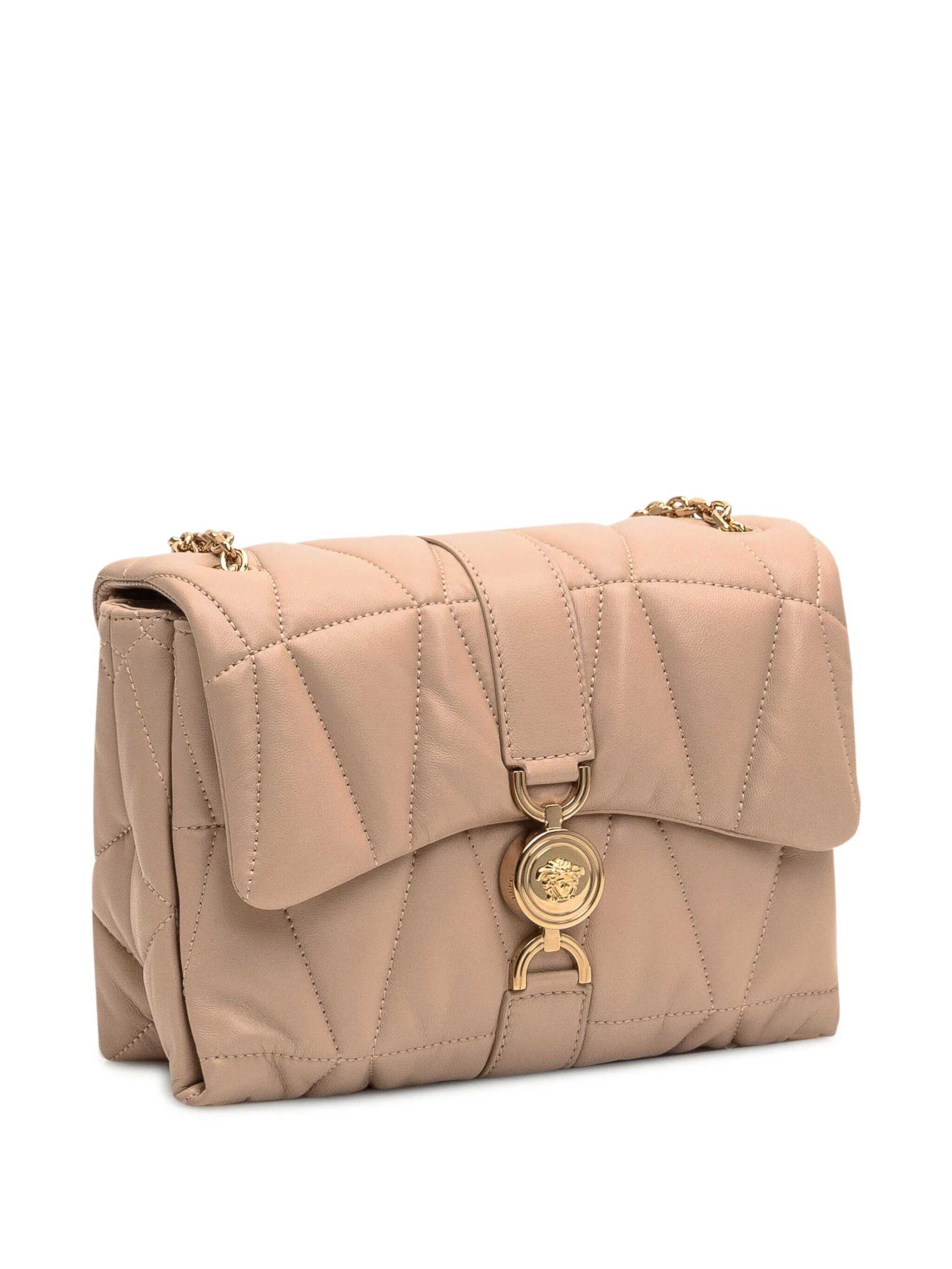Pink bag made of lambskin leather. Medusa head motif. Casement at top with magnetic closure. Chain shoulder strap. Divided interior compartment. Width:22Height:16.5 Depth:8