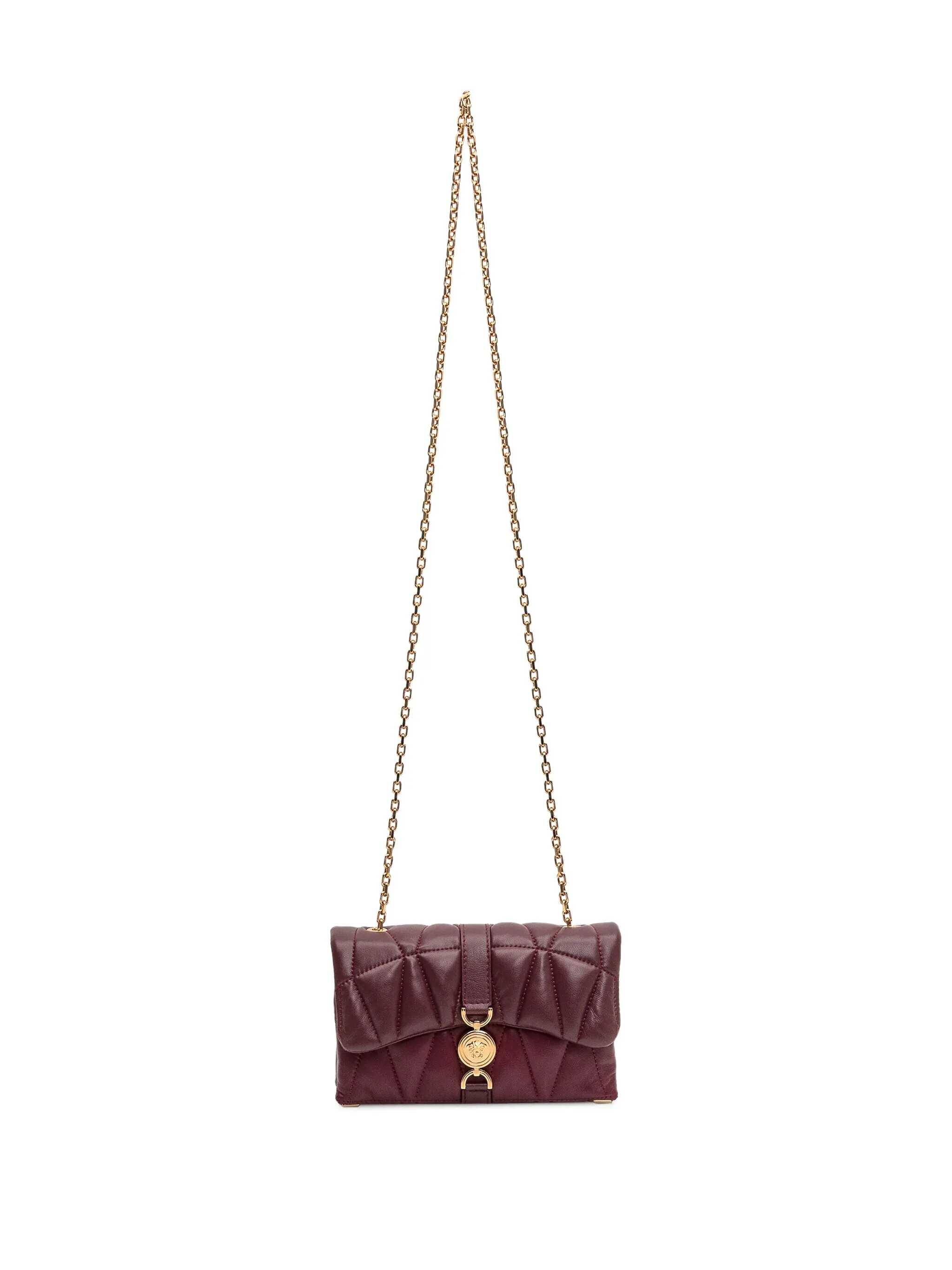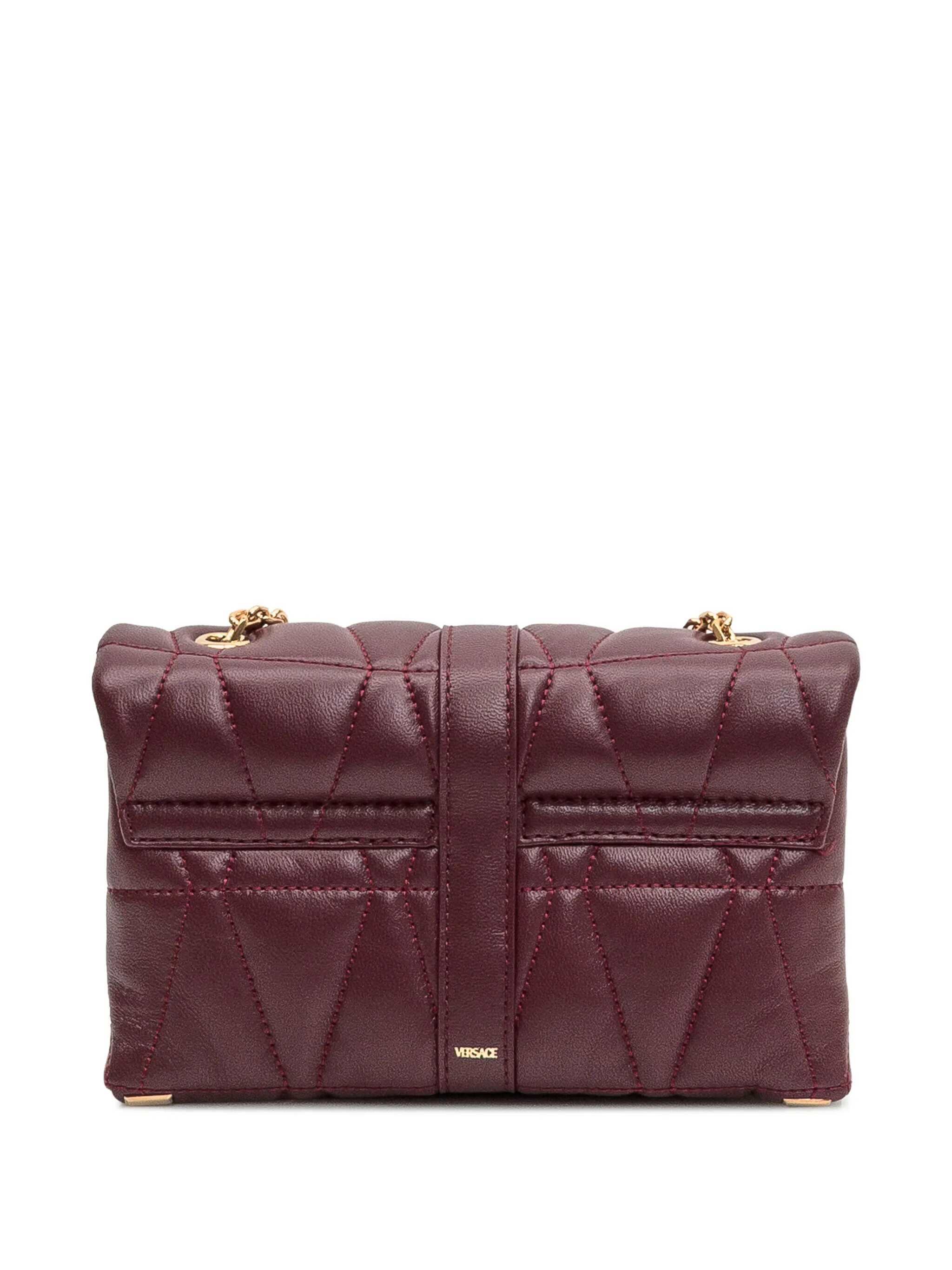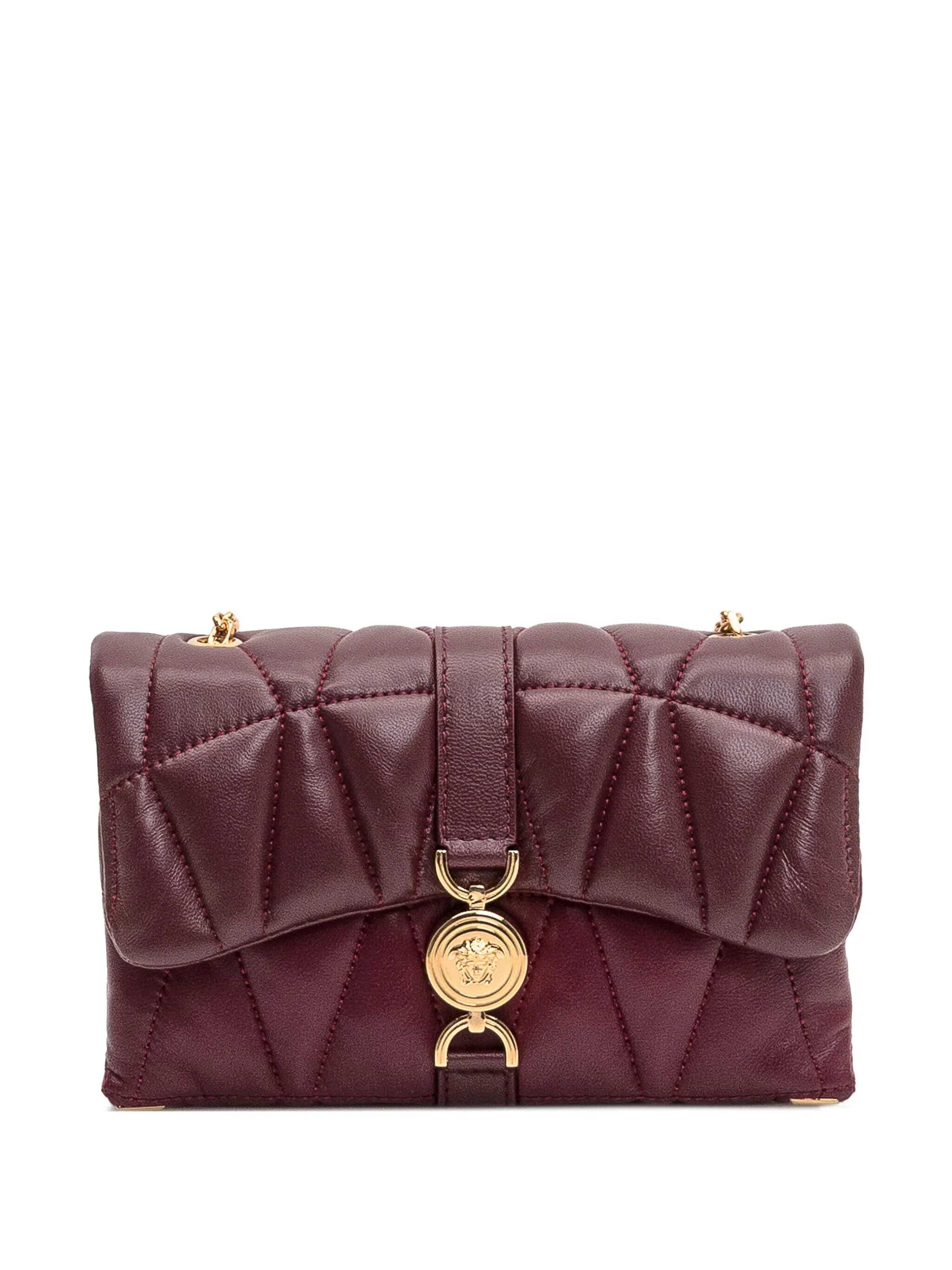Red bag made of lambskin leather. Medusa head motif. Casement at top with magnetic closure. Chain shoulder strap. Divided interior compartment. Width:19Height:13Depth:6