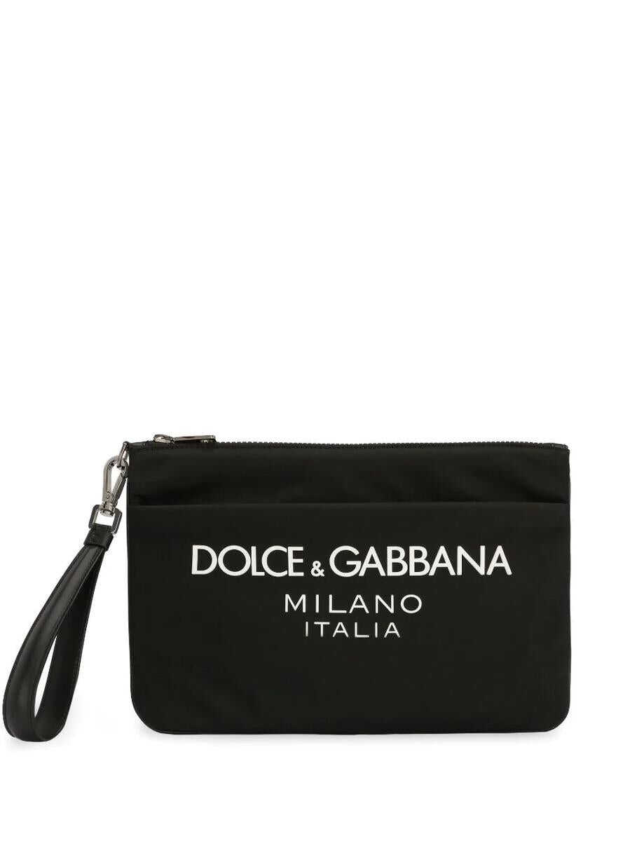Black, front logo print, top zip closure, wrist strap, front zip pockets and main compartment.
