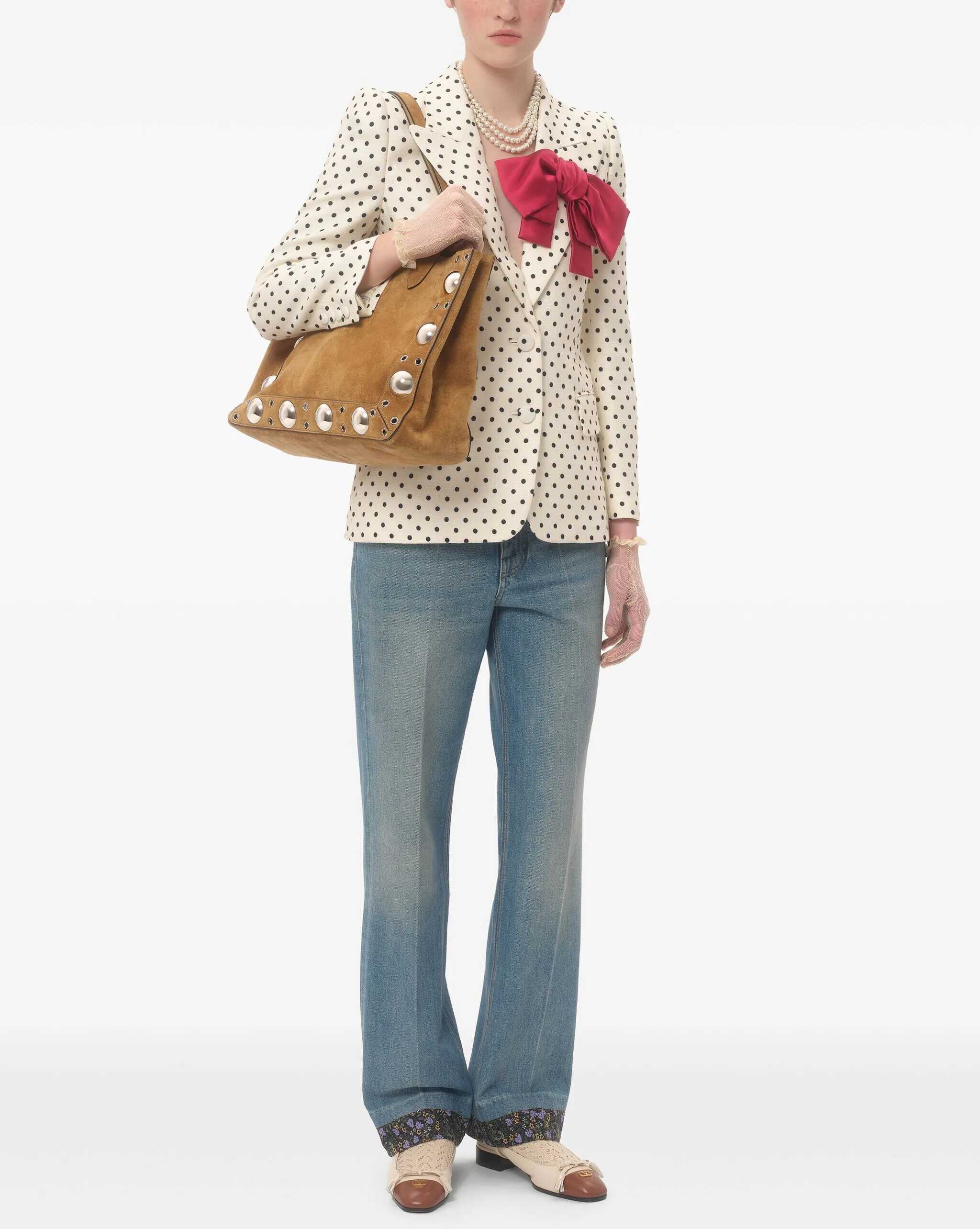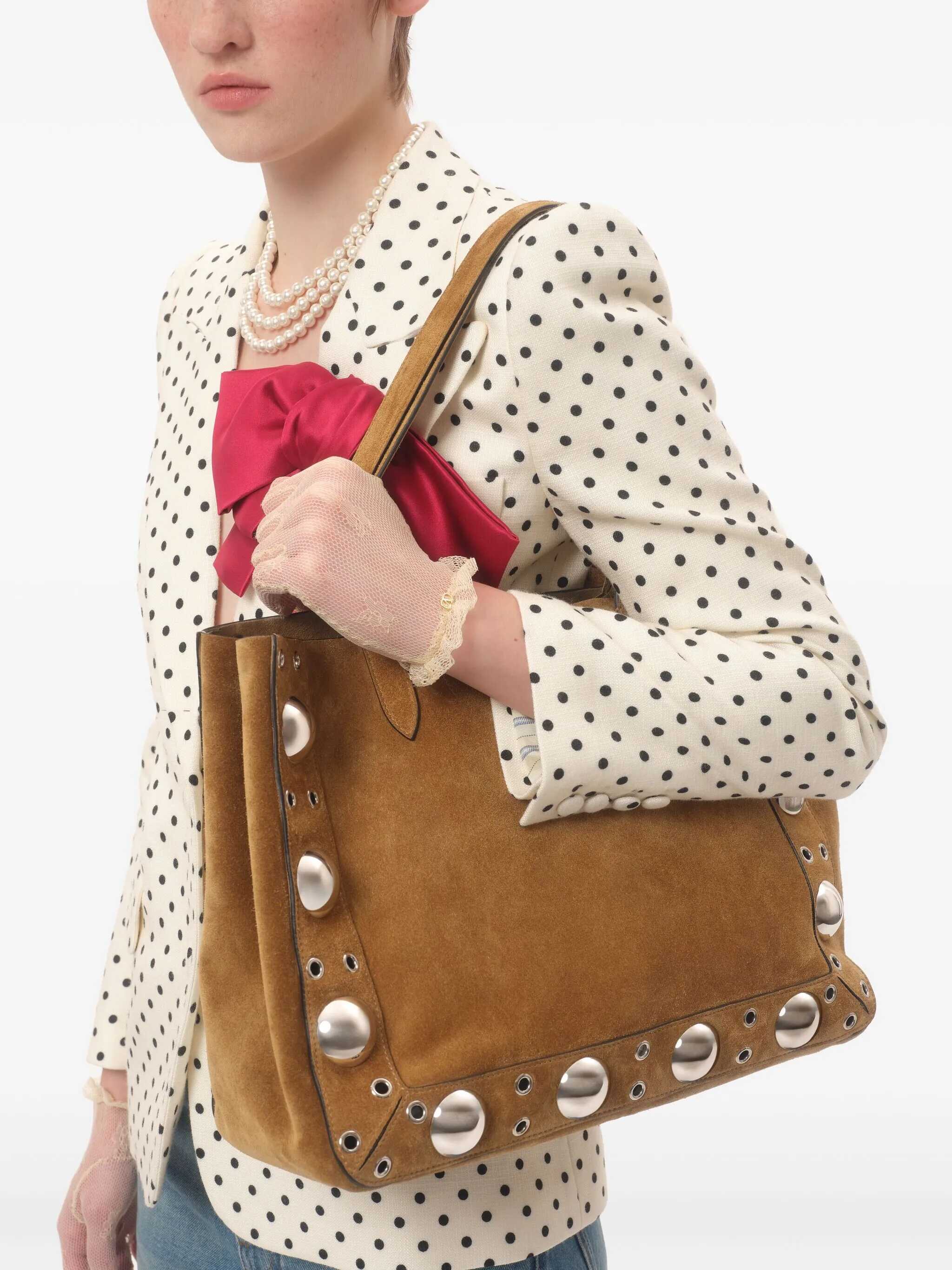 Valentino Garavani's Nellcote Tote Bag is crafted from suede with a sleek and practical design. Featuring two top handles, it sports an iconic VLogo plaque on the front and ball studs on both the front and back. Inside, it offers a removable pouch and a single compartment for convenient organization. A perfect balance of luxury and functionality, ideal for any occasion.