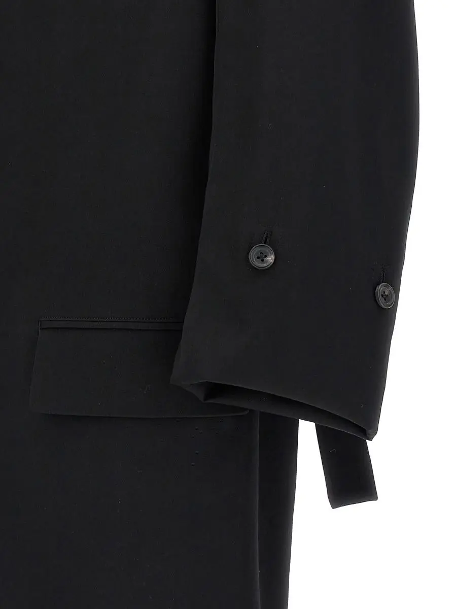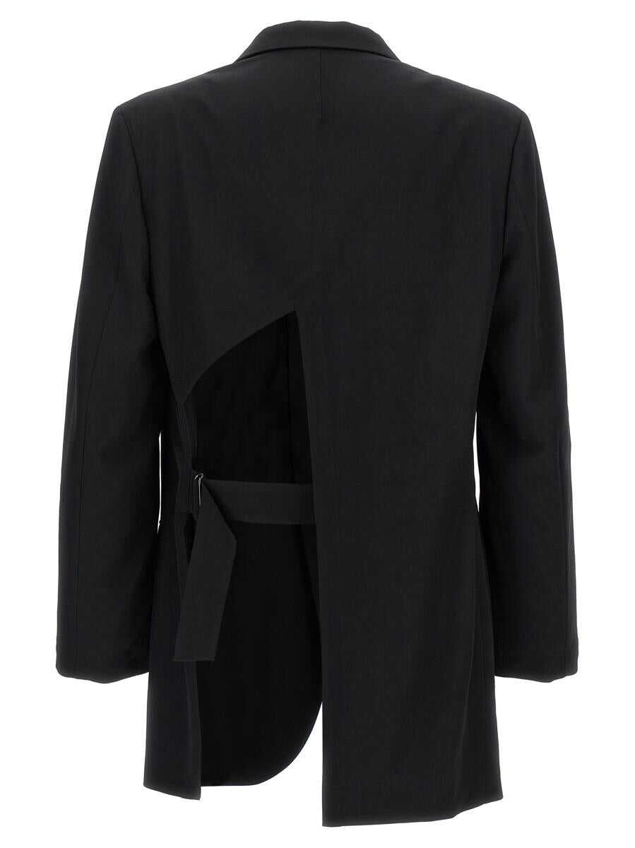 'Back Opening' single-breasted wool blazer with button closure, mirror lapels, long sleeves, pockets, padded shoulders, back with cut-out details and adjustable strap