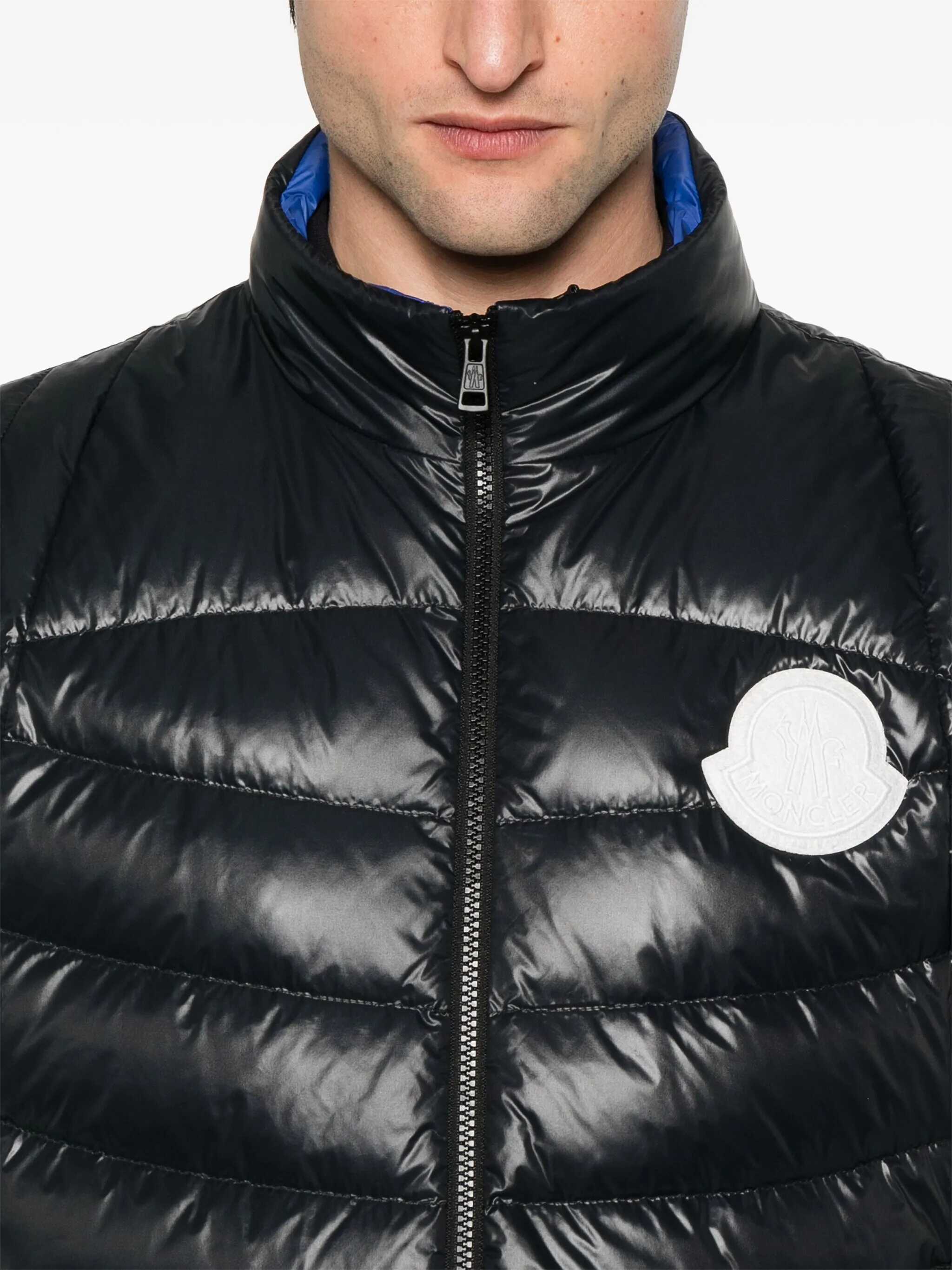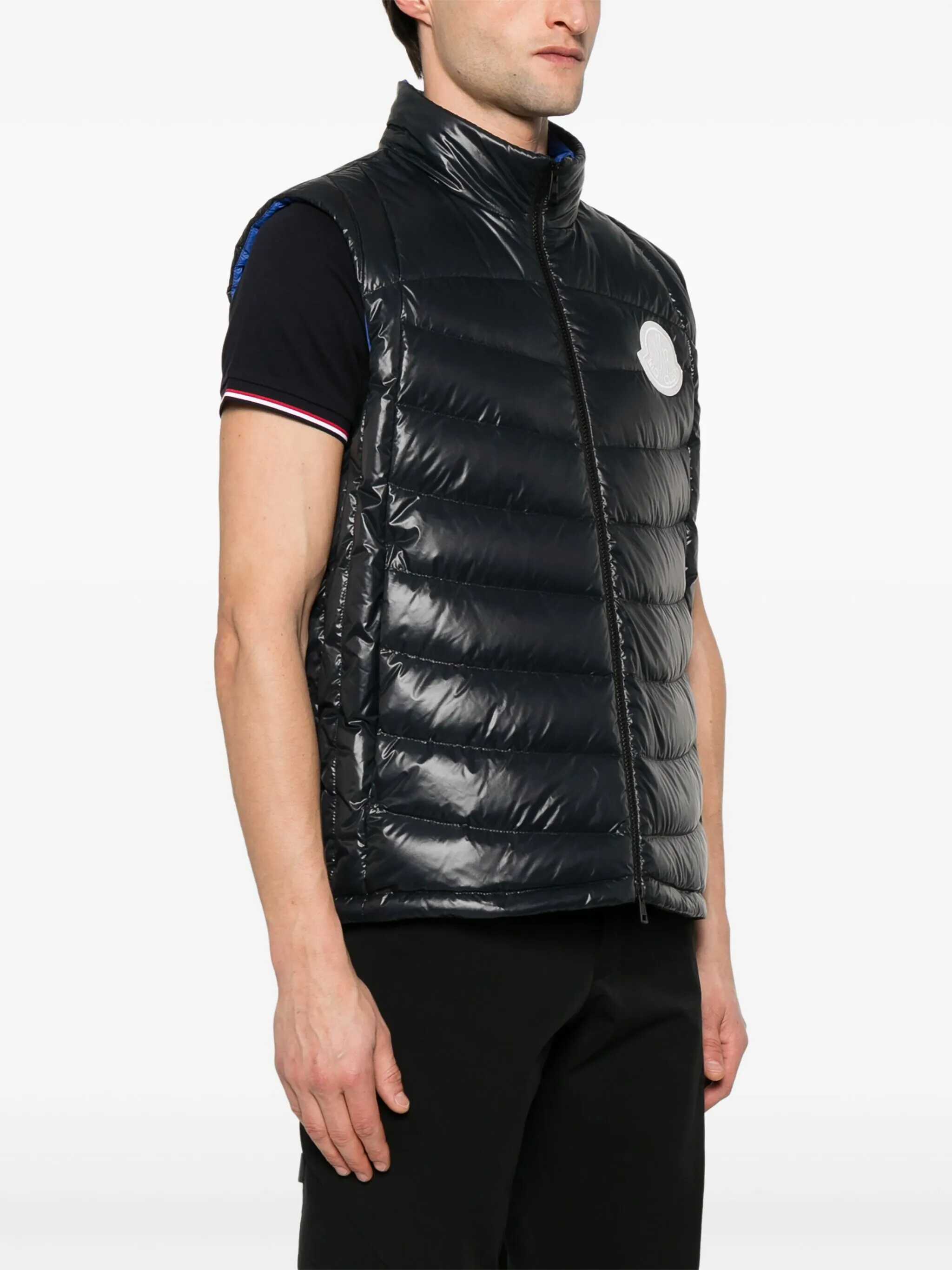 'Menelao' super laqué nylon vest slightly padded with feather, contrast maxi felt logo patch on the front, high neck with removable hood, zip closure, pockets, drawstring on the hem