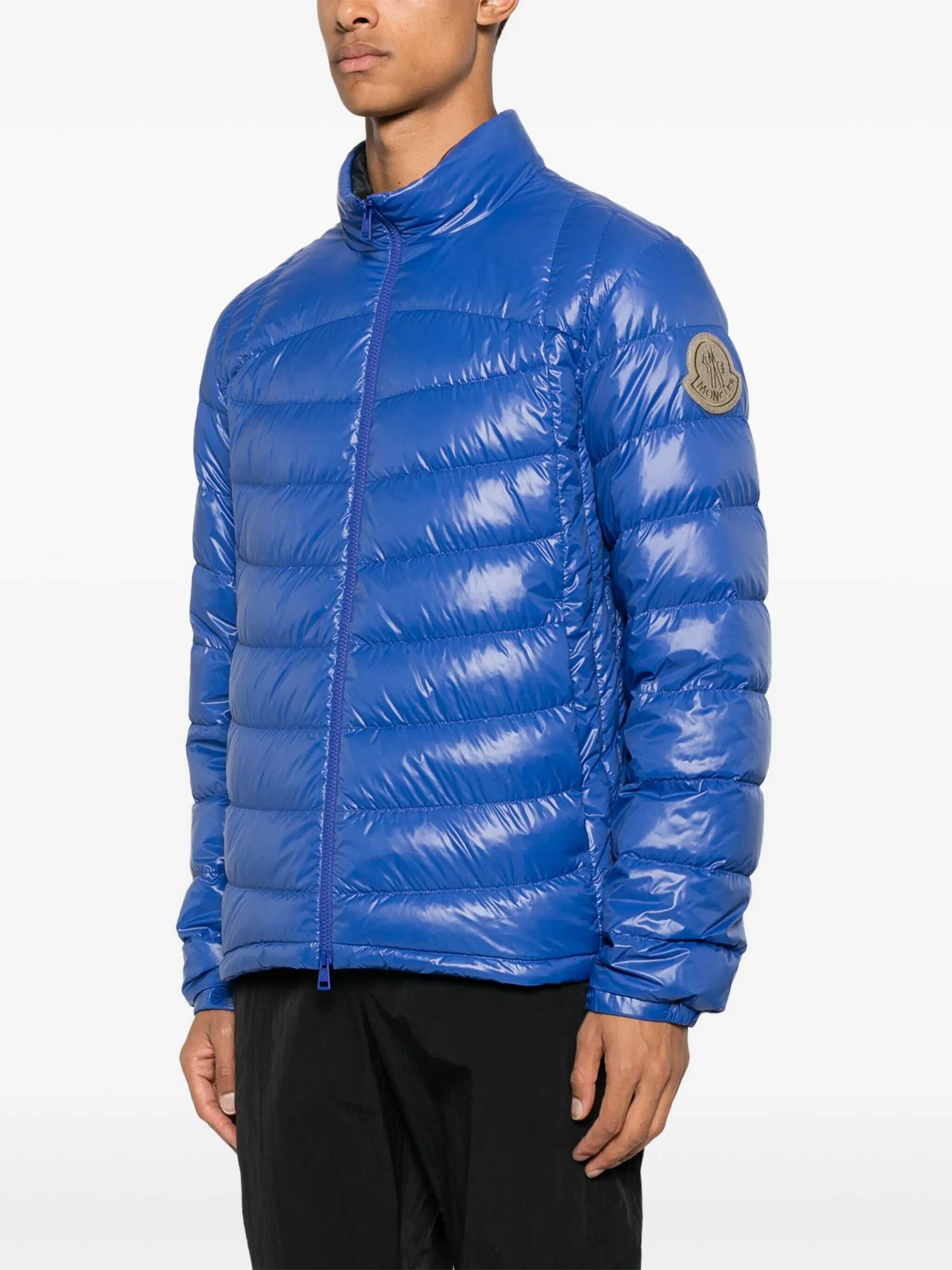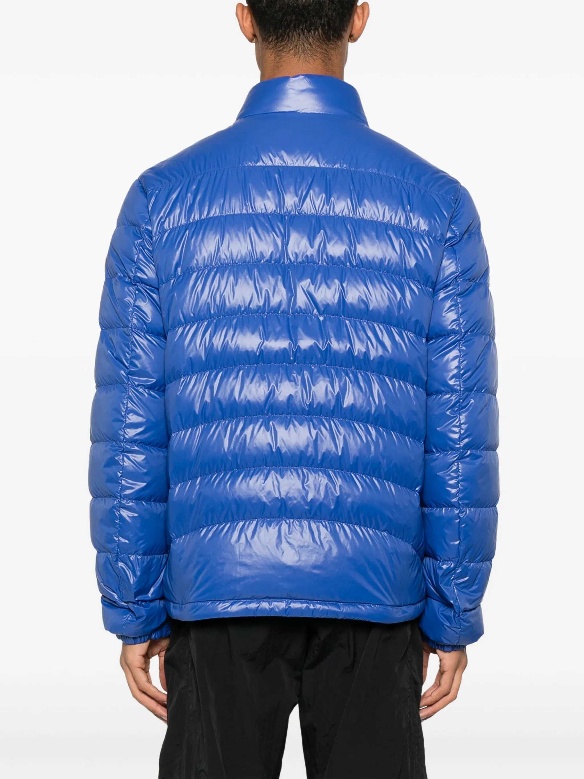 'Galeso' super laqué nylon jacket slightly padded with feather, high neck with removable hood, zip closure, pockets, long sleeves with elastic cuffs and maxi contrasting felt logo patch, drawstring on the hem