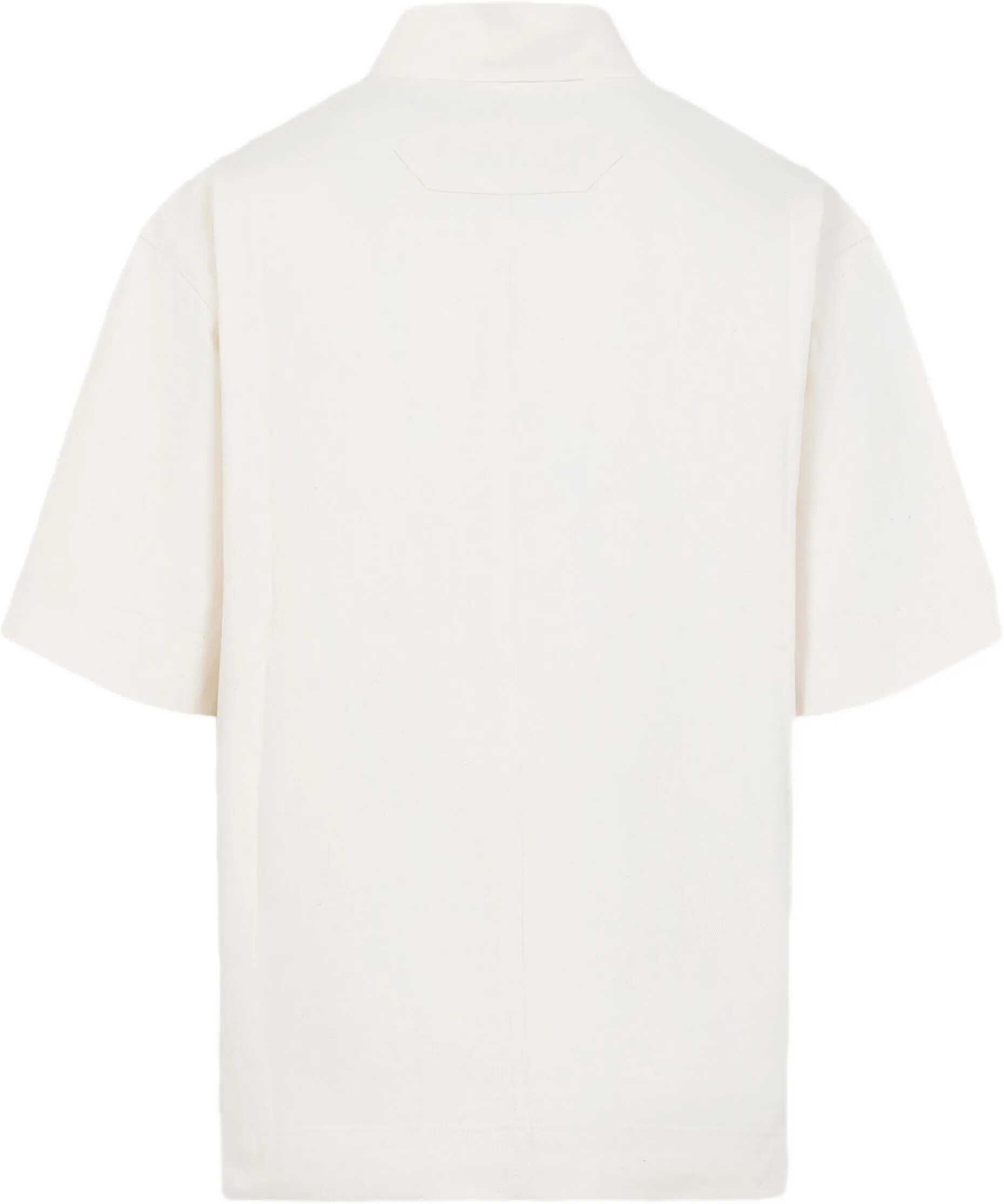 Aloe short-sleeve shirt in cream-colored cotton denim. It features a pointed collar, front button closure with a black "J"-shaped first buttonhole, a patch pocket on the chest with a tonal embroidered logo, a pocket-shaped seam on the opposite side of the chest, and an embroidered patch on the back. Boxy fit.
