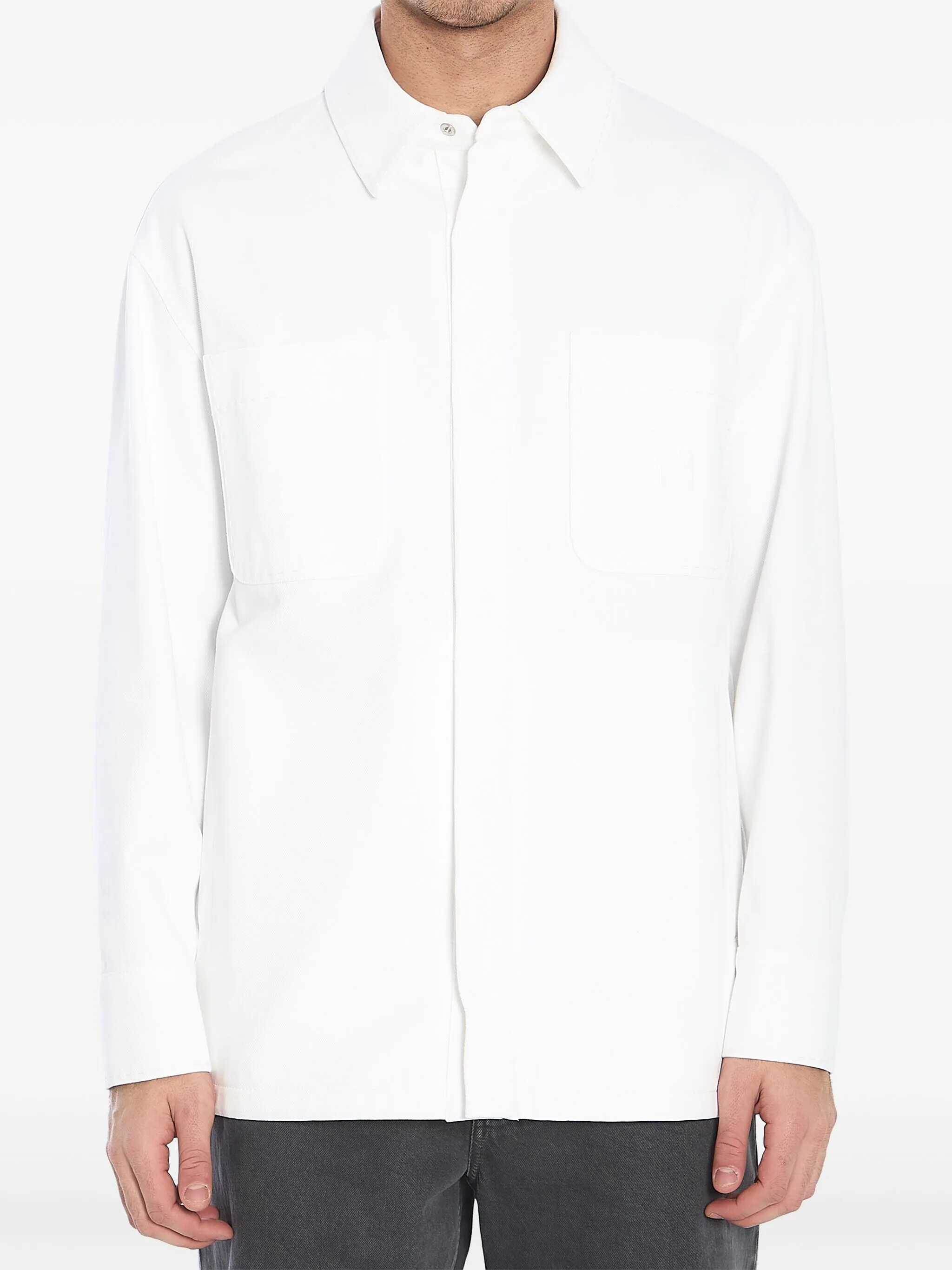 White cotton denim jacket with tonal Selleria stitching. It features a pointed collar, dropped shoulders, front snap button closure, two patch pockets on the chest, an FF logo embroidered on the left front pocket, two side pockets, buttoned cuffs, and two internal pockets.