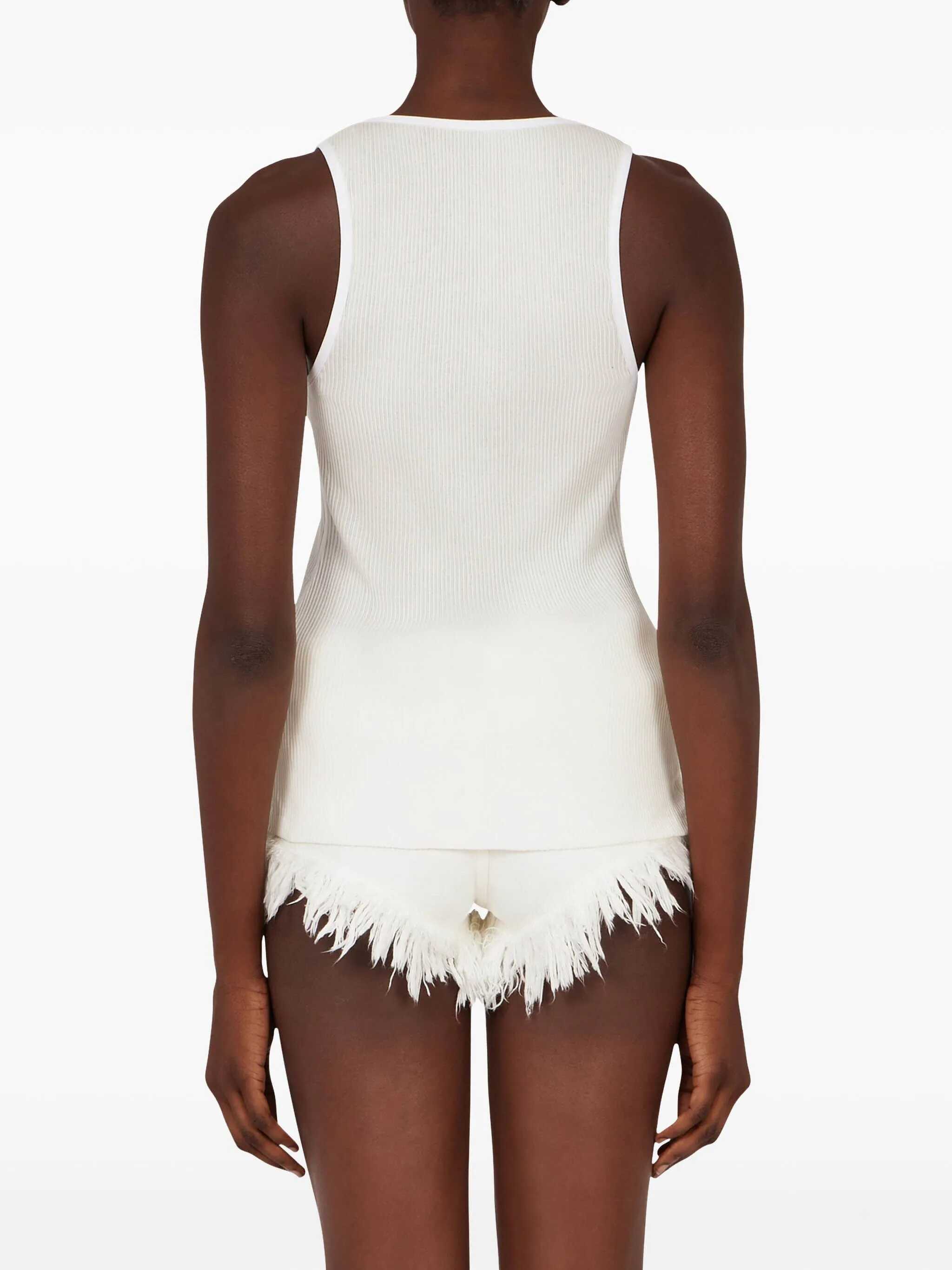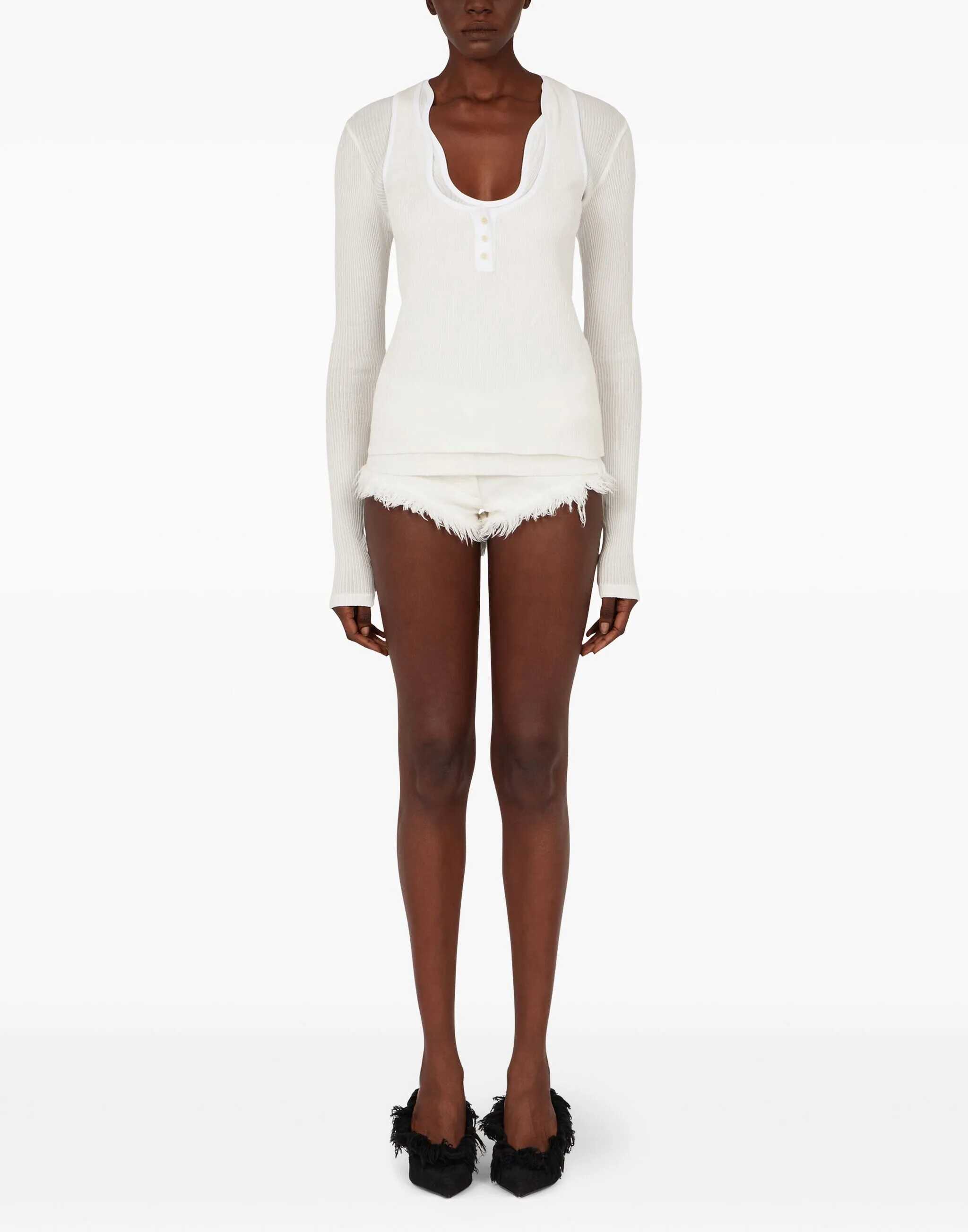 The Ferragamo Top is an elegant and sophisticated piece, featuring a round neckline that gives a clean and refined line. The three-button front closure adds a distinctive detail, while the ribbed design provides a subtle texture and a tight fit that enhances the figure. The iconic brand logo, positioned on the front, represents a touch of discreet but recognizable luxury. Crafted from high-quality materials, this top is perfect for an elegant and versatile look, ideal for both more formal occasions and casual-chic outfits.