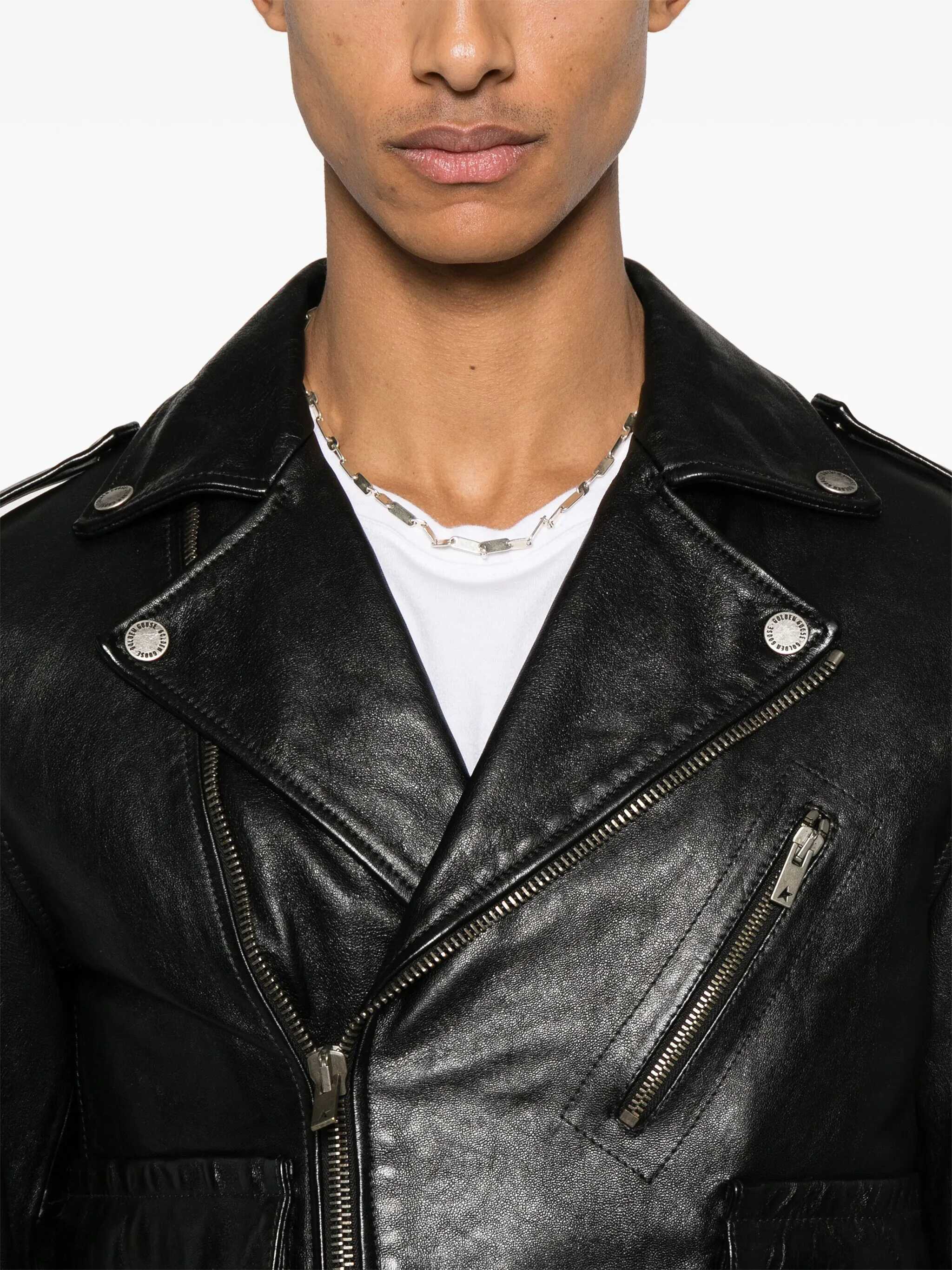 Golden Goose Deluxe Brand biker jacket crafted in black nappa leather. Featuring a biker collar, off-center zip closure, multiple pockets, epaulets on the shoulders, long sleeves with zippers at the cuffs, a zip detail at the center back and a quilted interior. The design is completed with the brand’s signature two half-metal stars on the back.