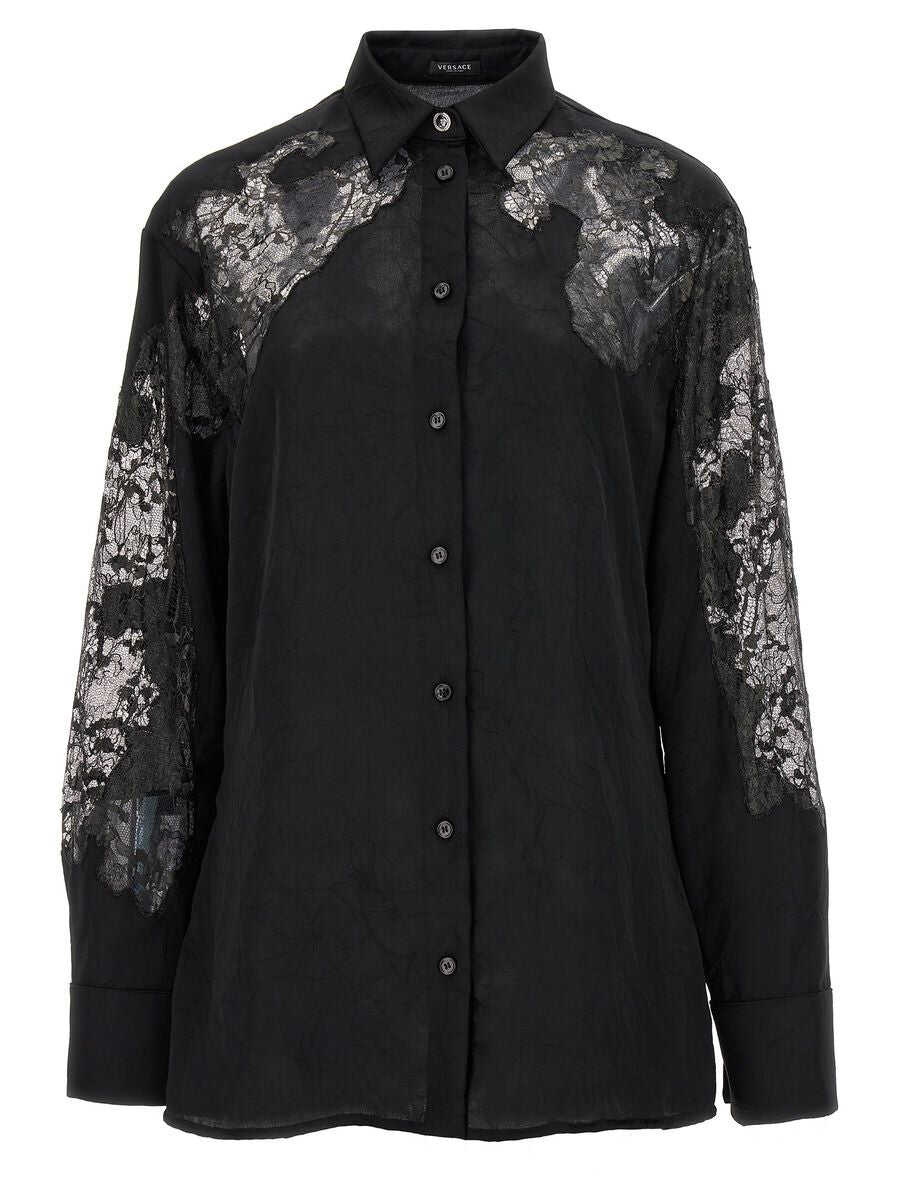 Recycled-effect satin shirt with lace inserts, long cuffed sleeves and a button closure
