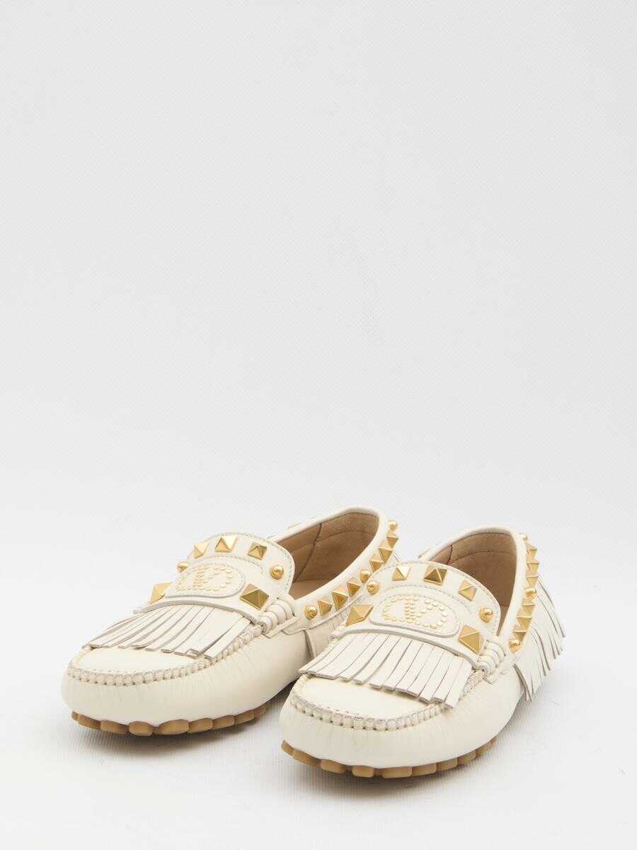 Driver Pleaster Caster loafers in white leather with fringes. They feature a leather patch with VLogo Signature detail, adorned with metal rivets in a brass finish, studs, and metal cabochons with a brass finish. Leather sole with injected rubber. Dust bag included. Any imperfections in the leather should not be considered manufacturing defects but rather a characteristic of the material.