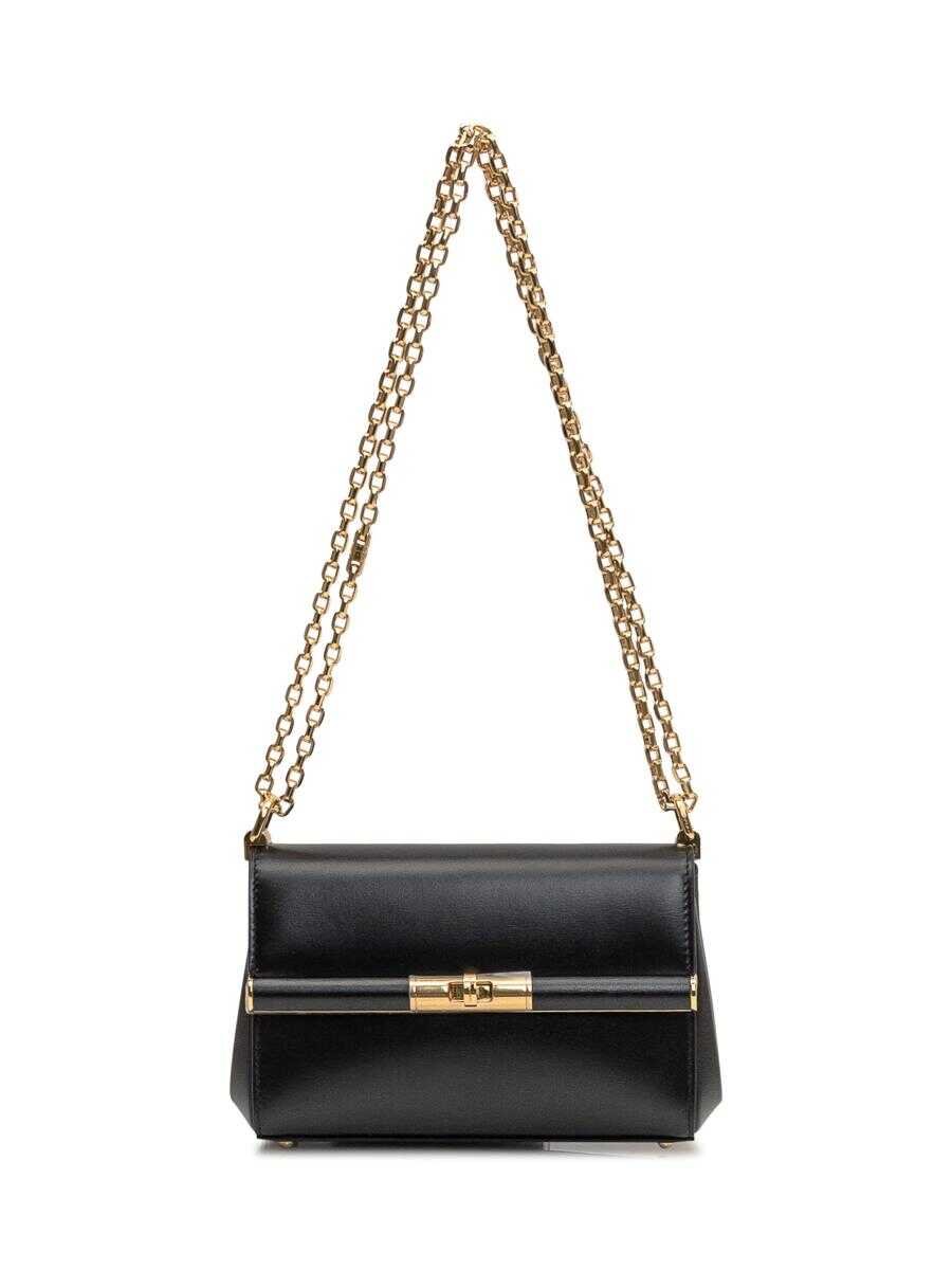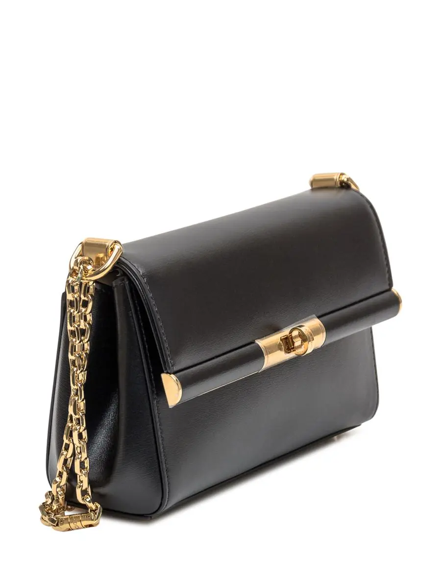 Black bag made of palmellato leather. Over-the-shoulder model. With patch pocket. With front logo. Metal swivel flap closure with metal mechanism. Rectangular shape. Metal mesh shoulder strap. Width:18 Height:12 Depth:7