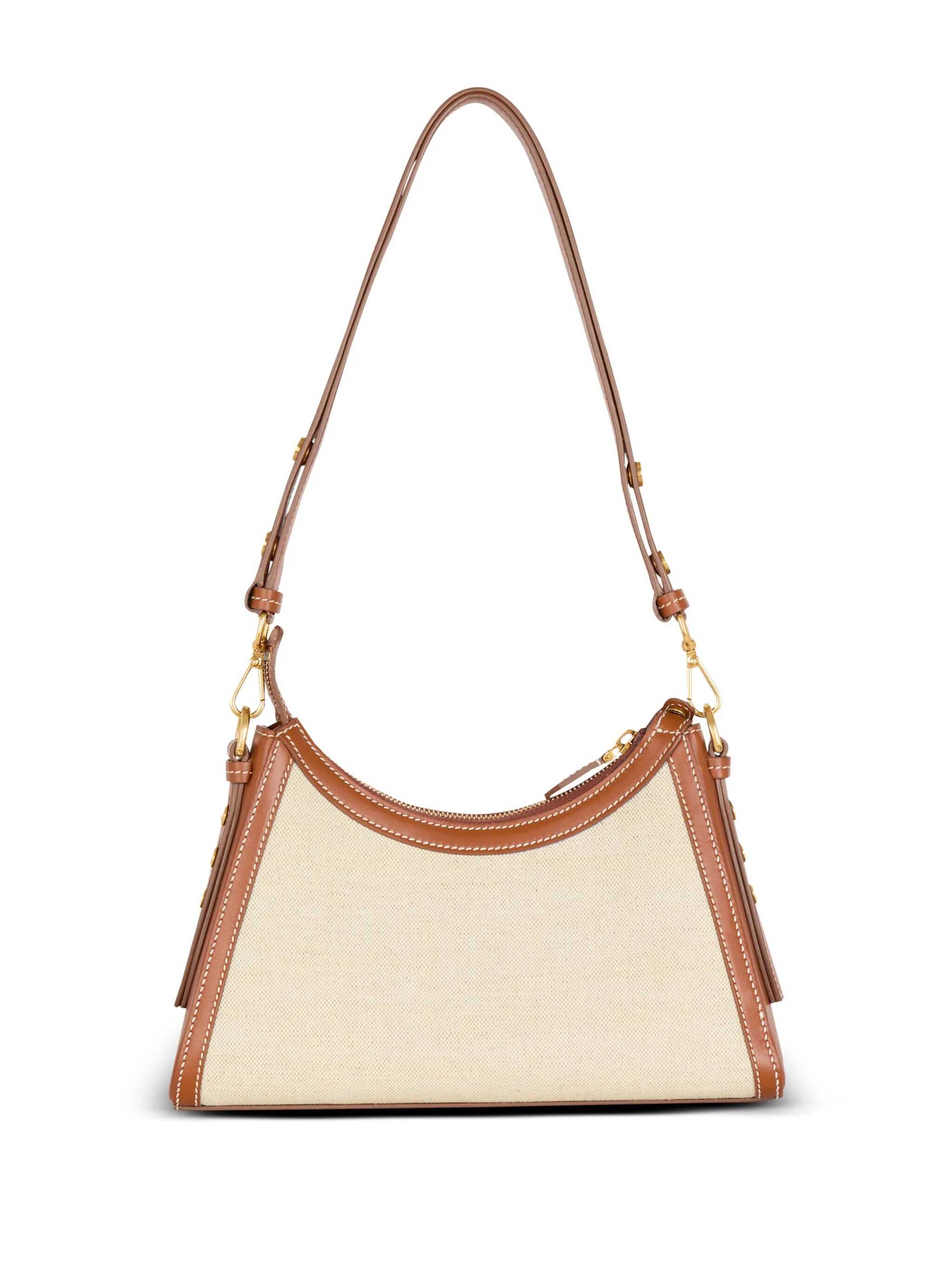 Shoulder bag in canvas and leather Natural color and leather Zip closure One external patch pocket Removable and adjustable leather shoulder strap One small slot pocket Front logo Measures: Width 28cm Height 18cm Depth 7.5cm