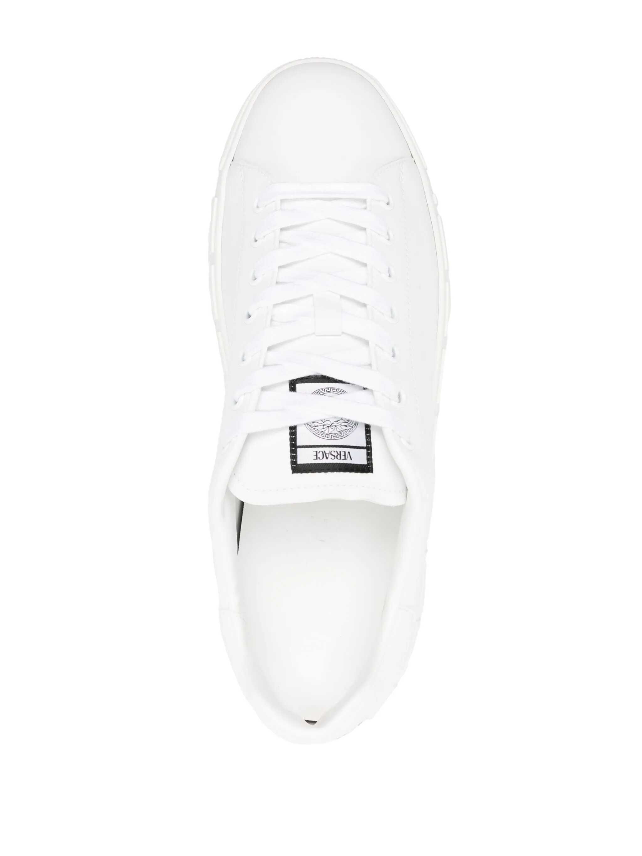 White sneaker. Lace-up closure. Logo patch on tongue. Heel with VERSACE signature.