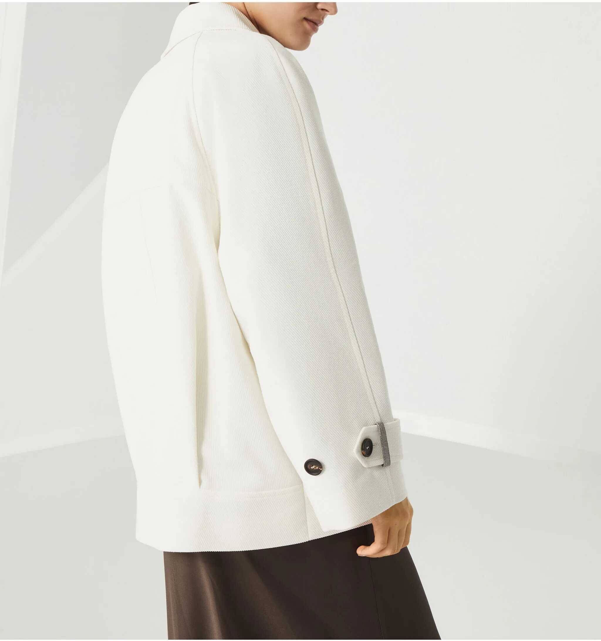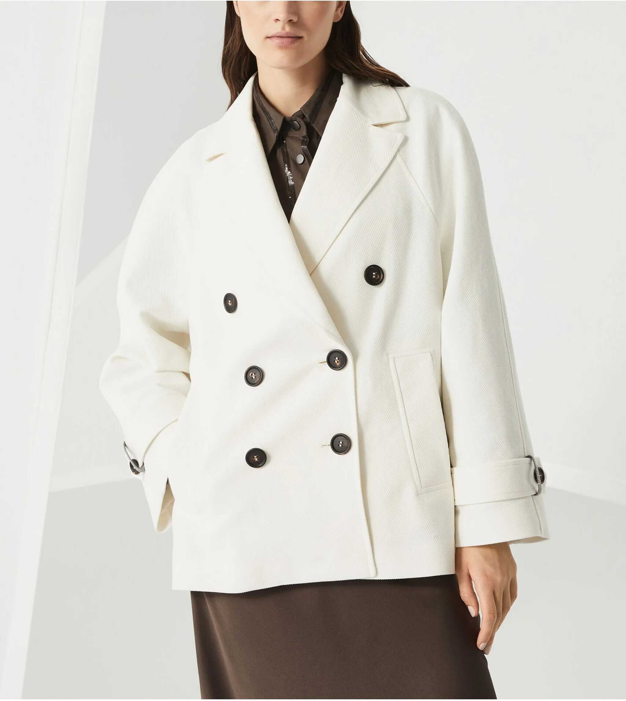 Brunello Cucinelli's double-breasted jacket features classic lapels and a double-breasted button closure that gives an elegant, structured look. The two side welt pockets add a touch of practicality, while the adjustable sleeves with buckle offer a customizable fit. A sophisticated and versatile garment perfect for creating refined and contemporary looks.