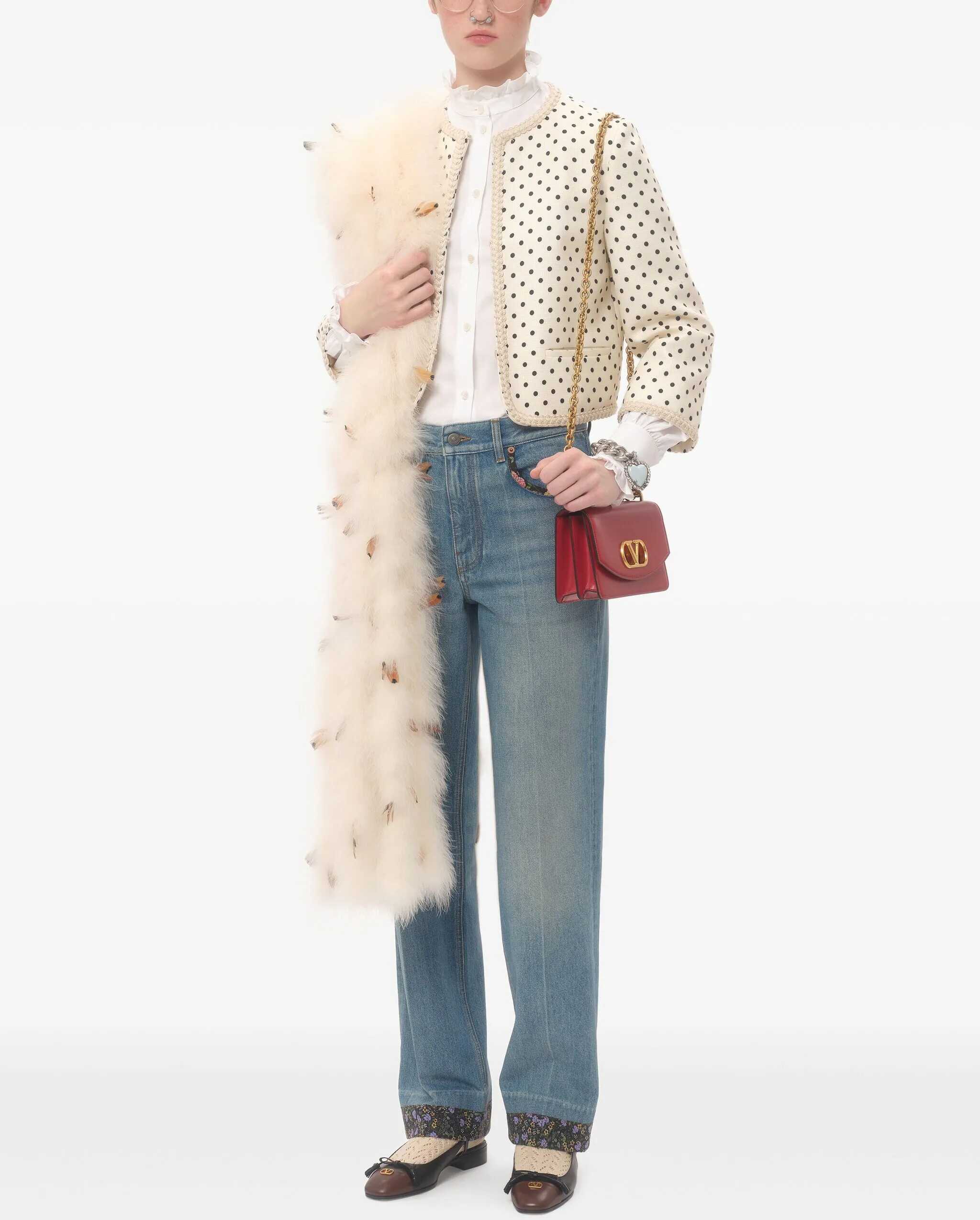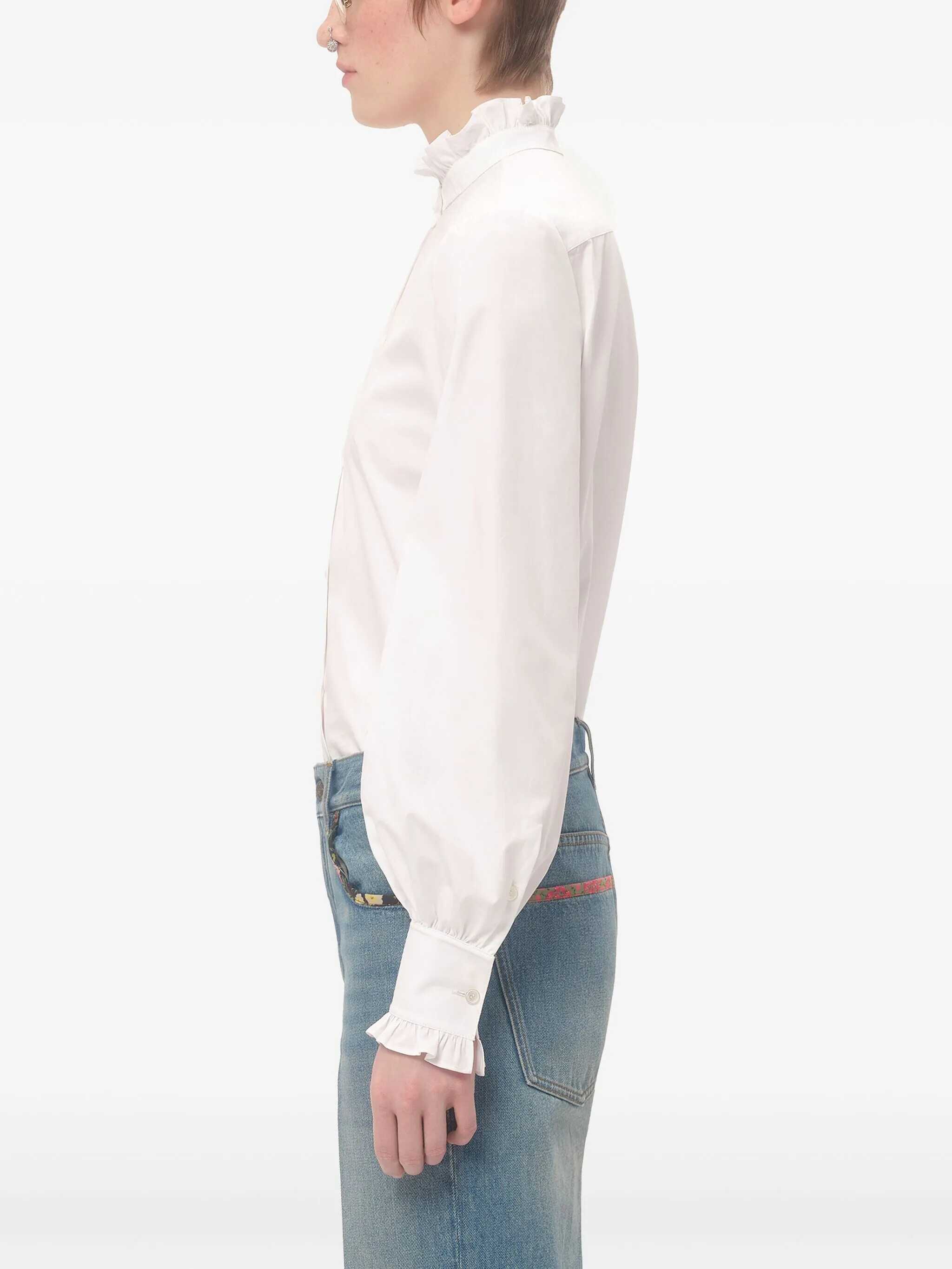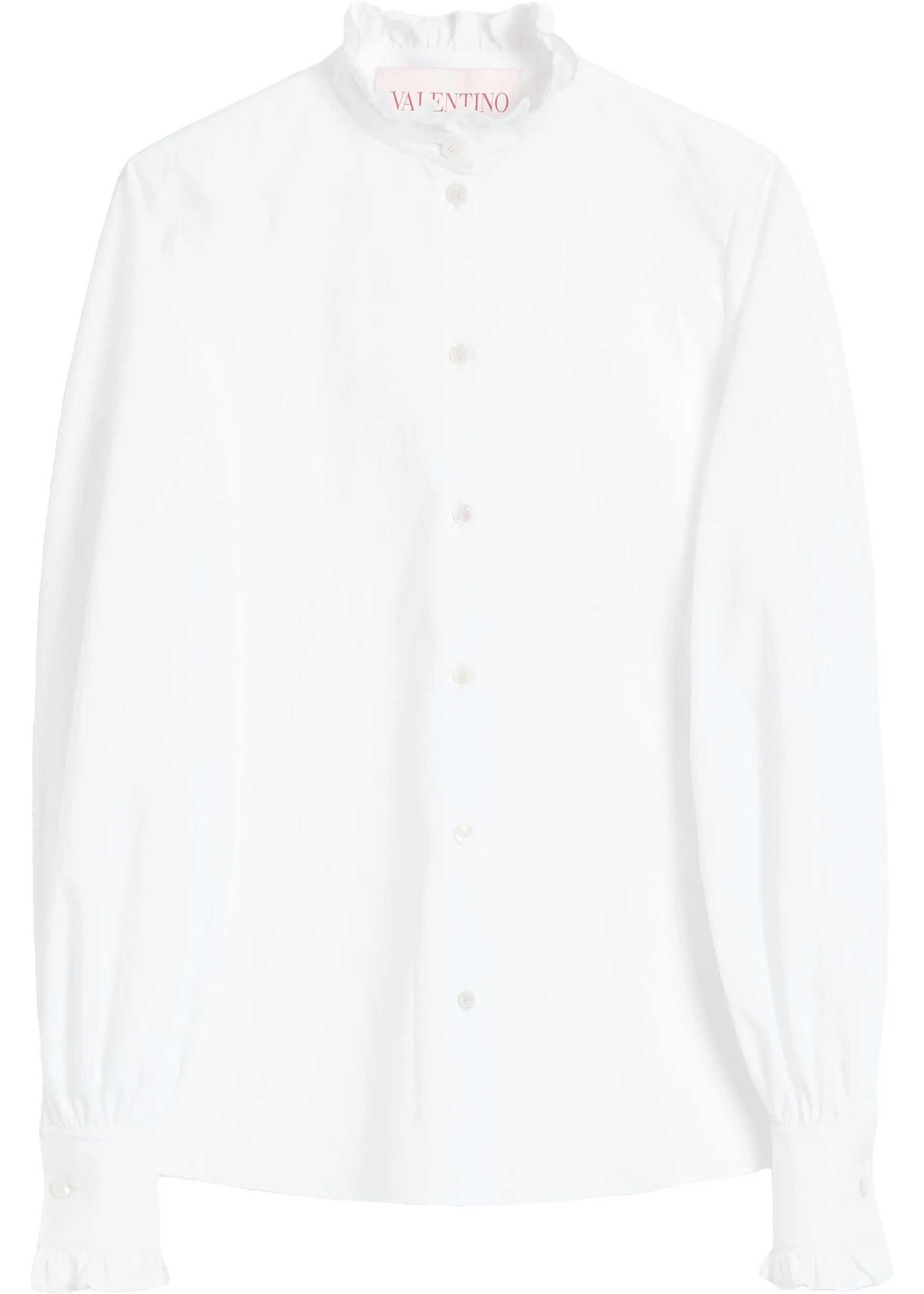 The Valentino Shirt is a sophisticated and feminine piece, characterized by elegant and delicate details. The front closure with mother-of-pearl buttons adds a touch of discreet luxury, while the cuffs and crew neck with ruffles give a romantic and refined dimension. These details embellish the shirt, making it ideal for those seeking an elegant style but with a touch of originality. Perfect for pairing with both formal looks and more casual combinations, this shirt is a true must-have for those who love the timeless charm of Valentino.