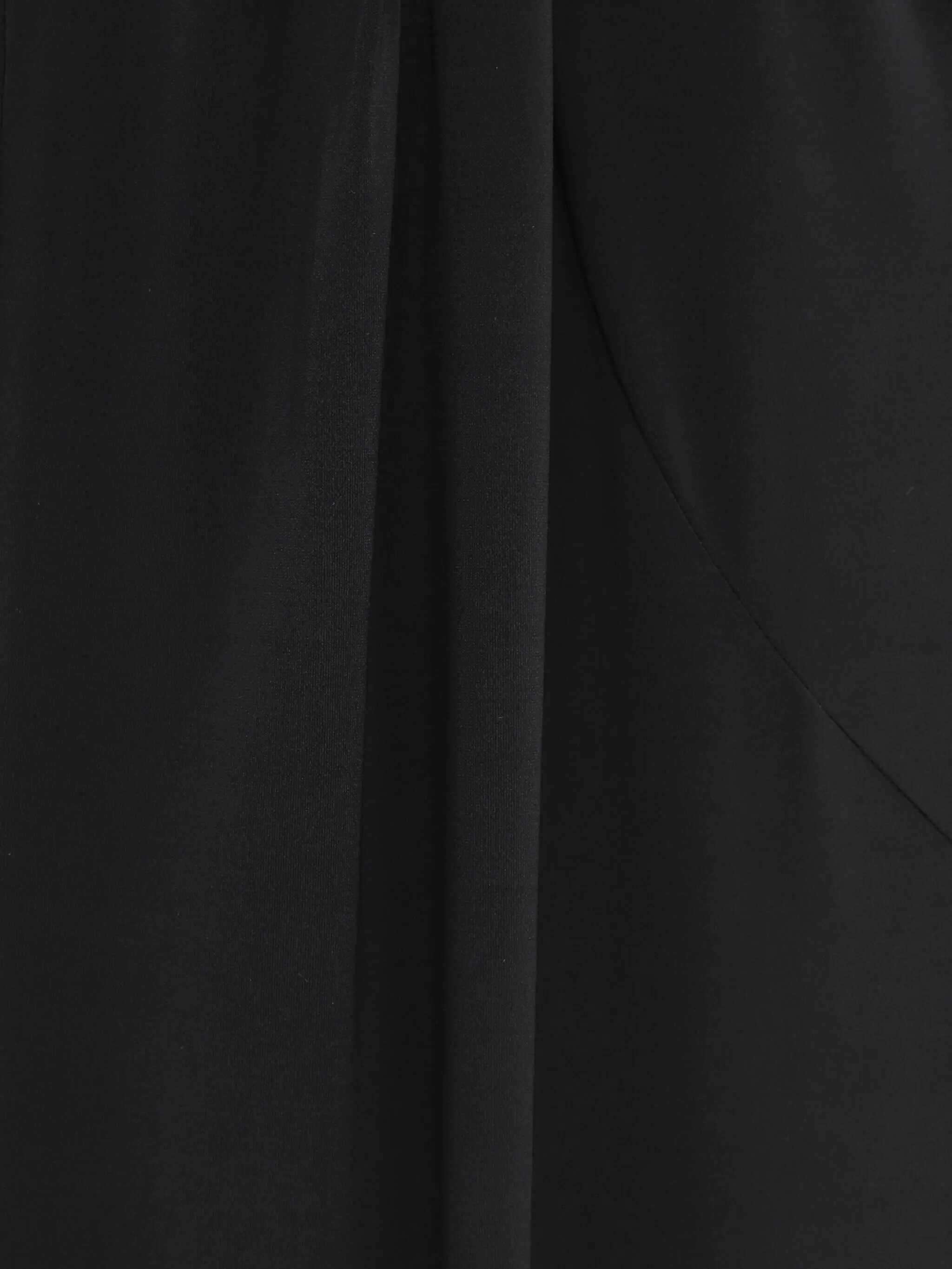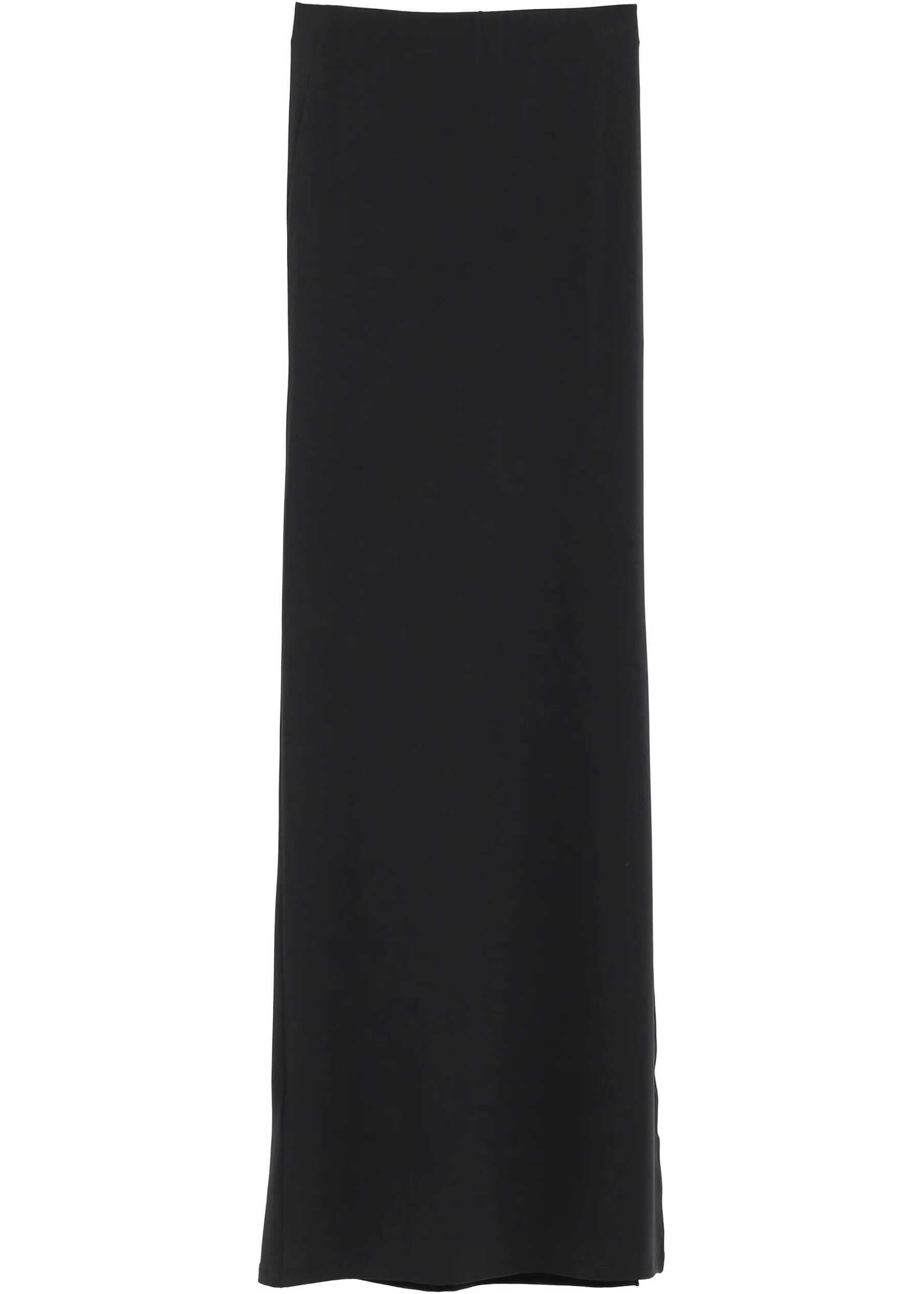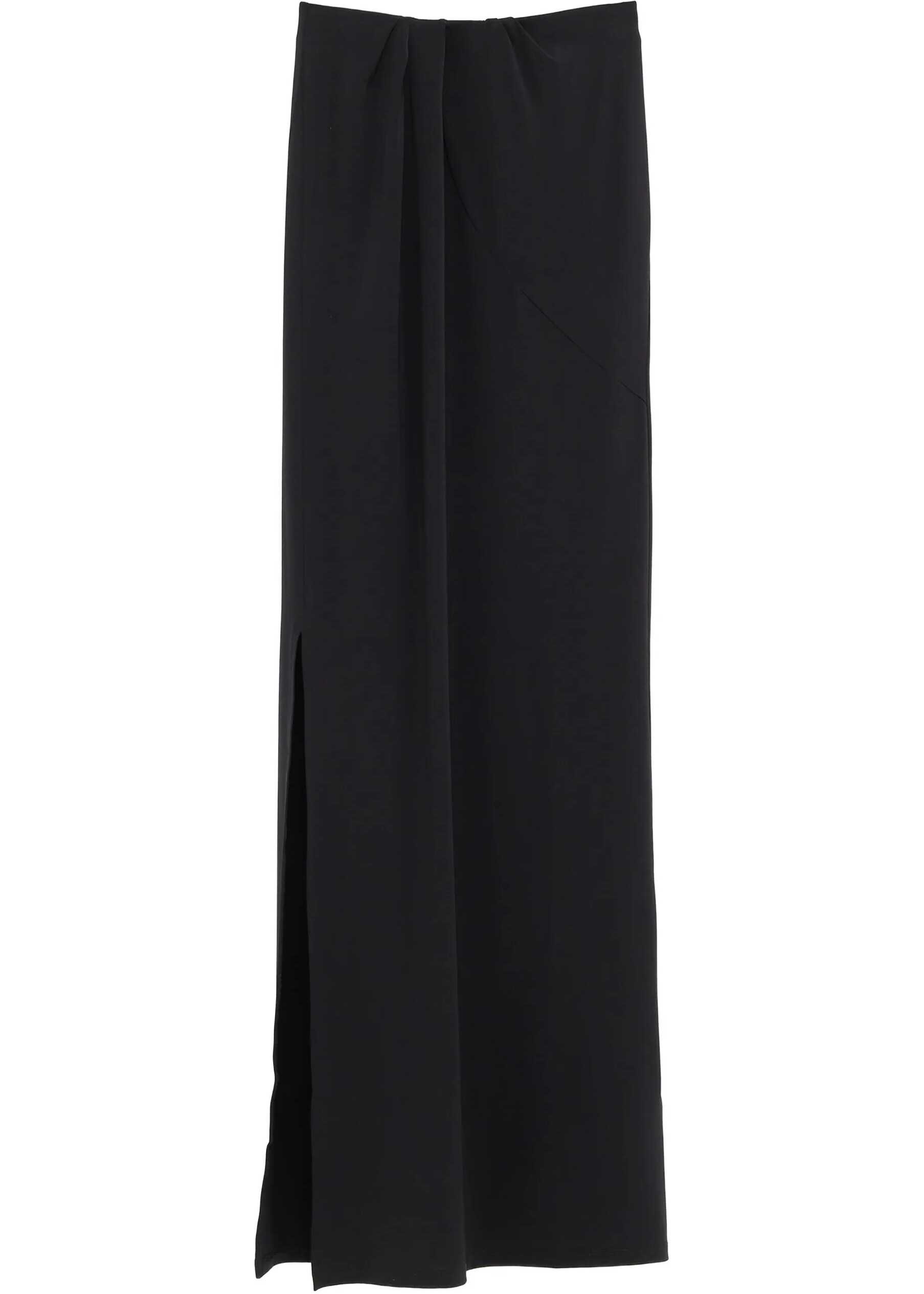Peplo long skirt in black stretch fabric. It features an elasticated waist, draping at the front, side slit, and an integrated mini skirt lining.
