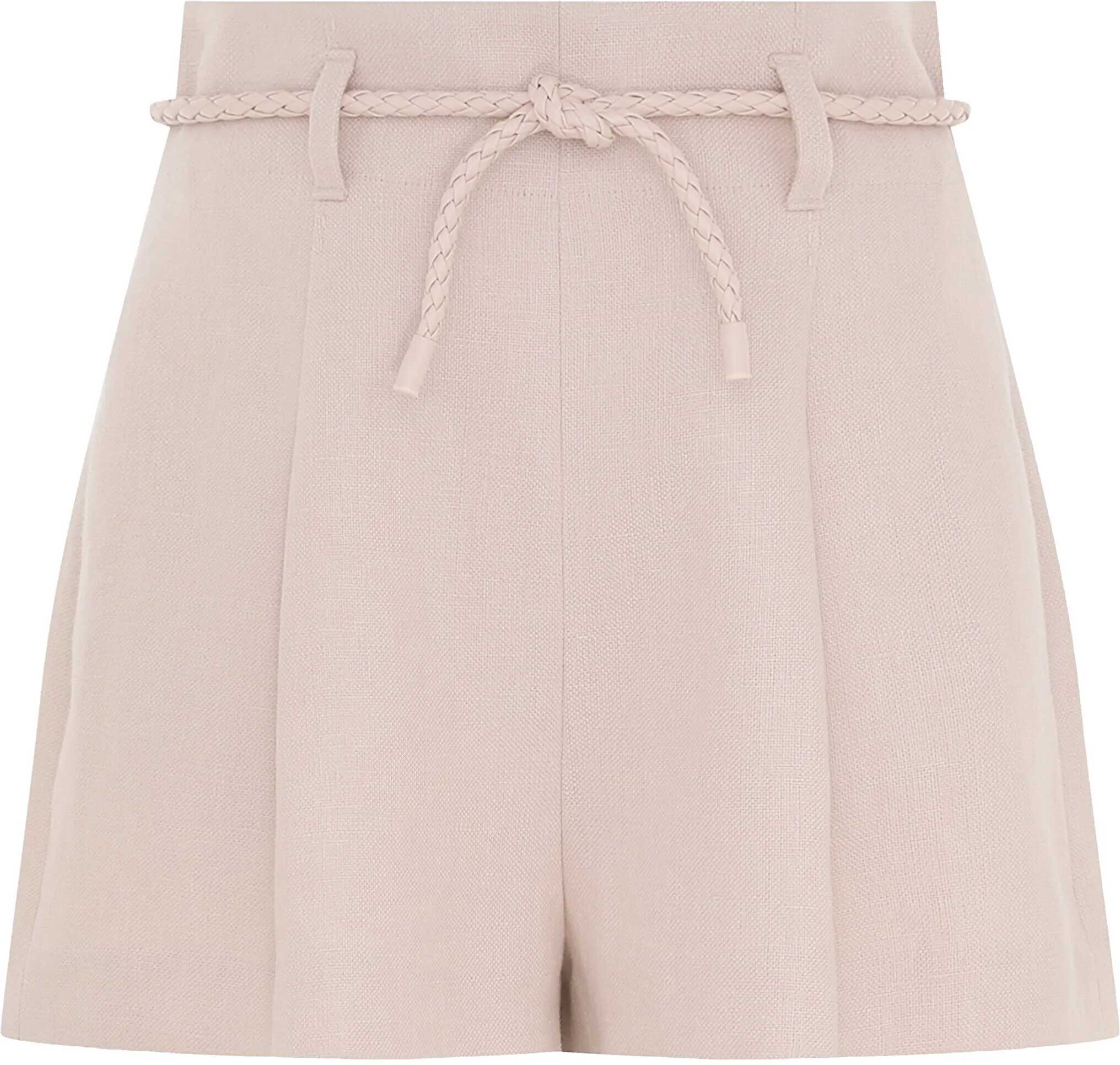 High-waisted Illuminate shorts in pastel pink linen. They feature a woven belt with an adjustable knot and hook, belt loops, front pleats, two side pockets, two welt back pockets, and an invisible zip closure at the back.