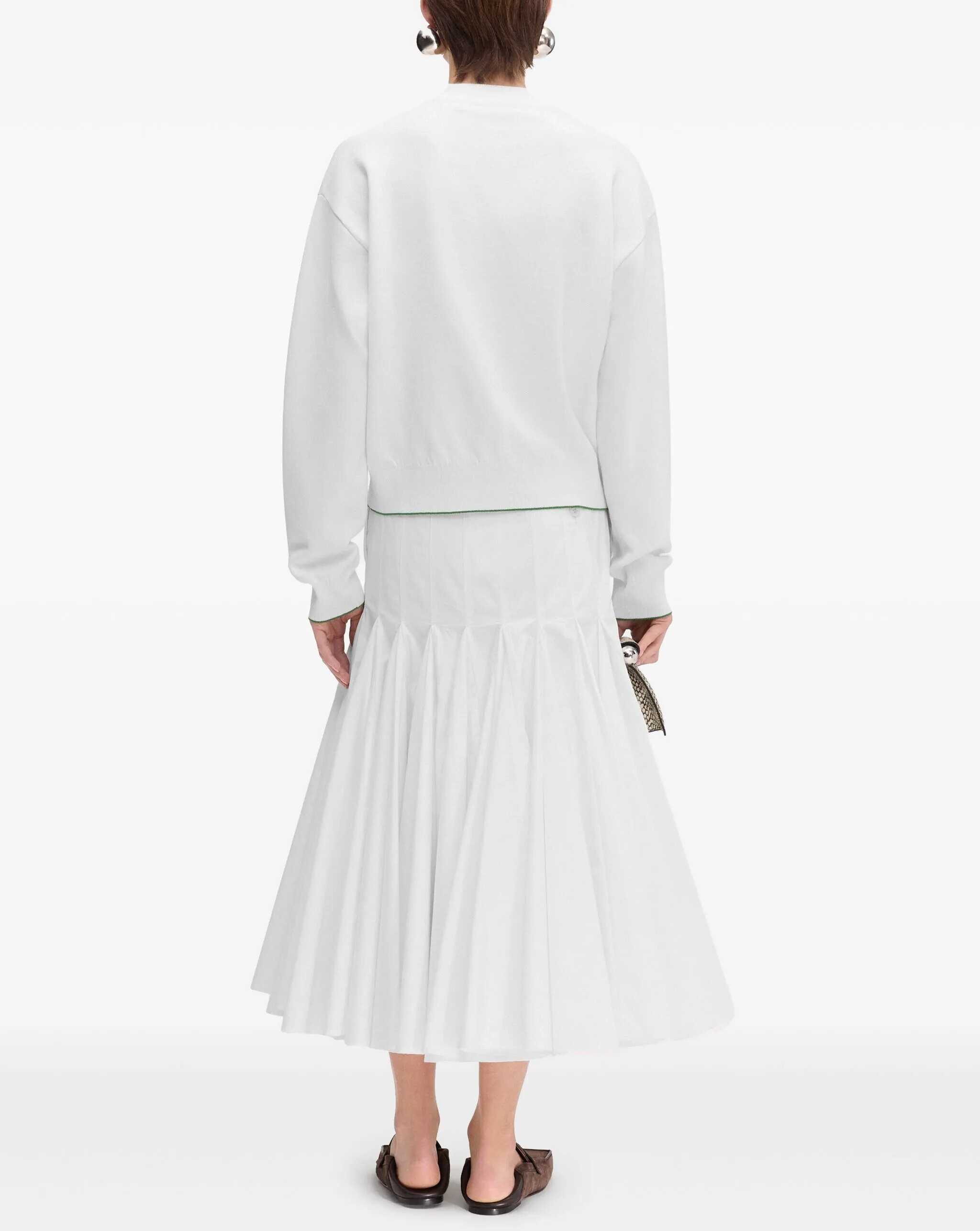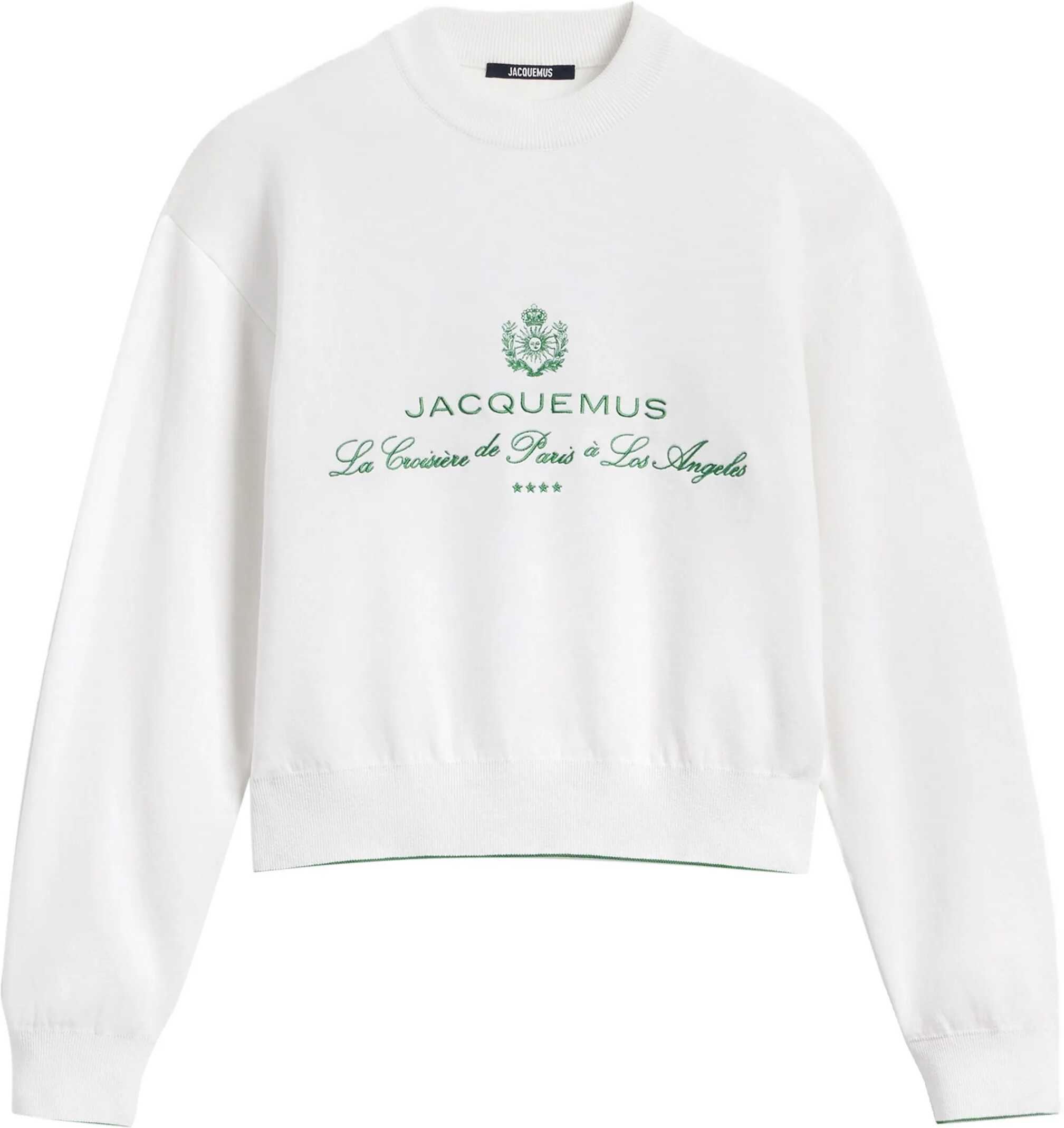 Venice sweatshirt in a white double-knit cotton and viscose blend. It features a ribbed crew neck, green Jacquemus Cruise embroidery on the chest, and ribbed hems and cuffs with contrasting green borders. Relaxed fit.