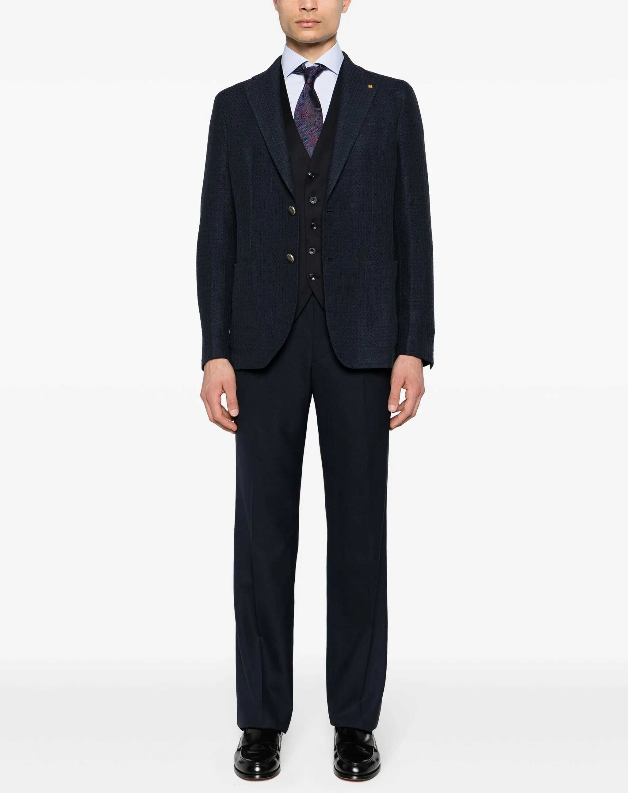 Dark blue virgin wool vest. It features a V-neck, button closure, two front welt pockets, and an adjustable buckle strap on the back.