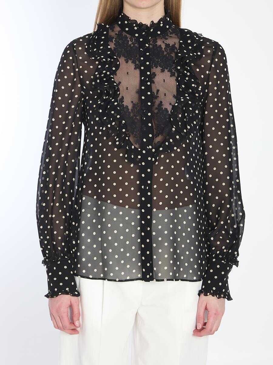 Black semi-transparent silk shirt with white polka dots. It features a high ruffled collar, front button closure, lace insert on the chest with side ruffles, and high cuffs with ruffles and fabric-covered buttons.