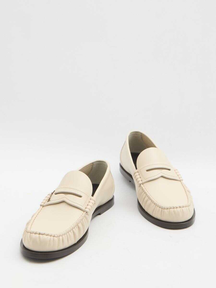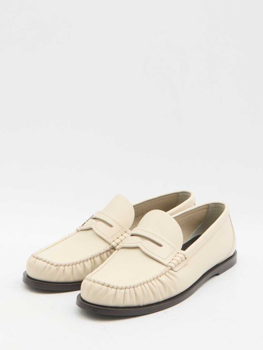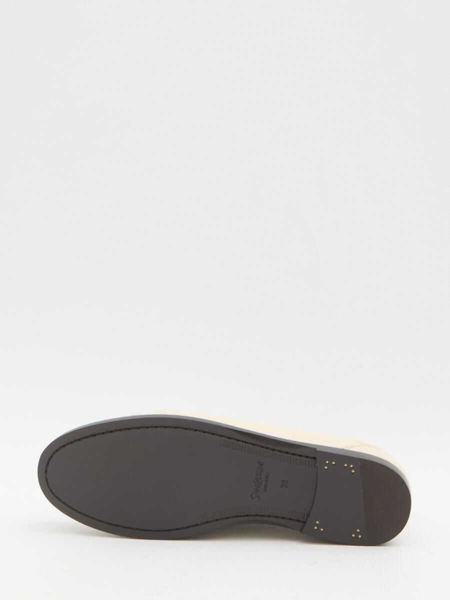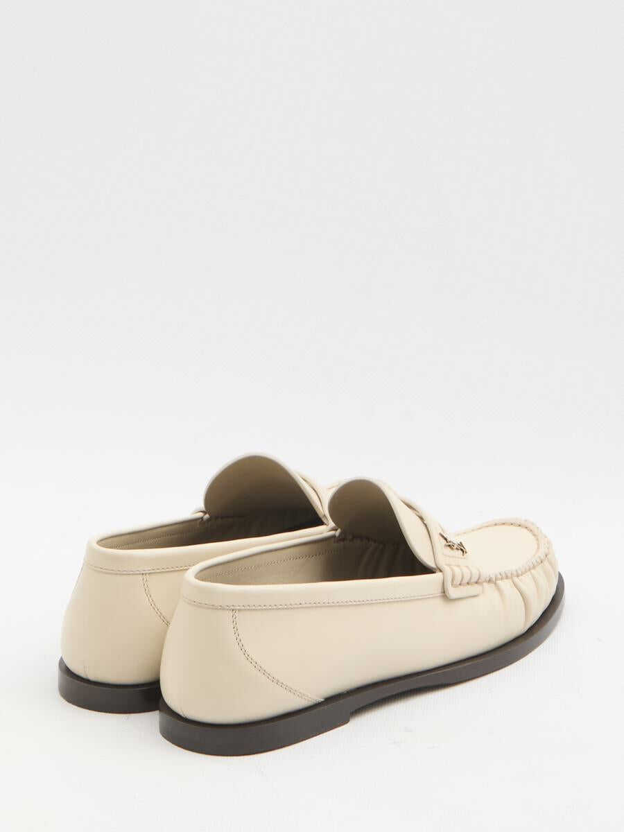 Moccasins in smooth marble white leather. They feature a gathered toe, a metal Cassandre logo on the right shoe, an engraved logo on the insole, and a leather sole. Dust bag included. Any imperfections in the leather should not be considered manufacturing defects but rather a characteristic of the material.
