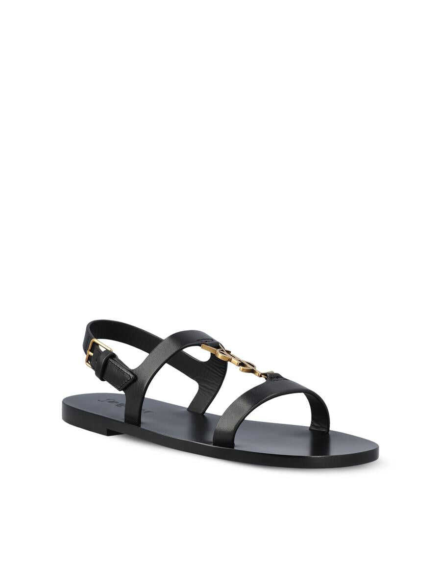 Saint Laurent's signature Cassandre sandals express graphic and sophisticated sensuality. Made of smooth black leather, they feature an essential design with a slim front strap, adjustable ankle strap and the iconic metallic YSL logo serving as a central element and structure for the foot. - Upper: 100% lambskin leather - Color: black - Leather sole - Thick T-band decorated with metal Cassandre at front - Made in Italy - Box included - Item number: 818294DWEDD1000
