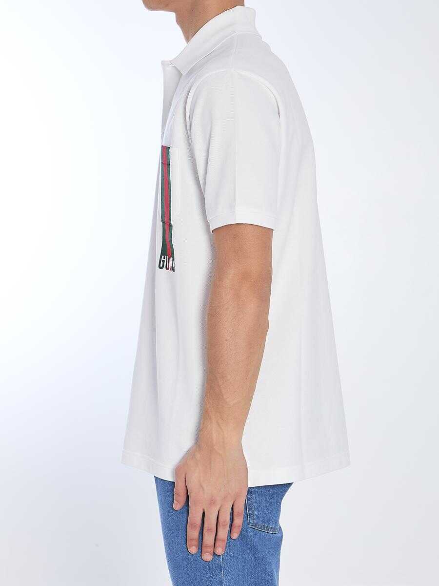 White short-sleeved polo shirt in cotton piqué. It features a classic collar, a two-button placket, a chest pocket with green and red Web trim and a Gucci logo, two side slits at the hem, and ribbed collar and sleeve edges.