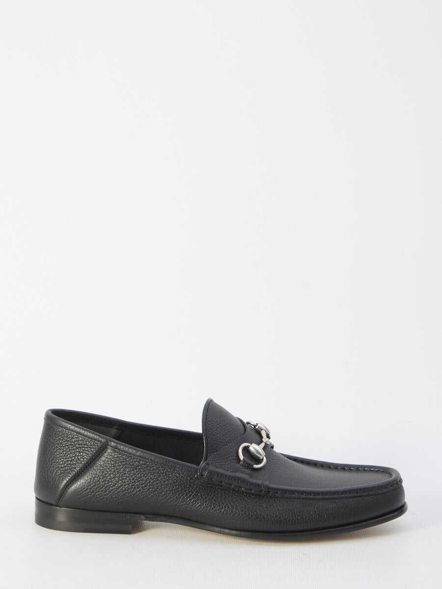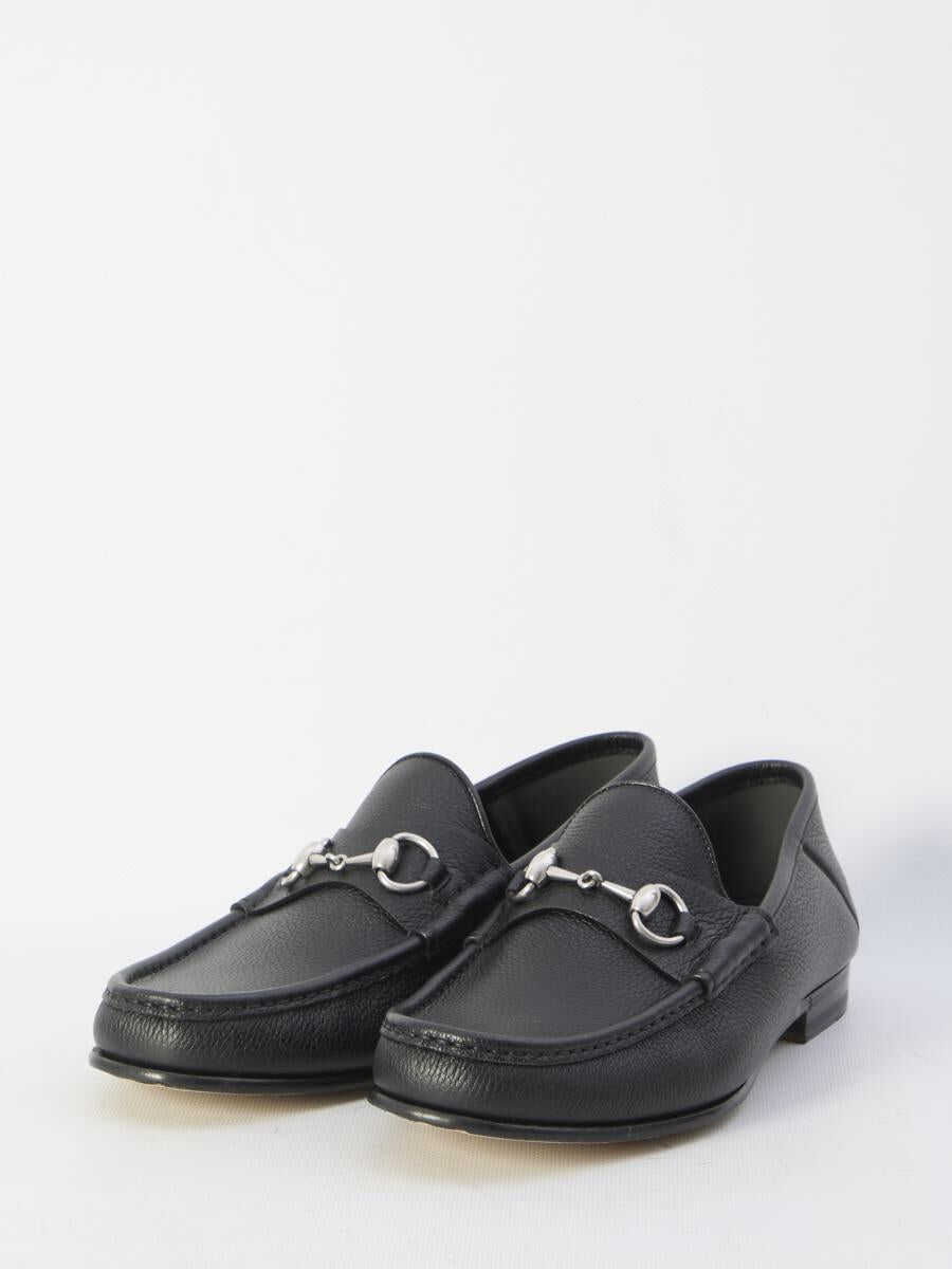 Horsebit 1953 Moccasins in black pebbled calfskin leather. They feature a Horsebit detail on the upper, soft heels that can be worn as mules when folded, a Gucci 1953 logo tag on the insole, and a leather sole. Dust bag included. Any imperfections in the leather should not be considered manufacturing defects but rather a characteristic of the material.
