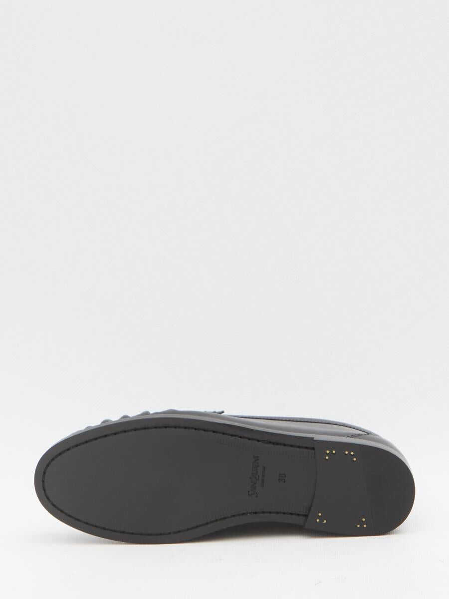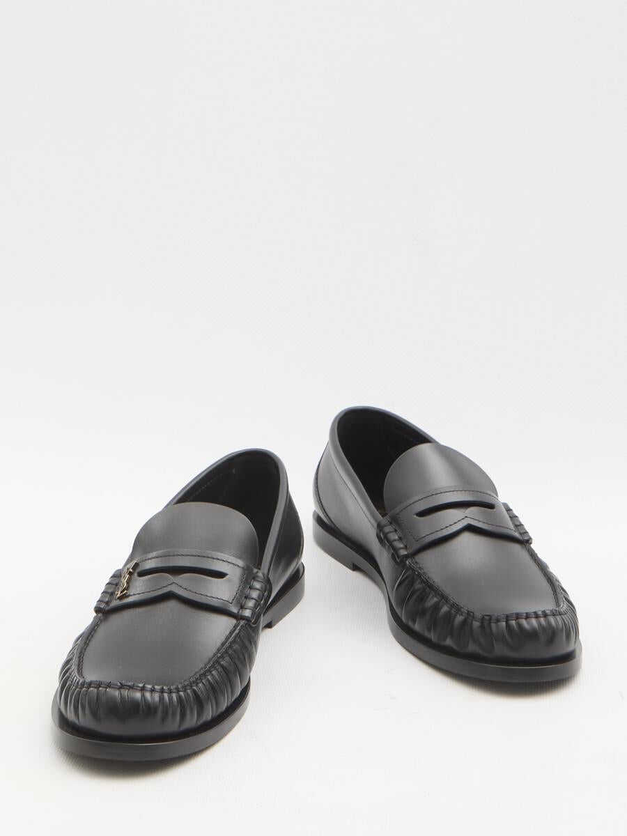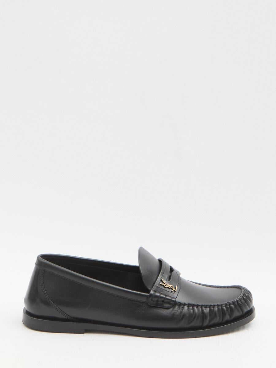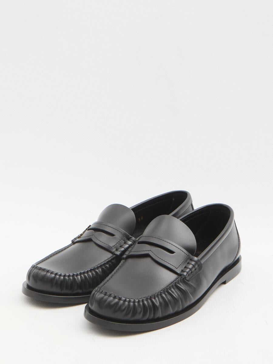 Moccasins in smooth black leather. They feature a gathered toe, a metal Cassandre logo on the right shoe, an engraved logo on the insole, and a leather sole. Dust bag included. Any imperfections in the leather should not be considered manufacturing defects but rather a characteristic of the material.