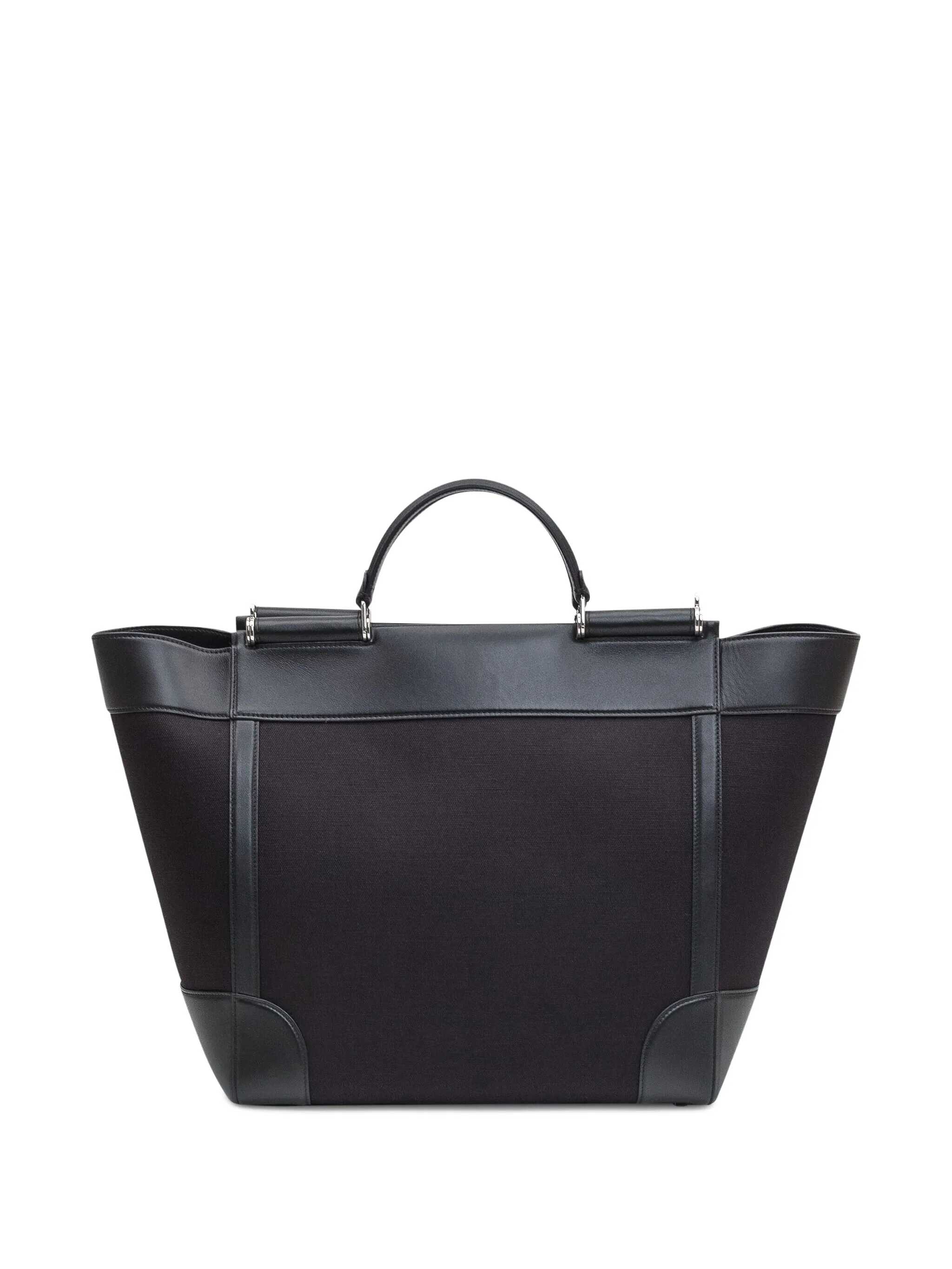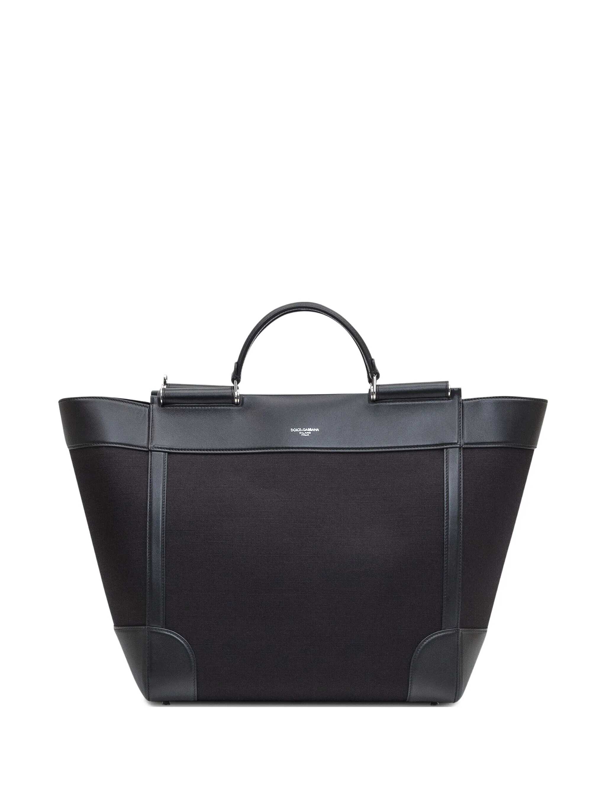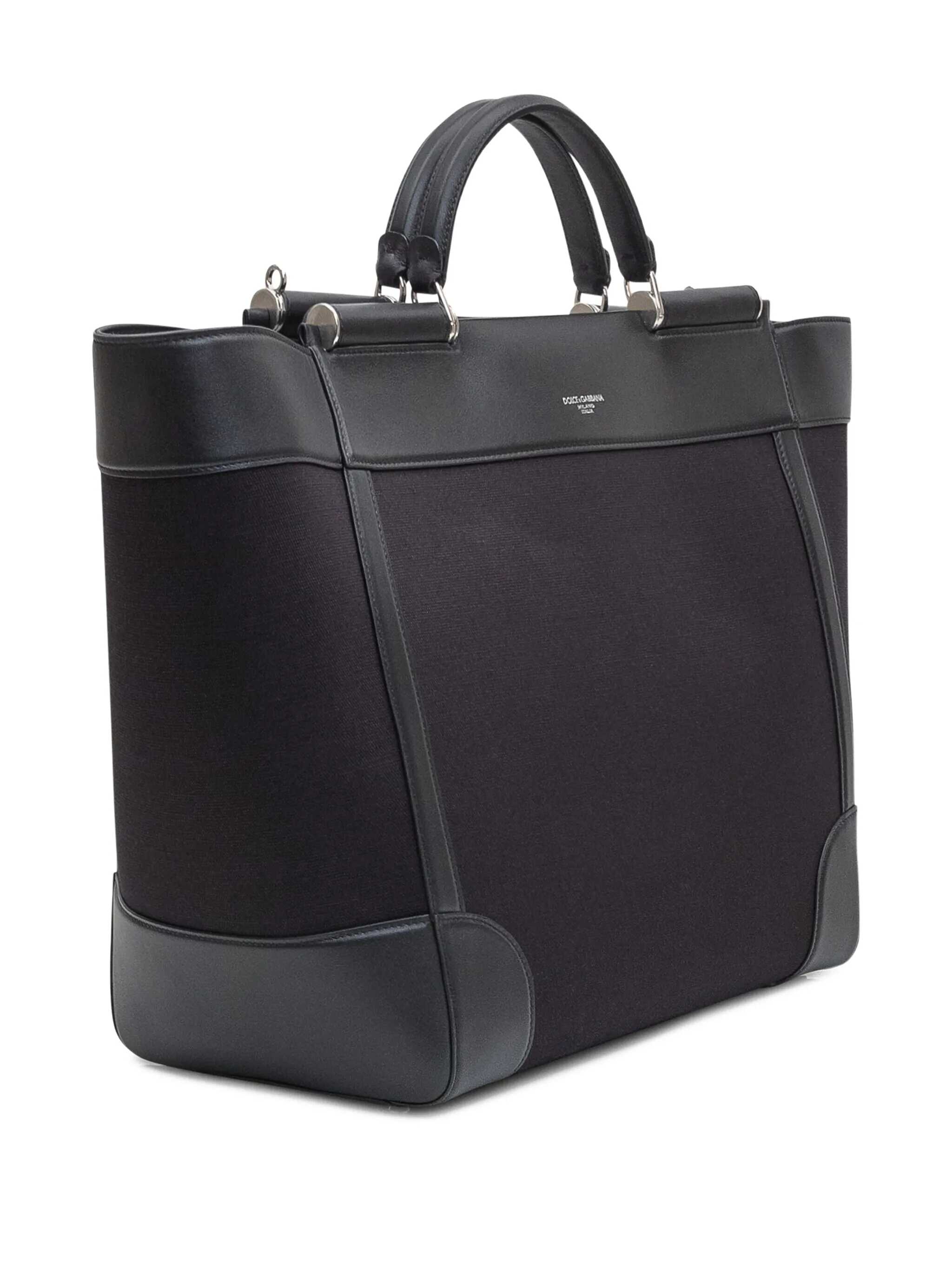 Black leather and fabric bag. Two leather handles. Adjustable and removable shoulder strap present. Printed logo on the front. Width:55 Height:34 Depth:21