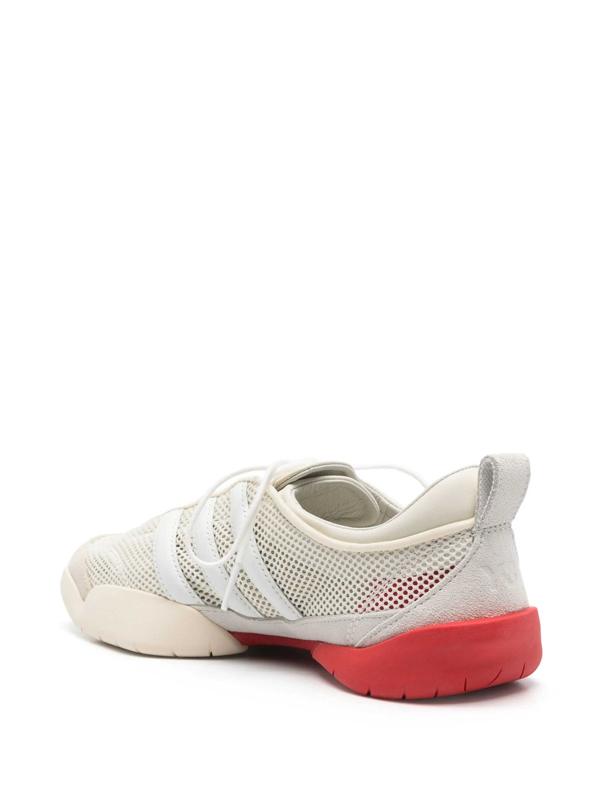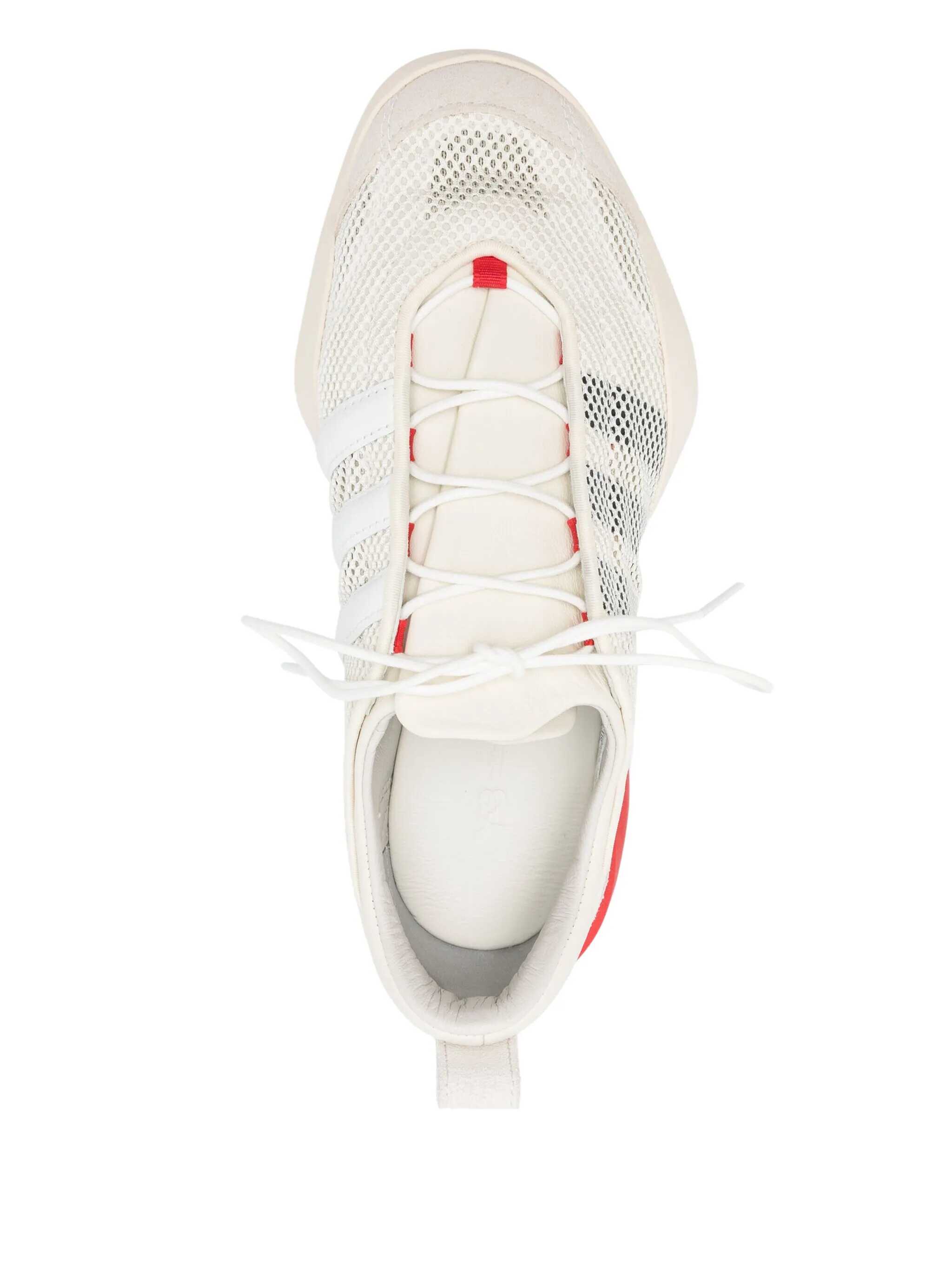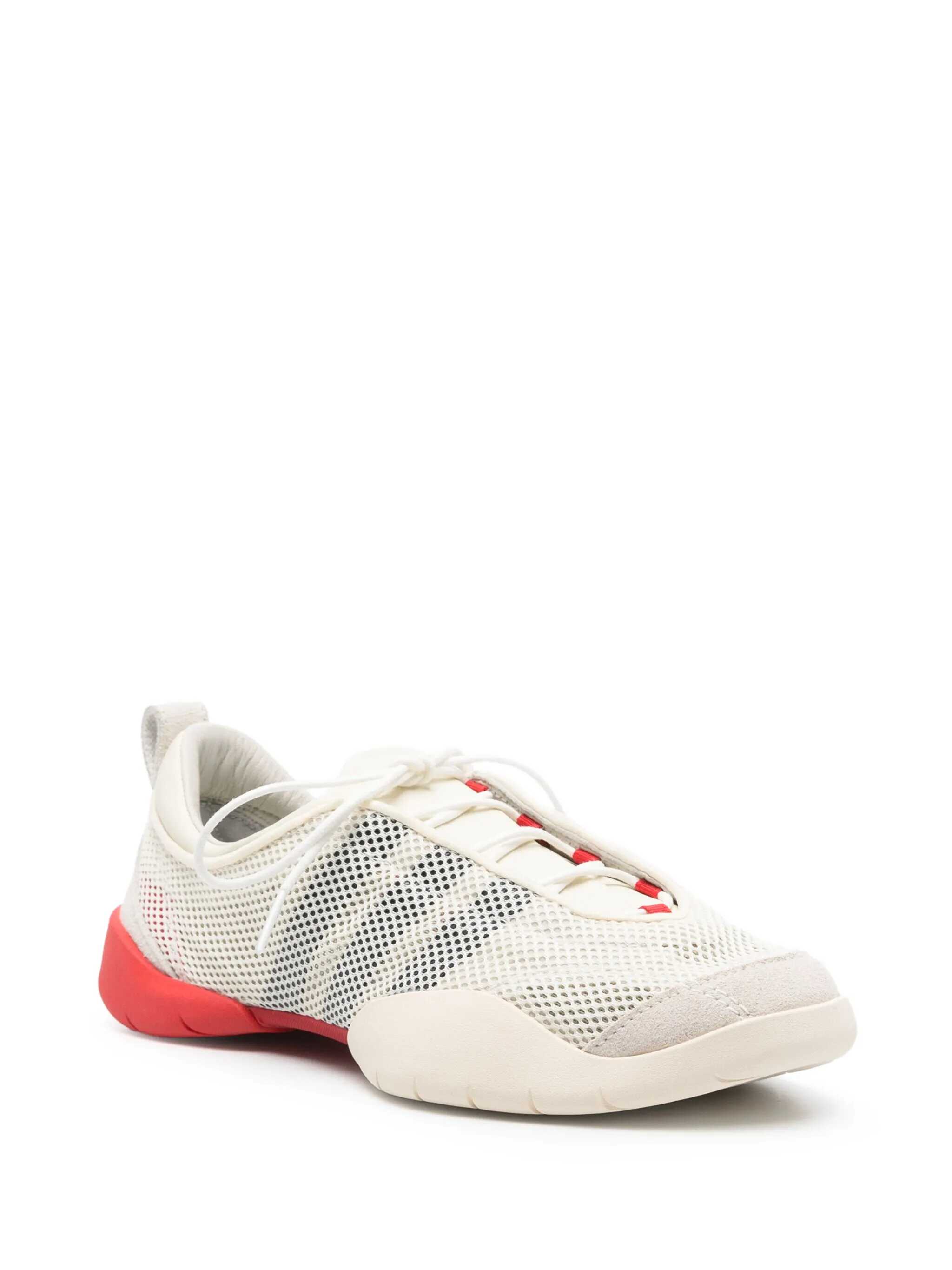 Regu Sneakers in beige leather and fabric, slip on, elastic laces, logo bands, pull tab on backside, logo on heel, mesh upper, rubber sole, Made in China