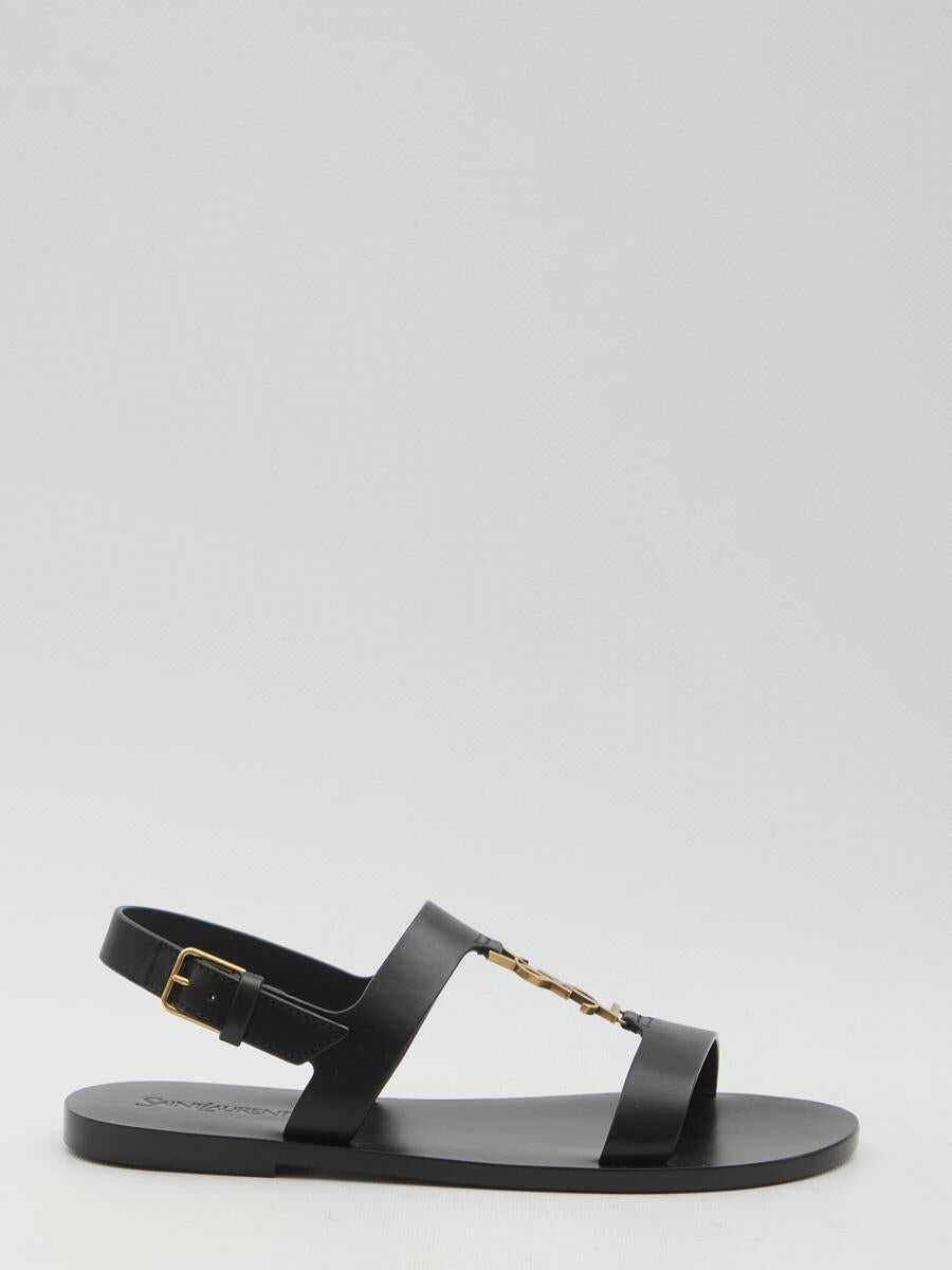 Flat sandals in black calfskin leather with a wide T-strap decorated with metal Cassandre details at the front. They feature an adjustable buckle strap and a leather sole. Dust bag included. Any imperfections in the leather should not be considered manufacturing defects but rather a characteristic of the material.
