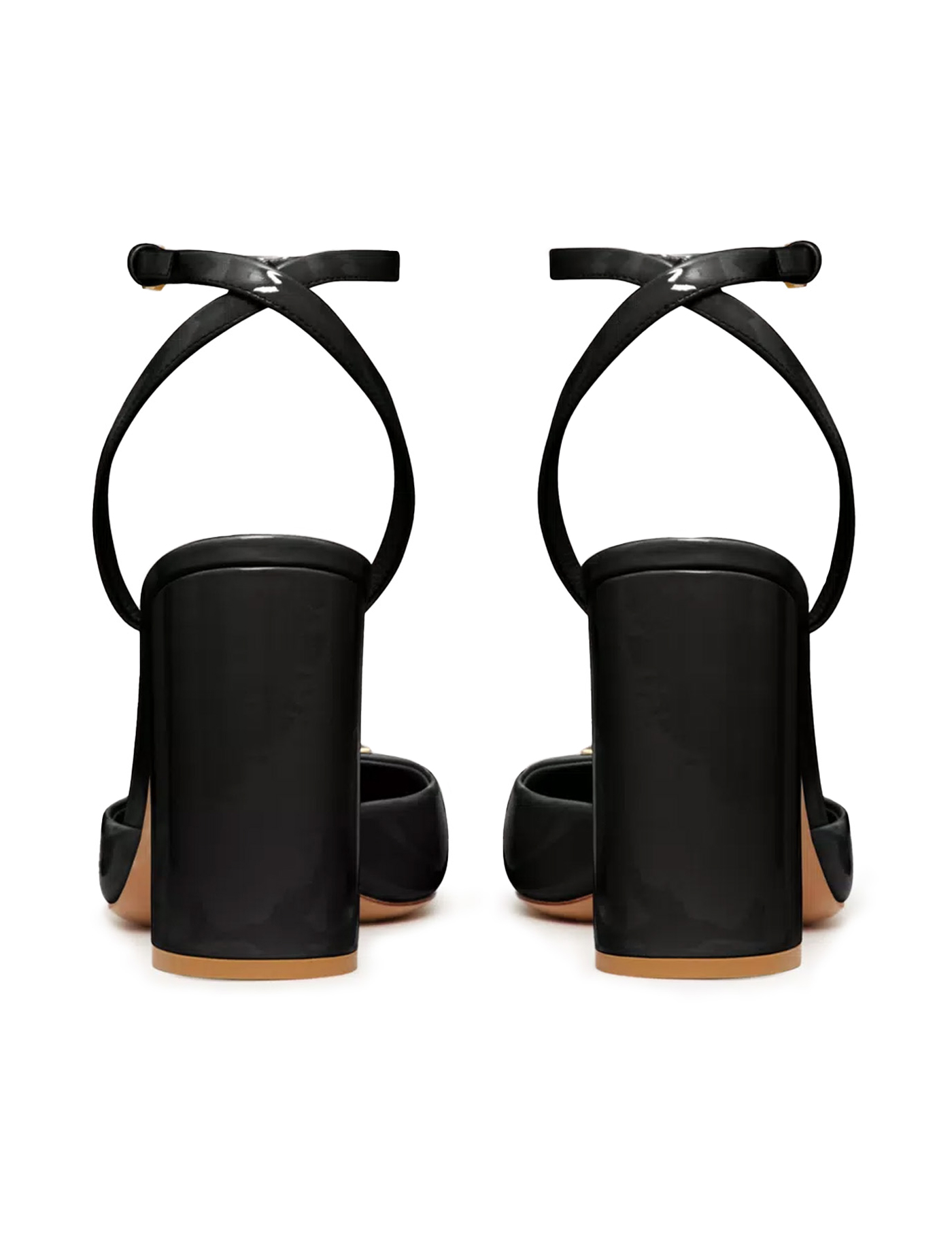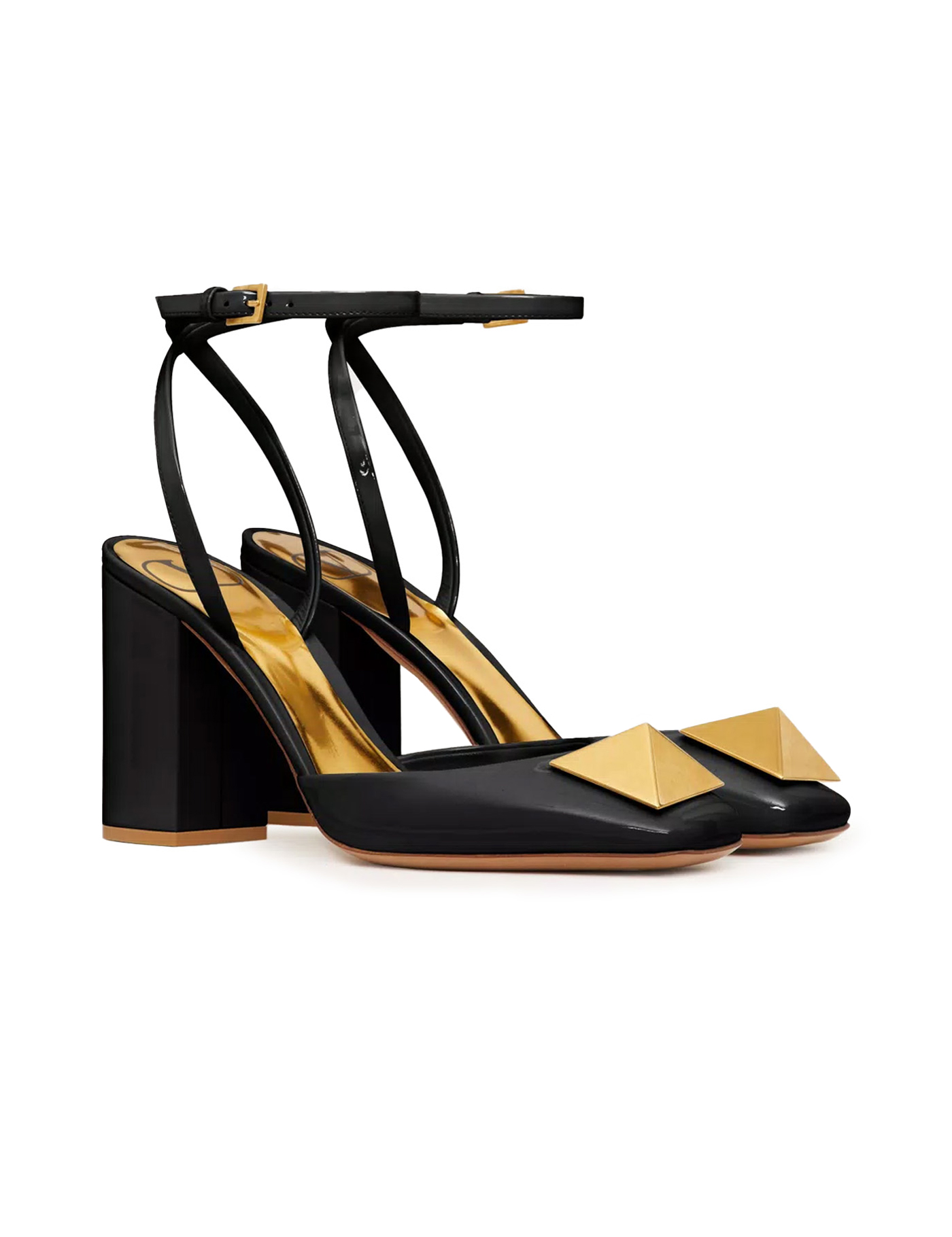 Valentino Garavani pumps crafted in patent leather and embellished with iconic antiqued gold metal stud. Adjustable ankle strap, laminated leather footbed and leather sole.