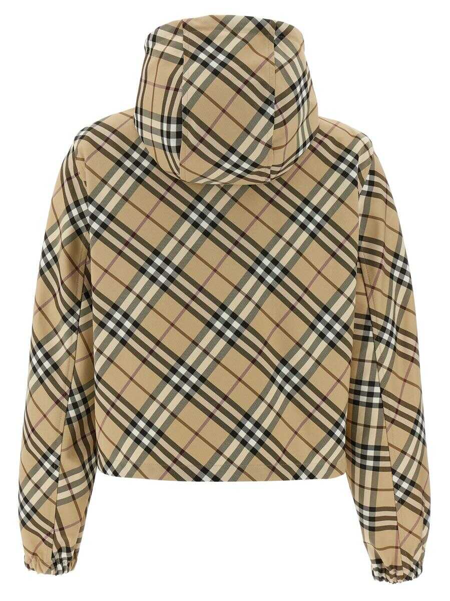 Short hooded jacket, technical fabric with check print, maxi logo embroidery on the front, front zip closure, elastic drawstring on the hem, long sleeves with elastic cuffs