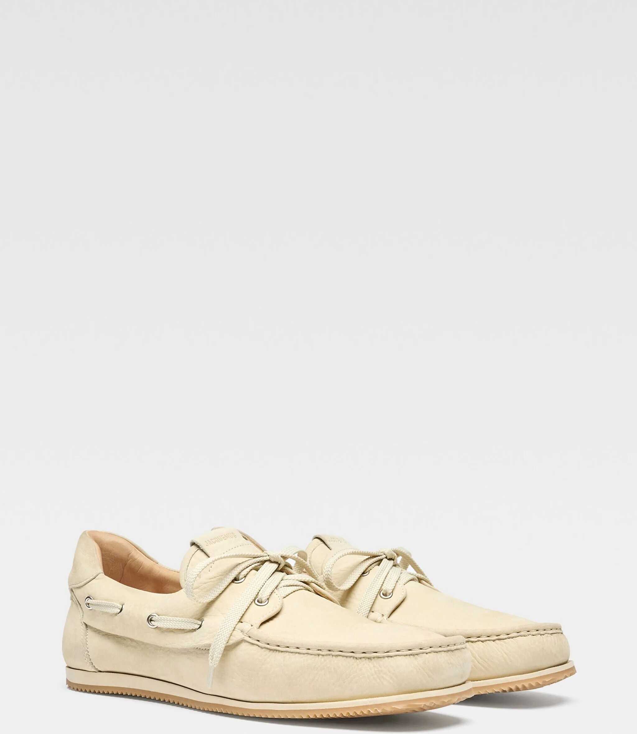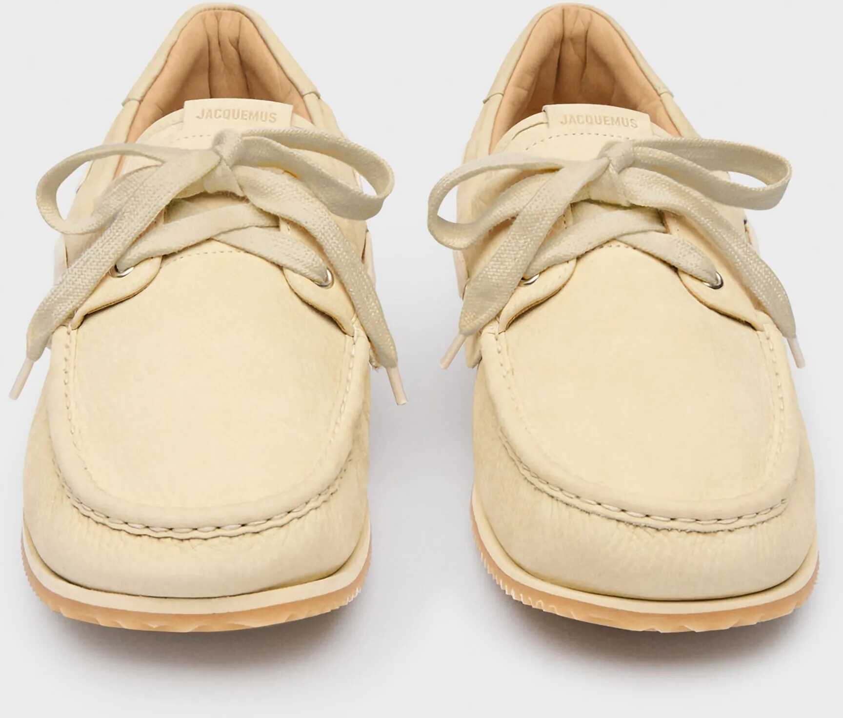 Le Batto boat shoes in yellow nubuck leather. They feature a round toe, moccasin-style stitching, lace-up closure, double tongue with embossed logo, embossed logo on the heel, an insole with embossed logo, and a rubber sole. Dust bag included. Any imperfections in the leather are not considered manufacturing defects but rather a characteristic of the material.