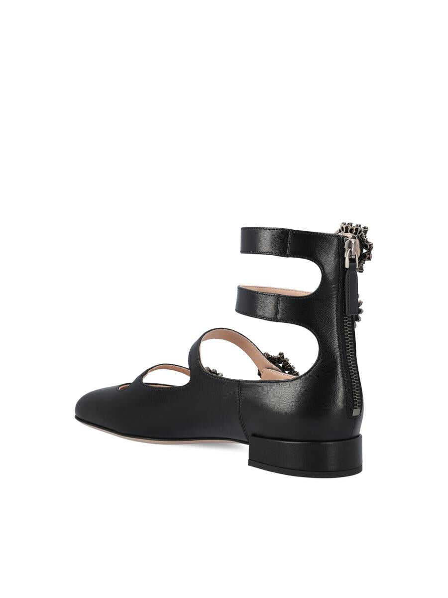 Contemporary femininity and couture design come together in Valentino Garavani's signature Preshoes ballet flats, crafted in platinum-colored metallic leather. The tapered toe silhouette is embellished with a tone-on-tone VLogo detail on the front, while the 20 mm mini heel adds comfort without sacrificing elegance. - Upper: 100% kidskin leather - Color: black - Custom innersole with scallops pattern - Straps detailed with jeweled buttons with crystals and antiqued effect brass finish VLogo Signature decoration - Wide banded leather heel - Heel height: 20 mm - Made in Italy - Item code: 6W2S0LL9DHS9TG