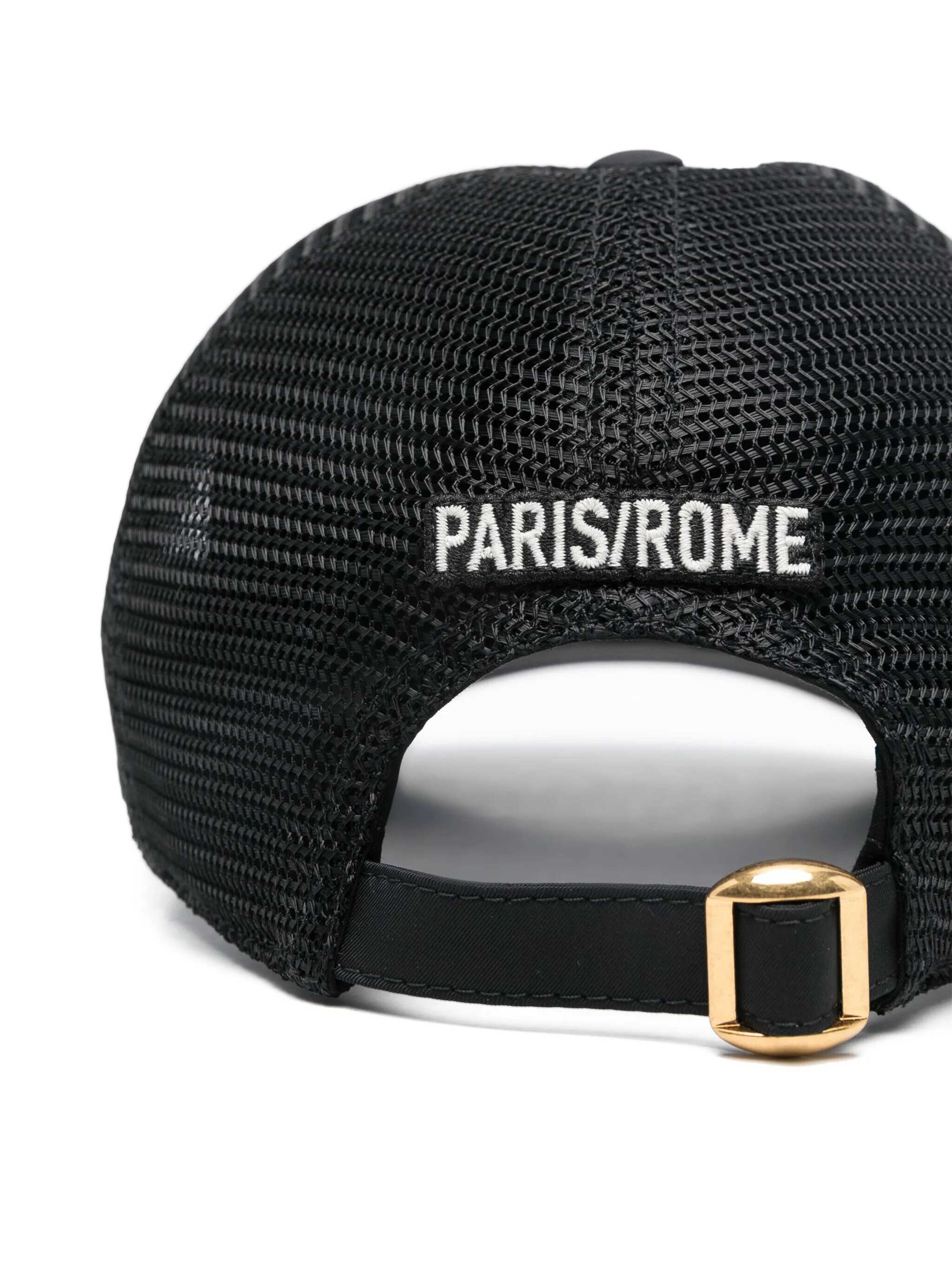 Valentino Garavani baseball cap crafted from black nylon and mesh, featuring "Chez Valentino" print. Detailed with an adjustable strap with a metal buckle and a partially lined interior.
