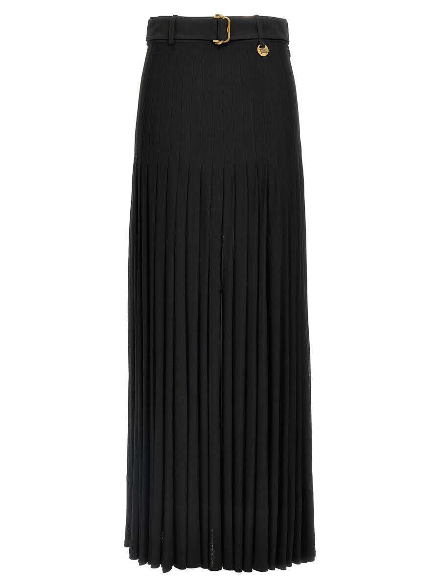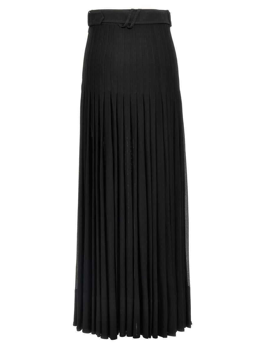 Long pleated skirt in semi-transparent viscose, belt at the waist with loops, metal logo detail, side hook and zip closure