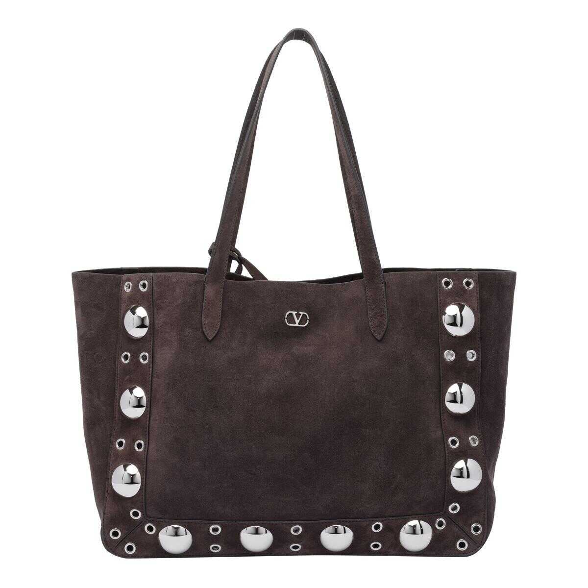 Valentino Garavani Testa Di Moro Brown Nellcote Shopping Bag, Frontal Logo, Studs Allover, Inner Removable Zipped Pouch, Two Handle, 29x49x13 cm