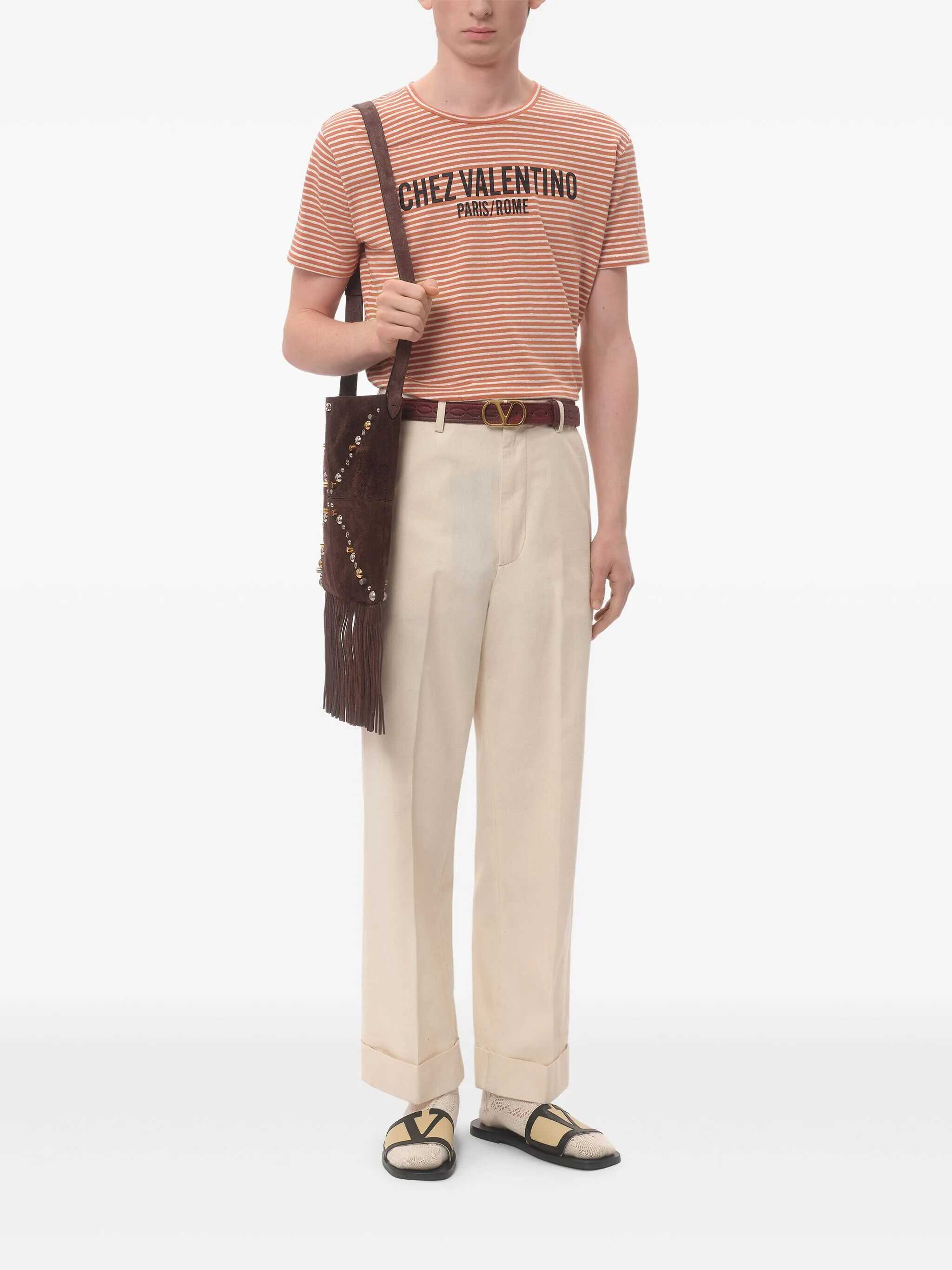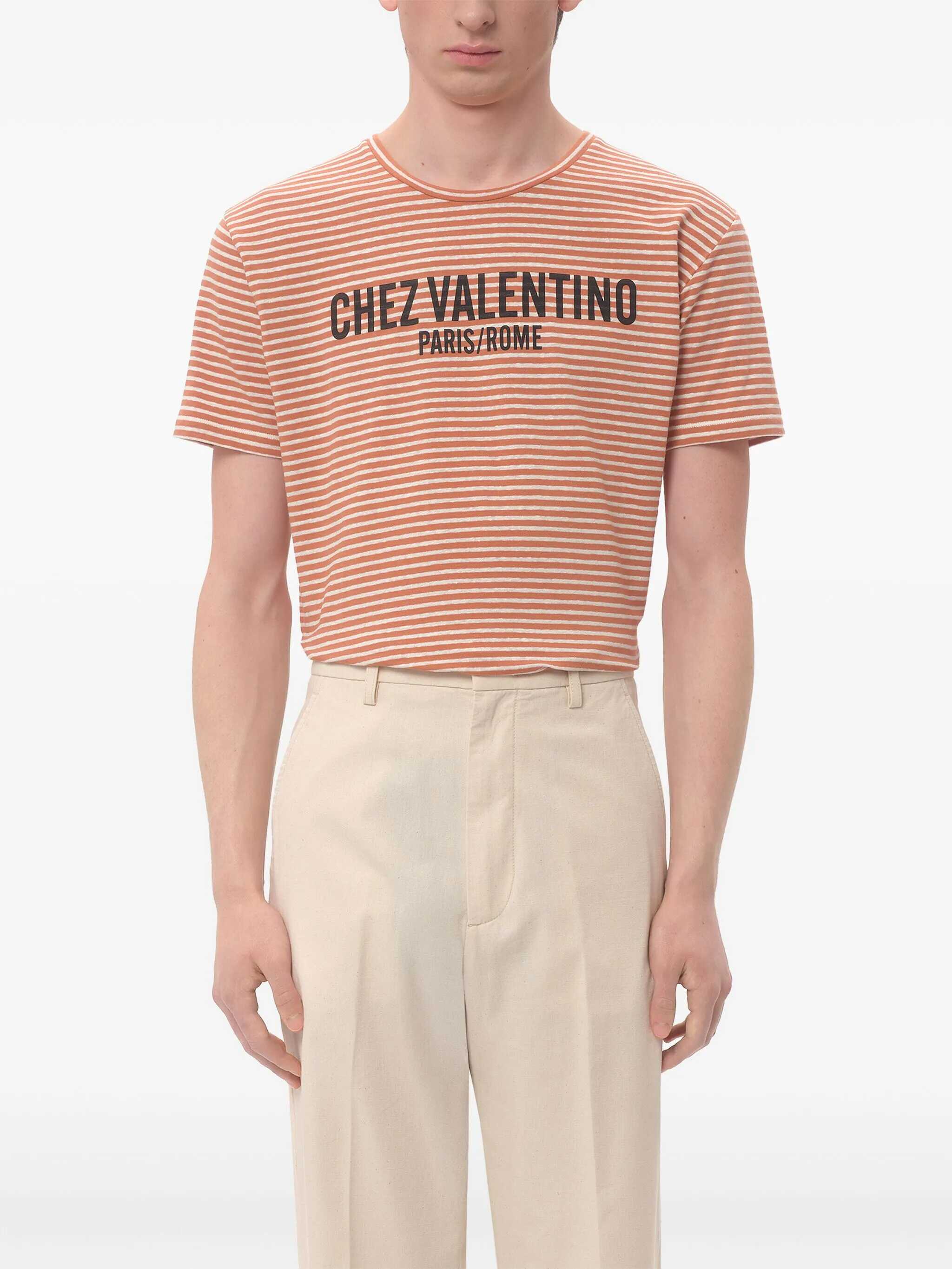 Striped stretch linen and cotton blend T-shirt with front 'Chez Valentino' print, crewneck, and short sleeves