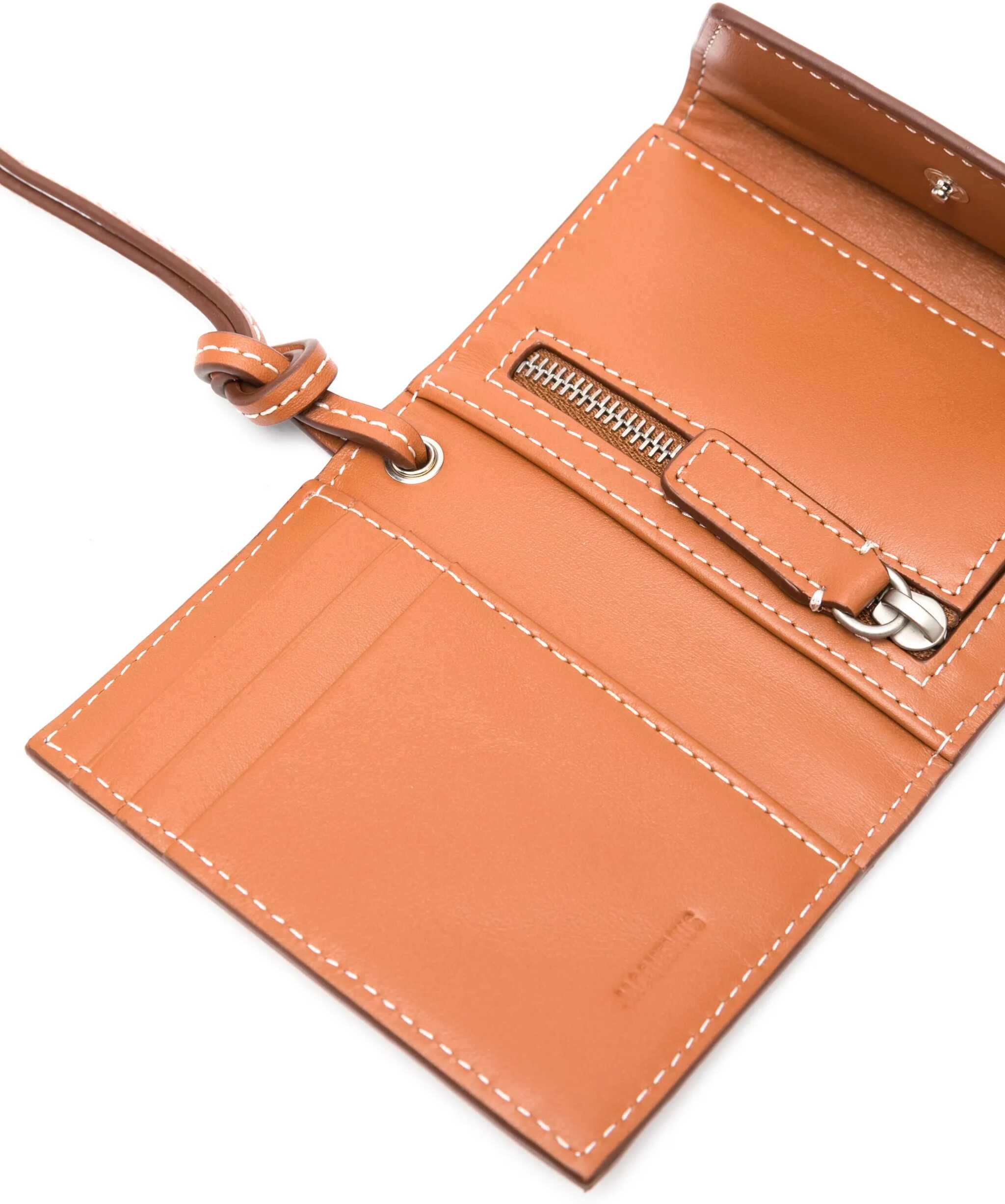 The Jacquemus wallet in light brown leather. It features a flap with a snap button closure and a silver-tone metal logo, a removable knotted strap, three internal card slots, two flat internal pockets, and one zipped internal pocket. Dust bag included. Any imperfections in the leather are not considered defects but rather a characteristic of the material.