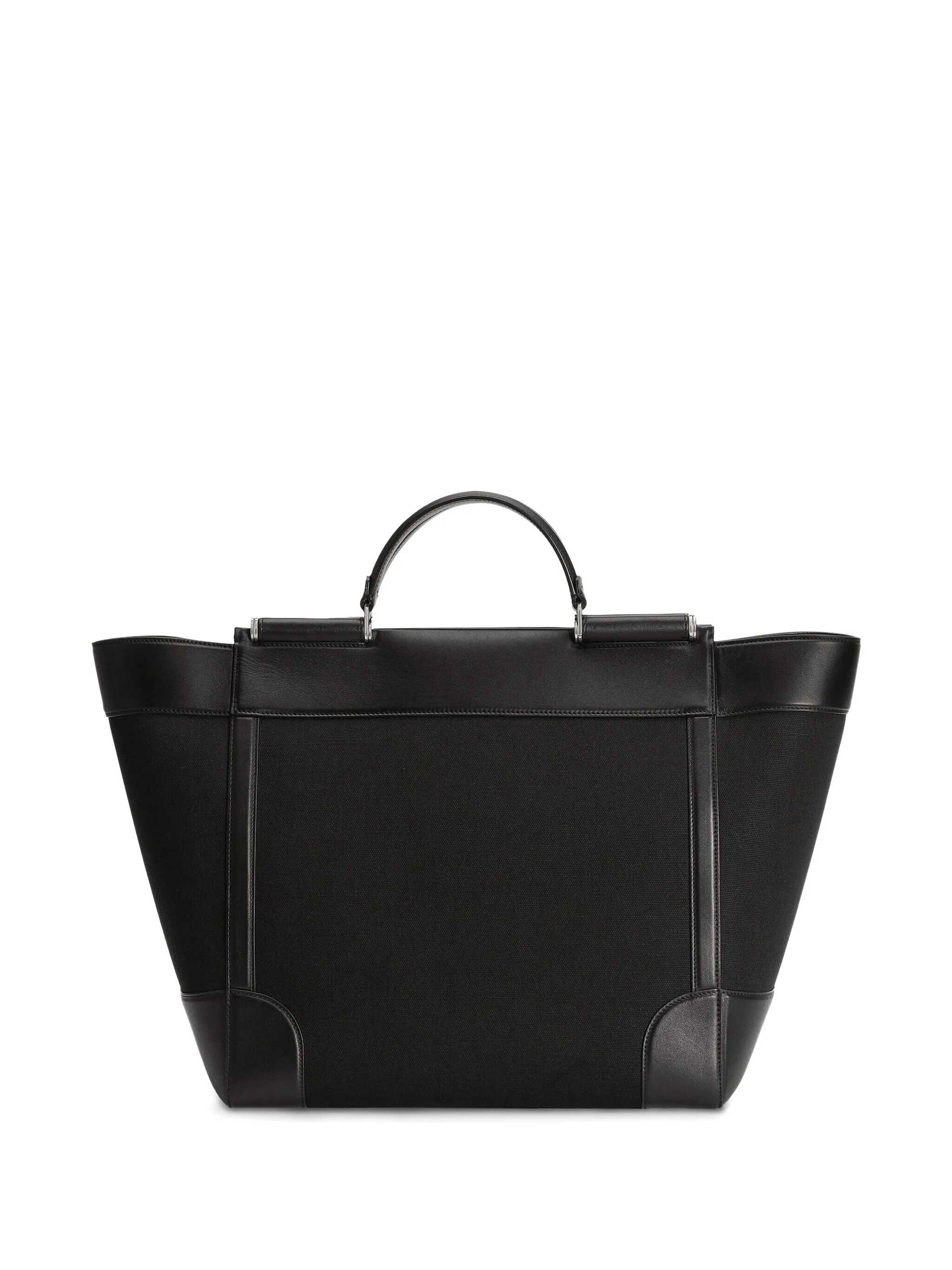 Black Panama and leather top handle bag from Dolce&Gabbana featuring top handle, upper fastening, silver tone hardware, frontal logo, adjustable and removable strap and pocket.