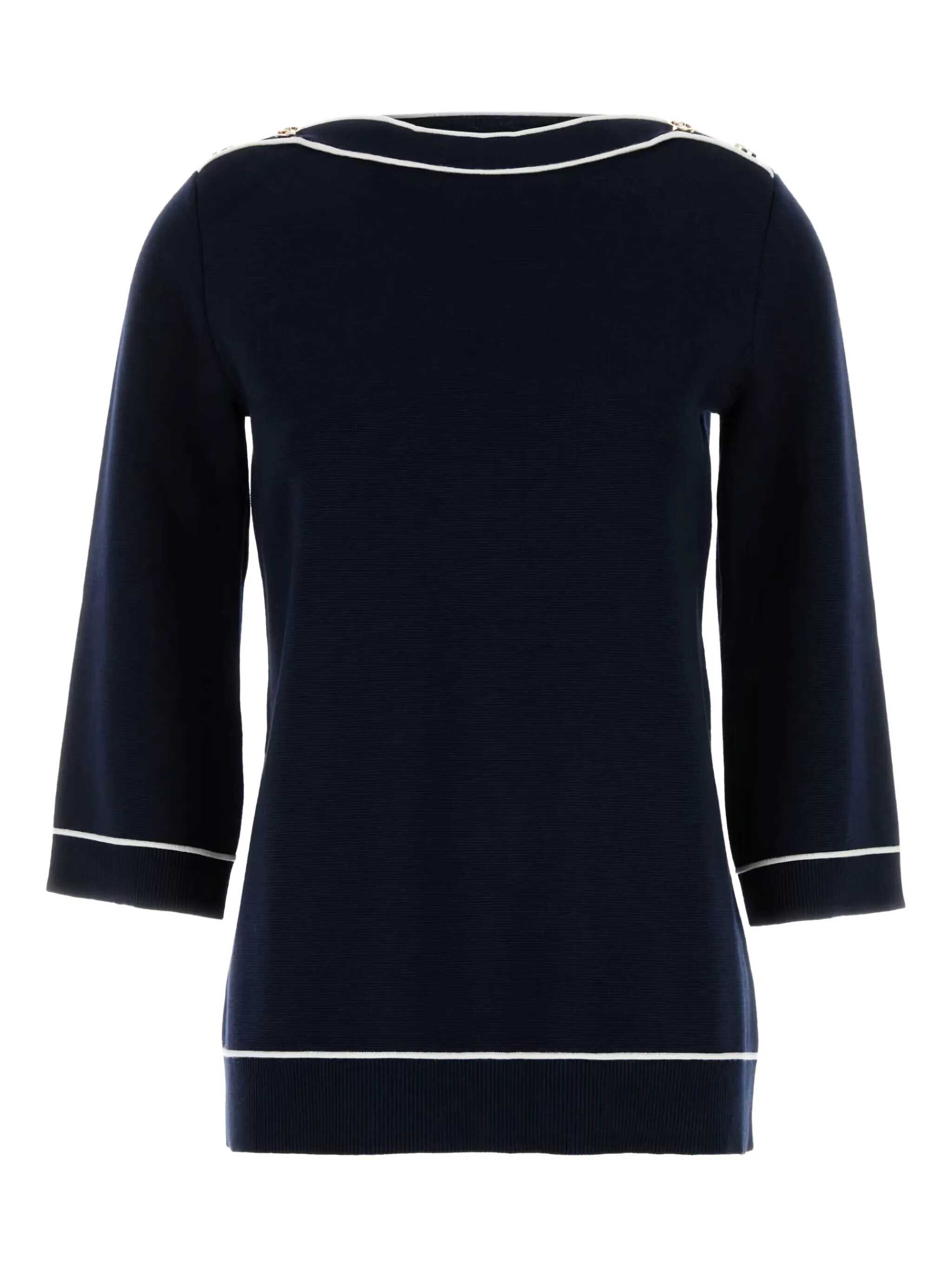 navy blue contrasting trim logo-embossed buttons boat neck three-quarter length sleeves