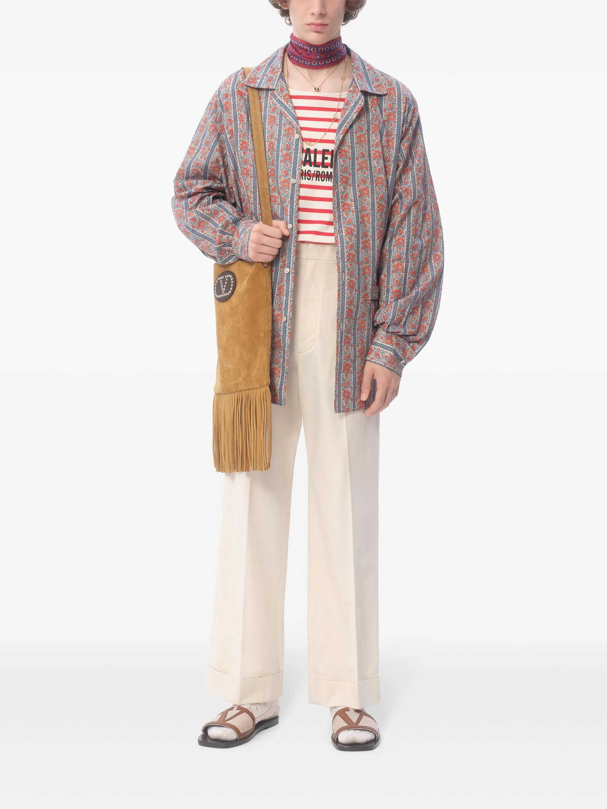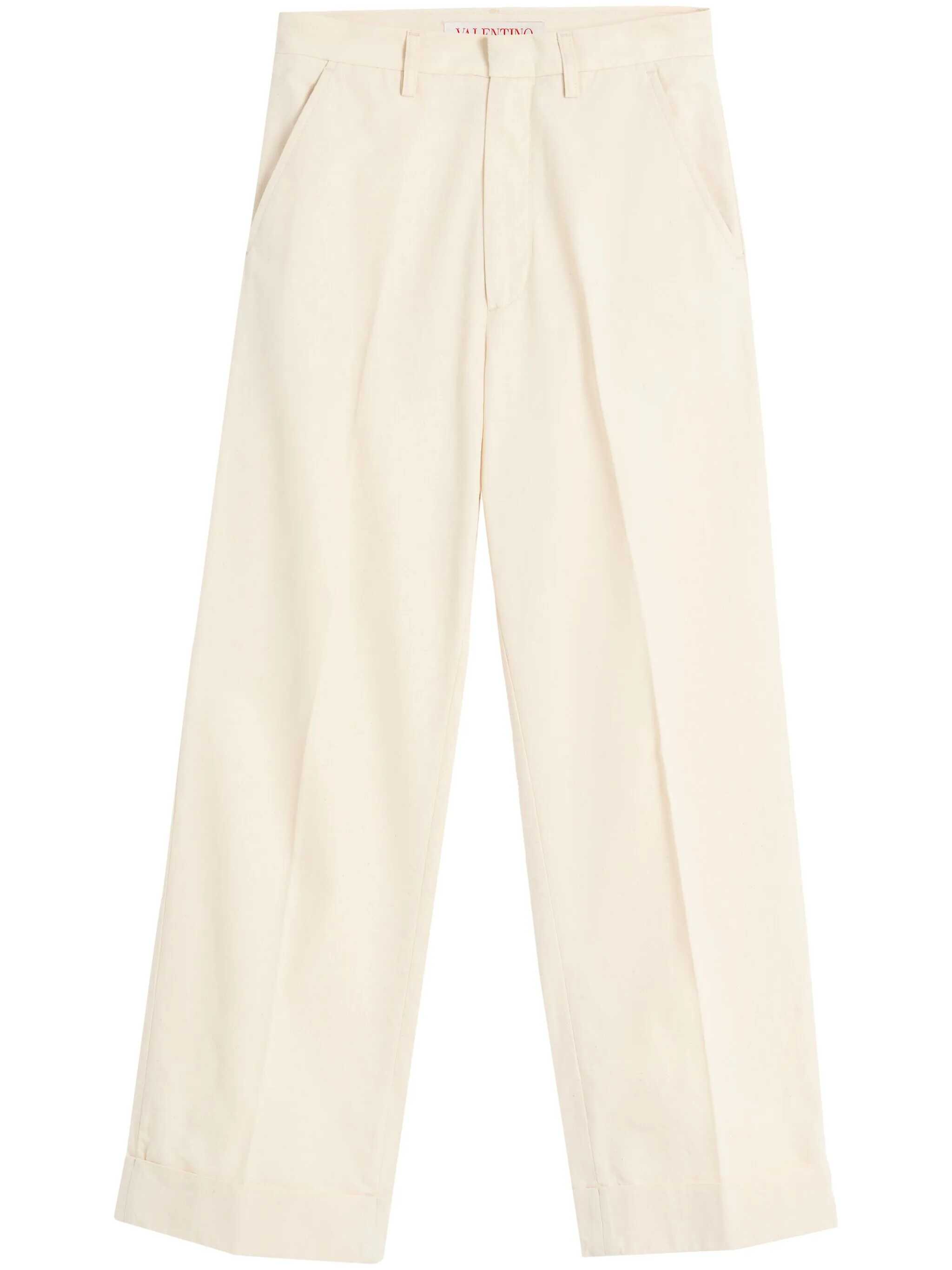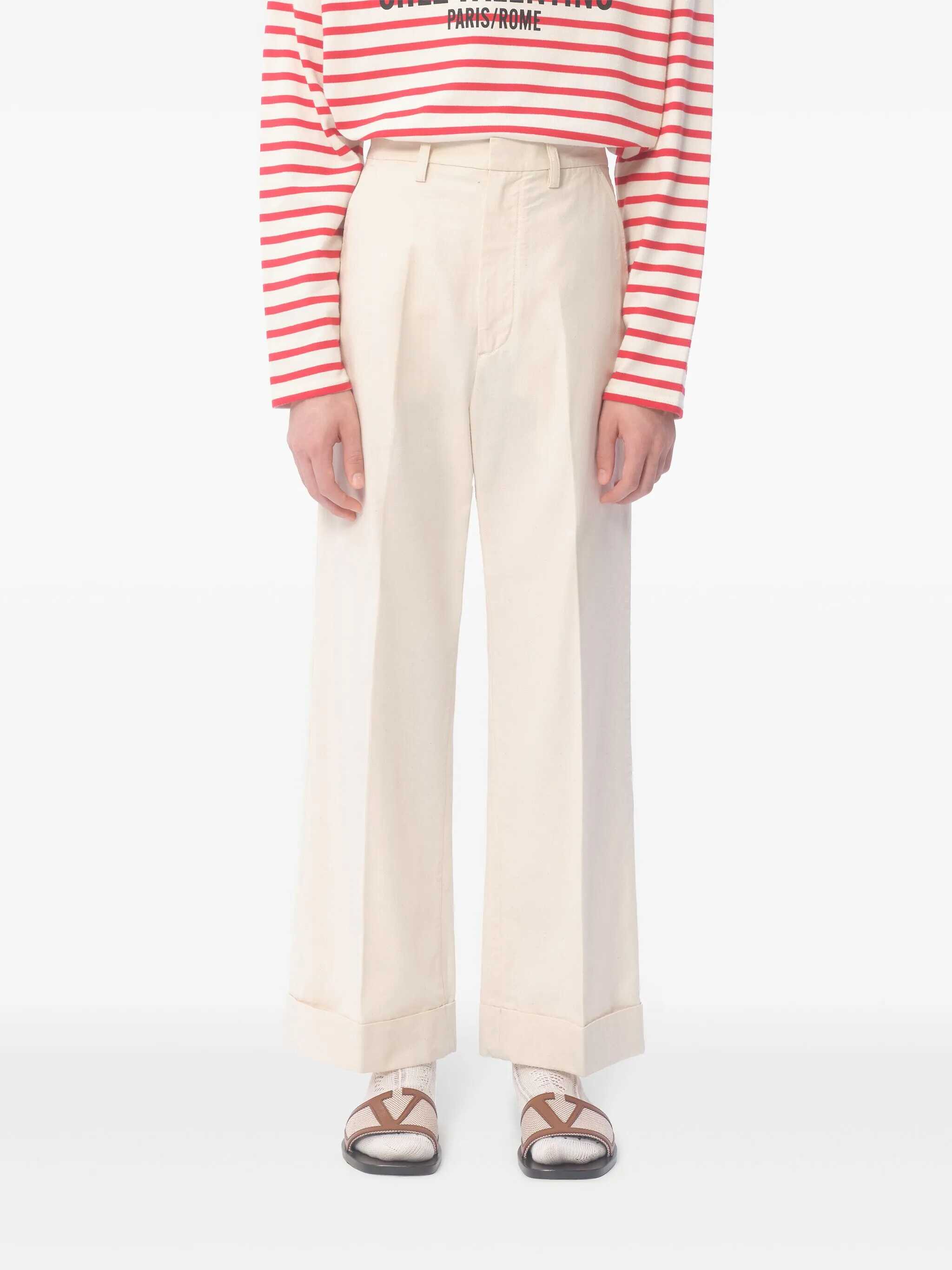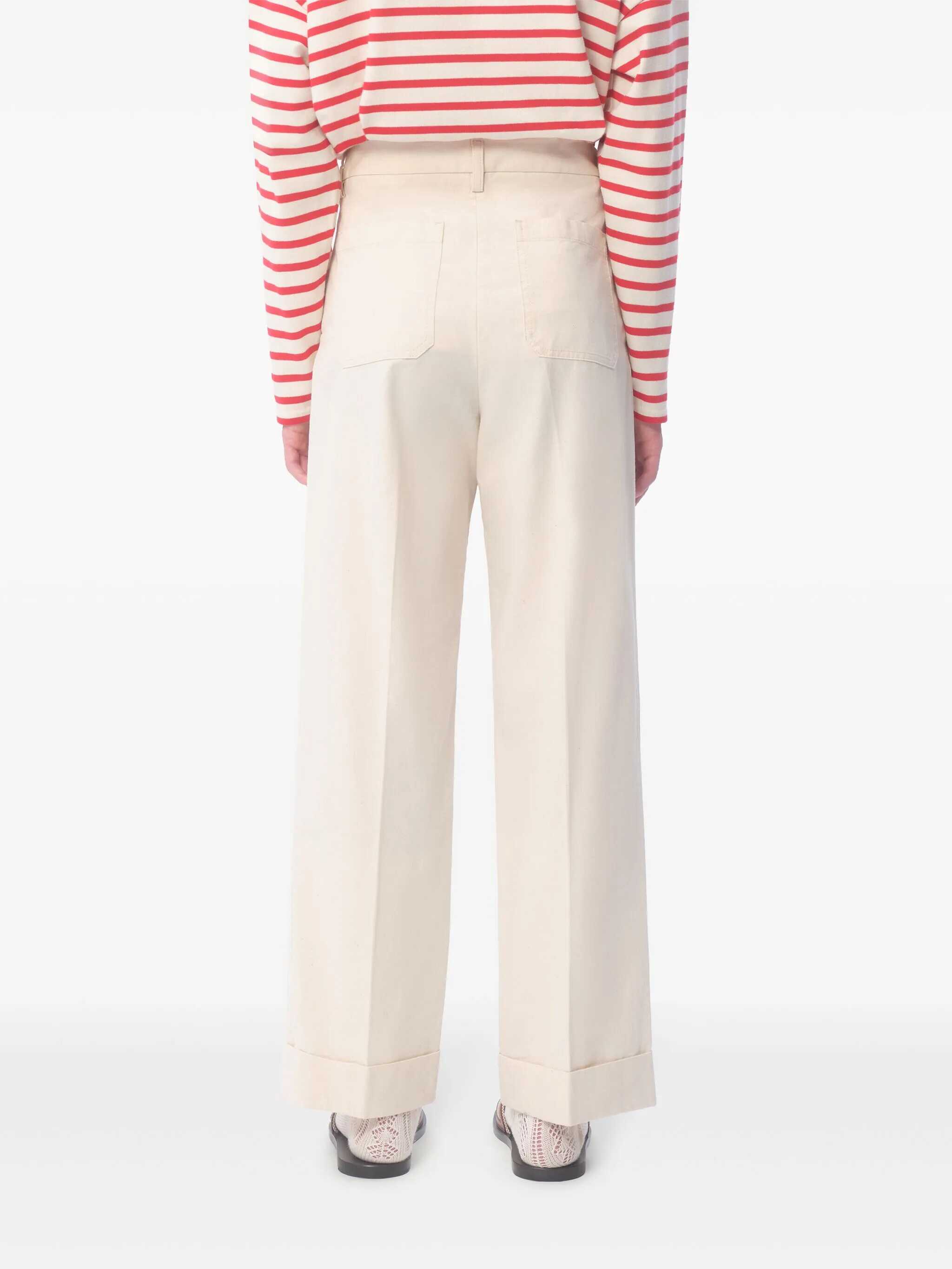 Melange cotton trousers, high waist, zip hook and front button closure, straight leg, stretched crease, pockets, turn-up on the leg bottom