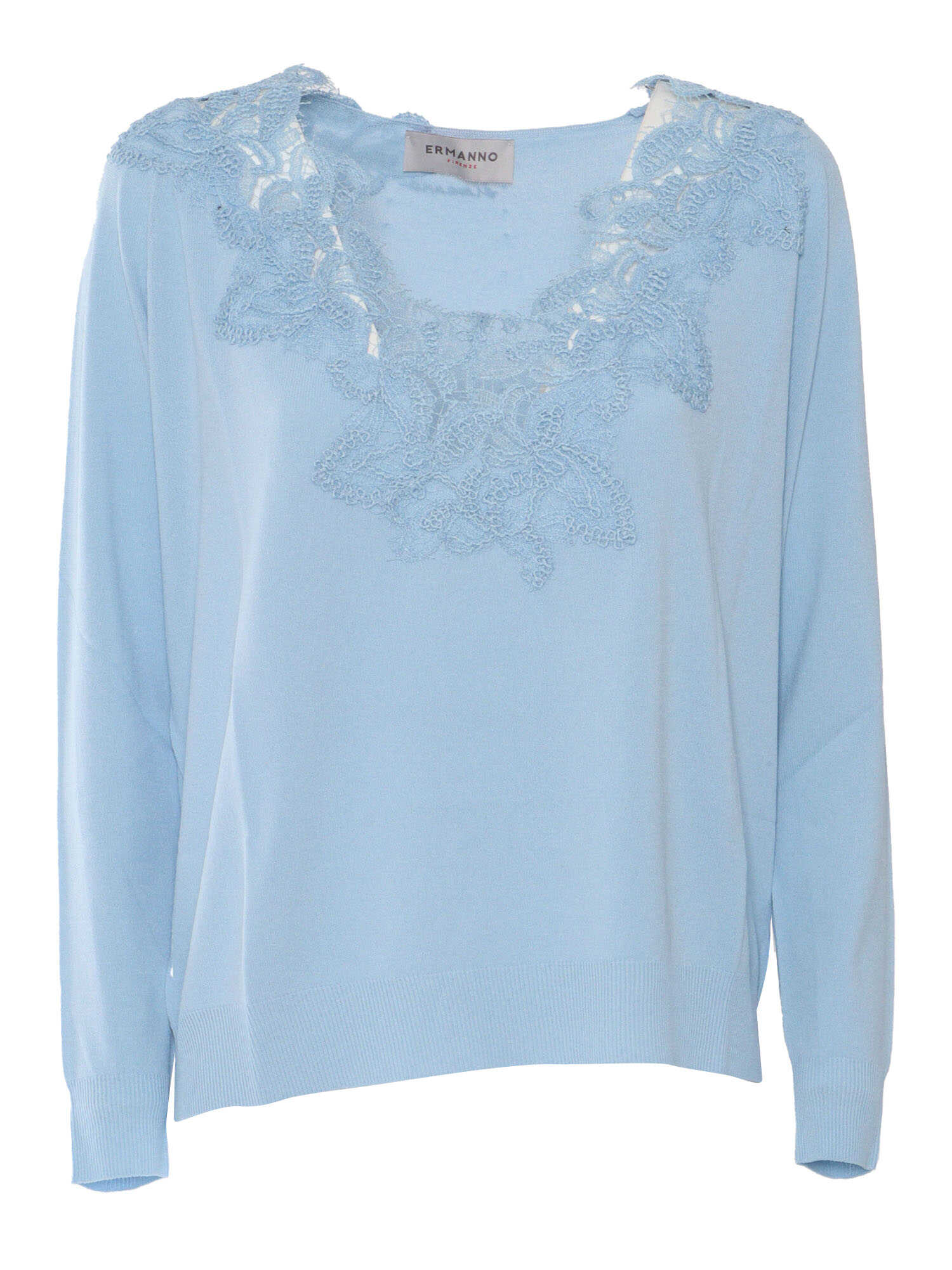 Blue shirt Ermanno Florence in viscose mixed and Poilamide, lace on the neckline, long sleeves.